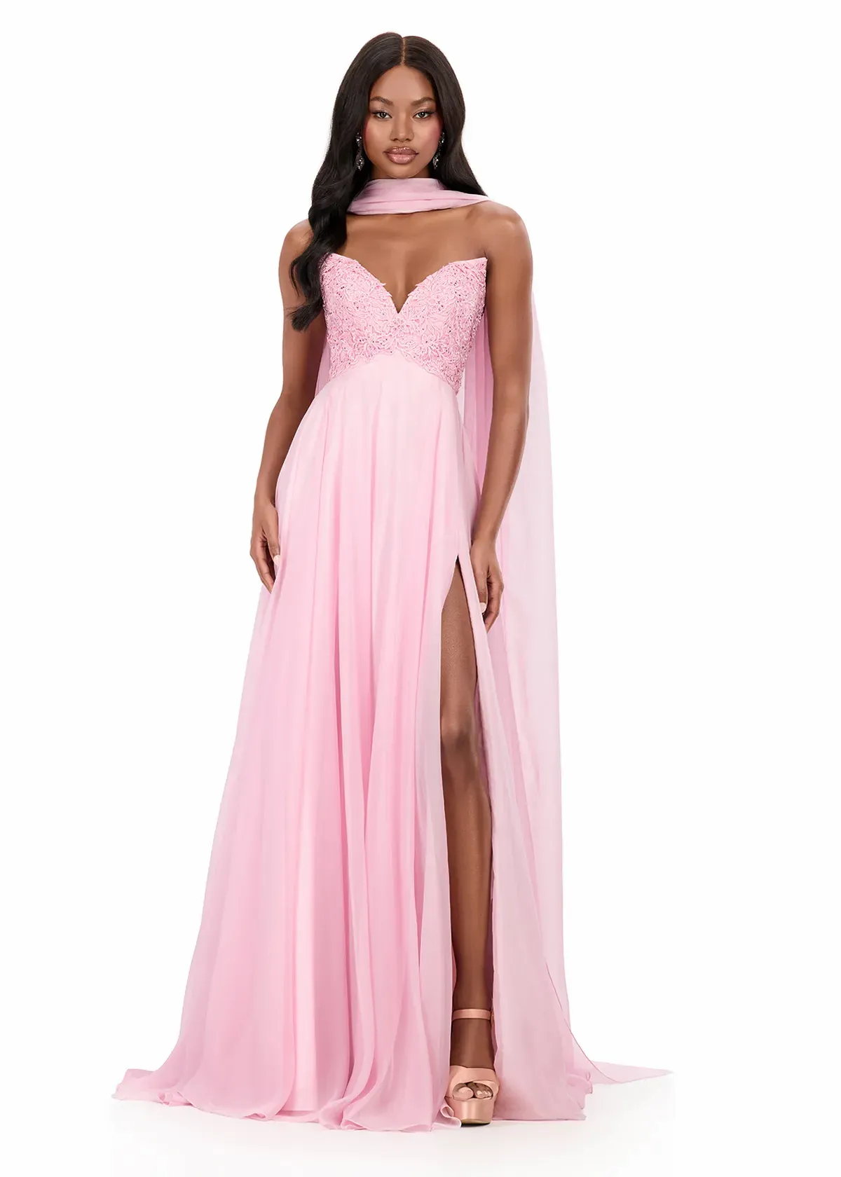 Be light and romantic, in this ASHLEYlauren Style 12258 flowing chiffon gown designed to bring soft elegance to any formal moment. The sweetheart bodice features delicate beading and embellishment that add subtle sparkle, while the dramatic chiffon floats drape from the shoulders to create a cape-like effect with beautiful movement. The A-line skirt cascades gracefully to the floor, delivering a dreamy and refined silhouette.