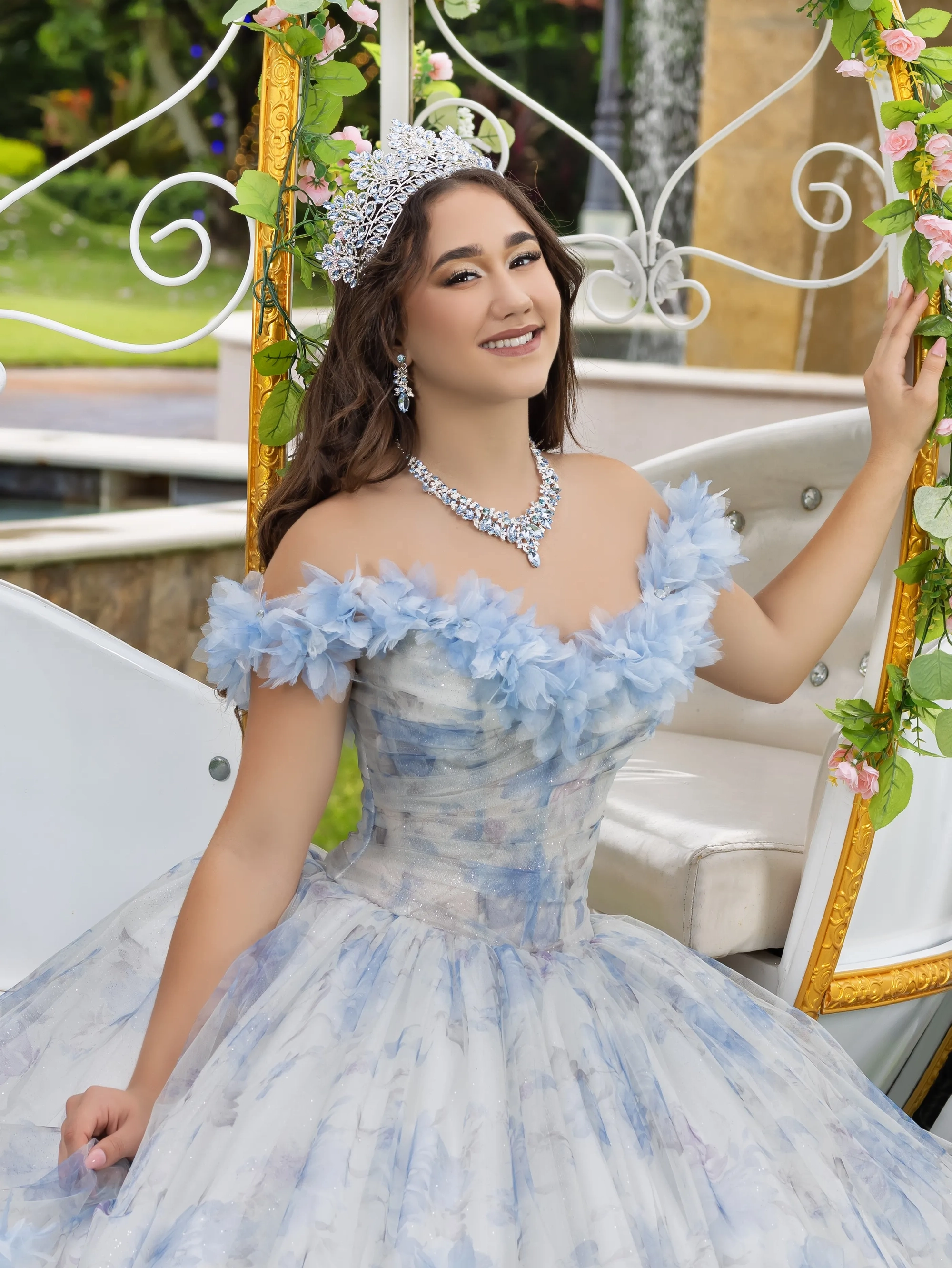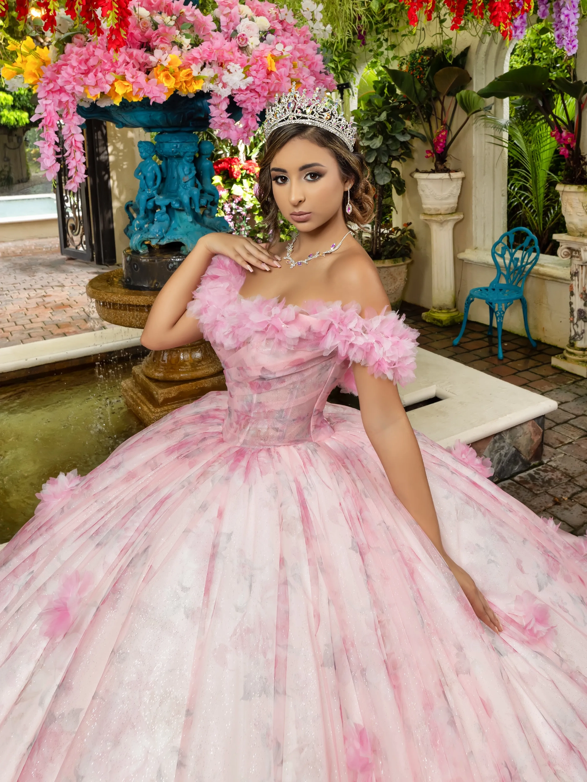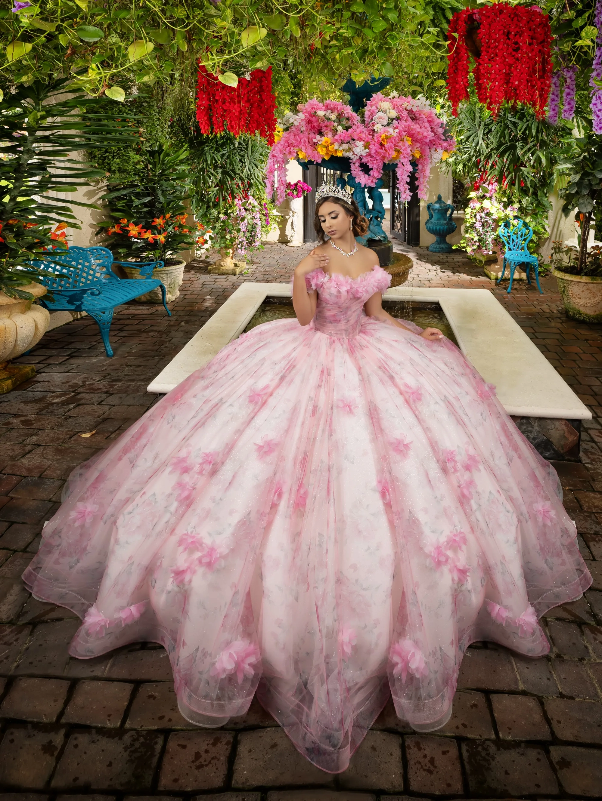 This spectacular Quinceanera ball gown was inspired by the ladies of Bridgerton. Featuring an original house floral print this gown is the perfect flower fantasy. Delicate handmade flowers are added around the sweetheart neckline and draped around the shoulders for a touch of delicate elegance. Three dimensional flowers are all around the skirt to create a unique texture and balance.