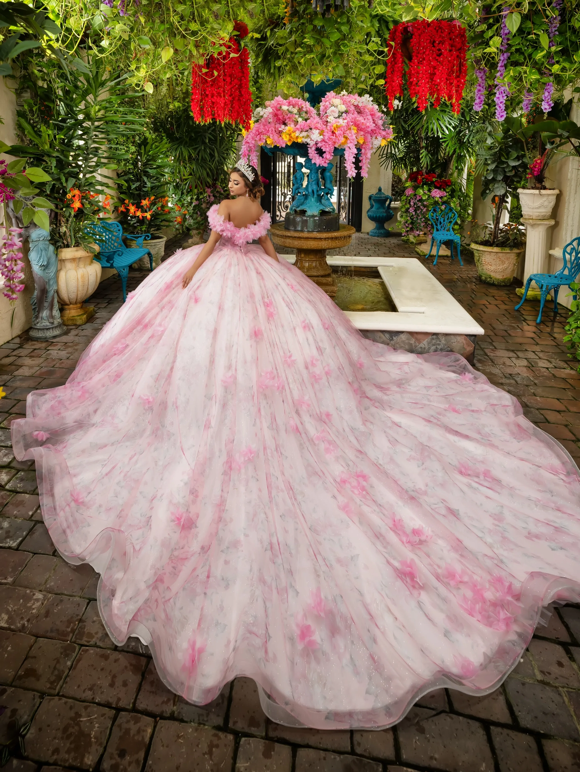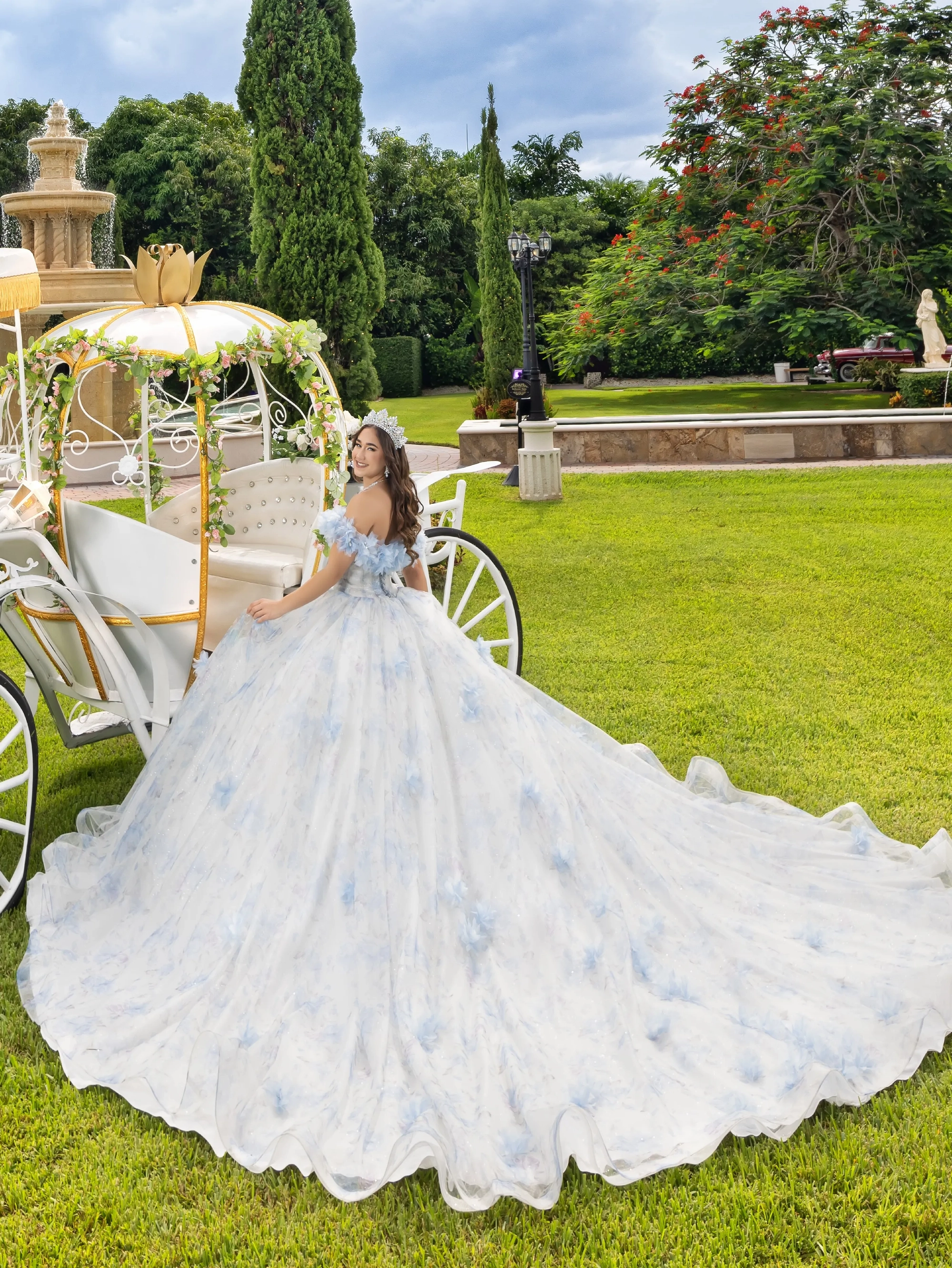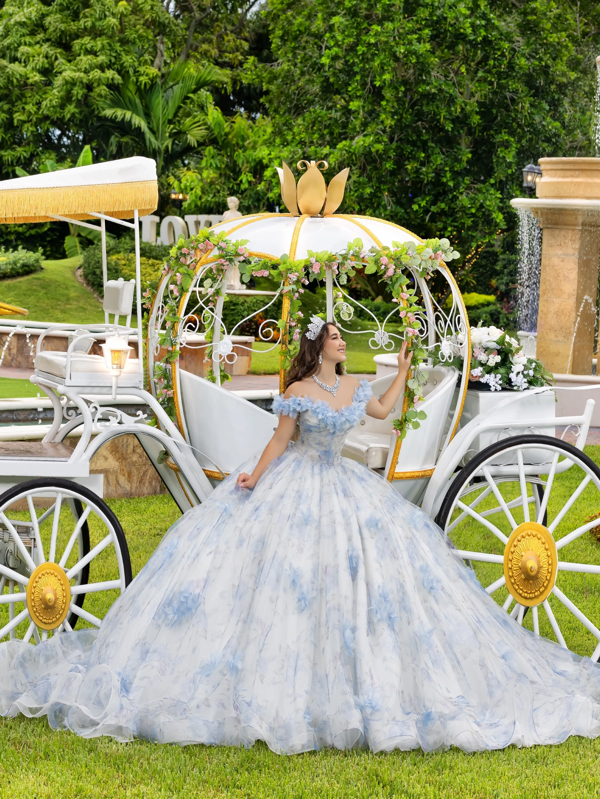 This spectacular Quinceanera ball gown was inspired by the ladies of Bridgerton. Featuring an original house floral print this gown is the perfect flower fantasy. Delicate handmade flowers are added around the sweetheart neckline and draped around the shoulders for a touch of delicate elegance. Three dimensional flowers are all around the skirt to create a unique texture and balance.