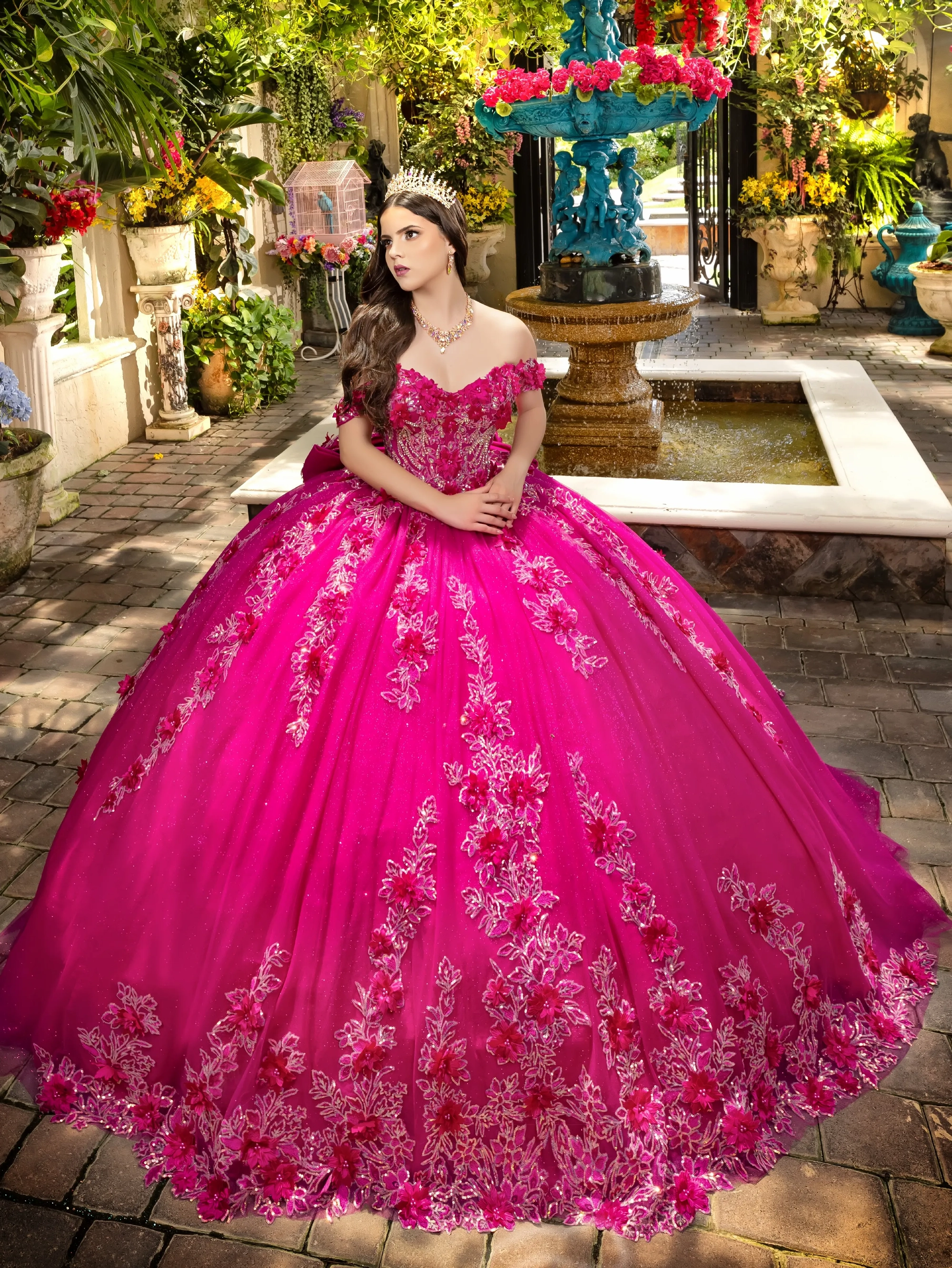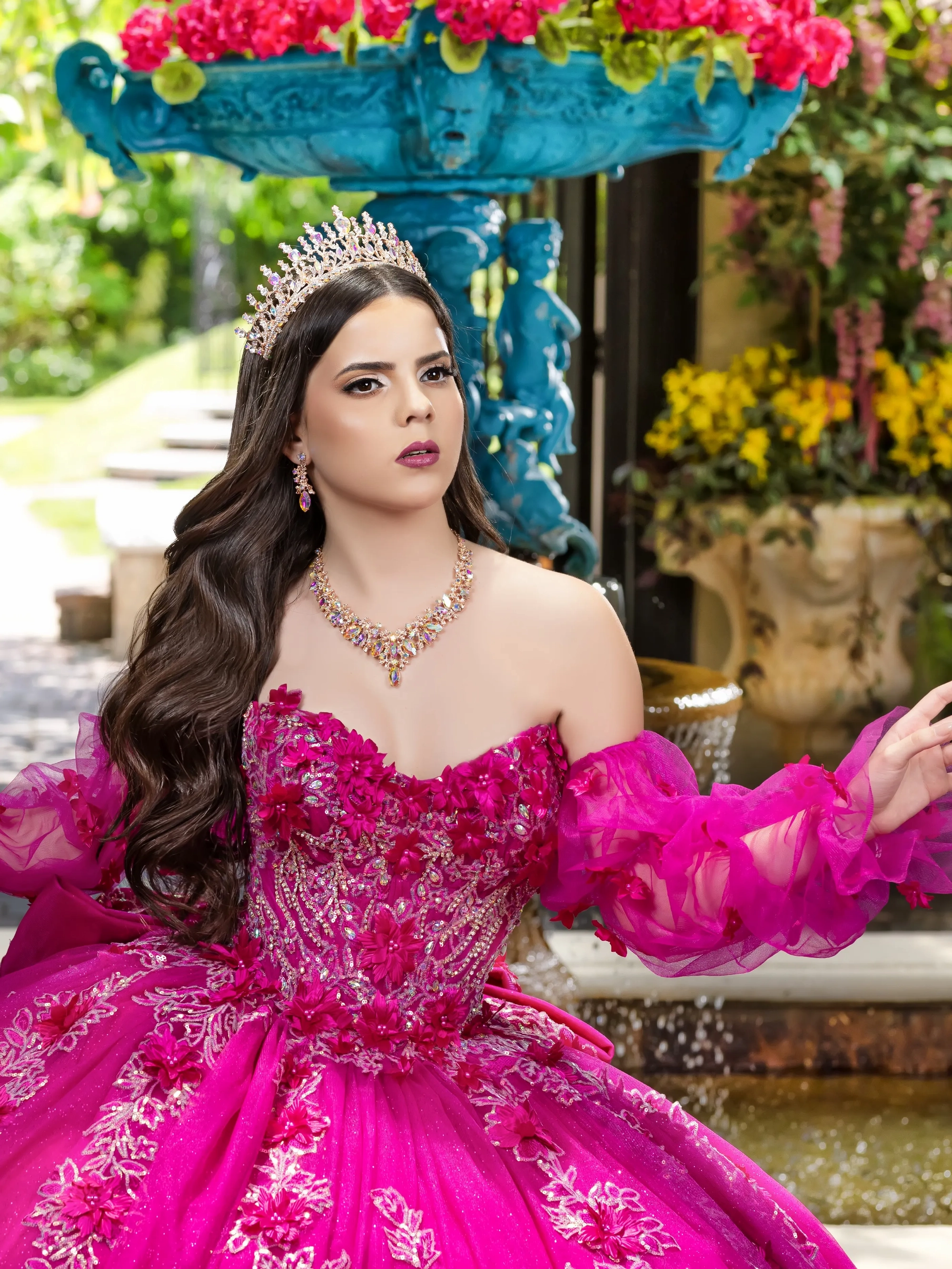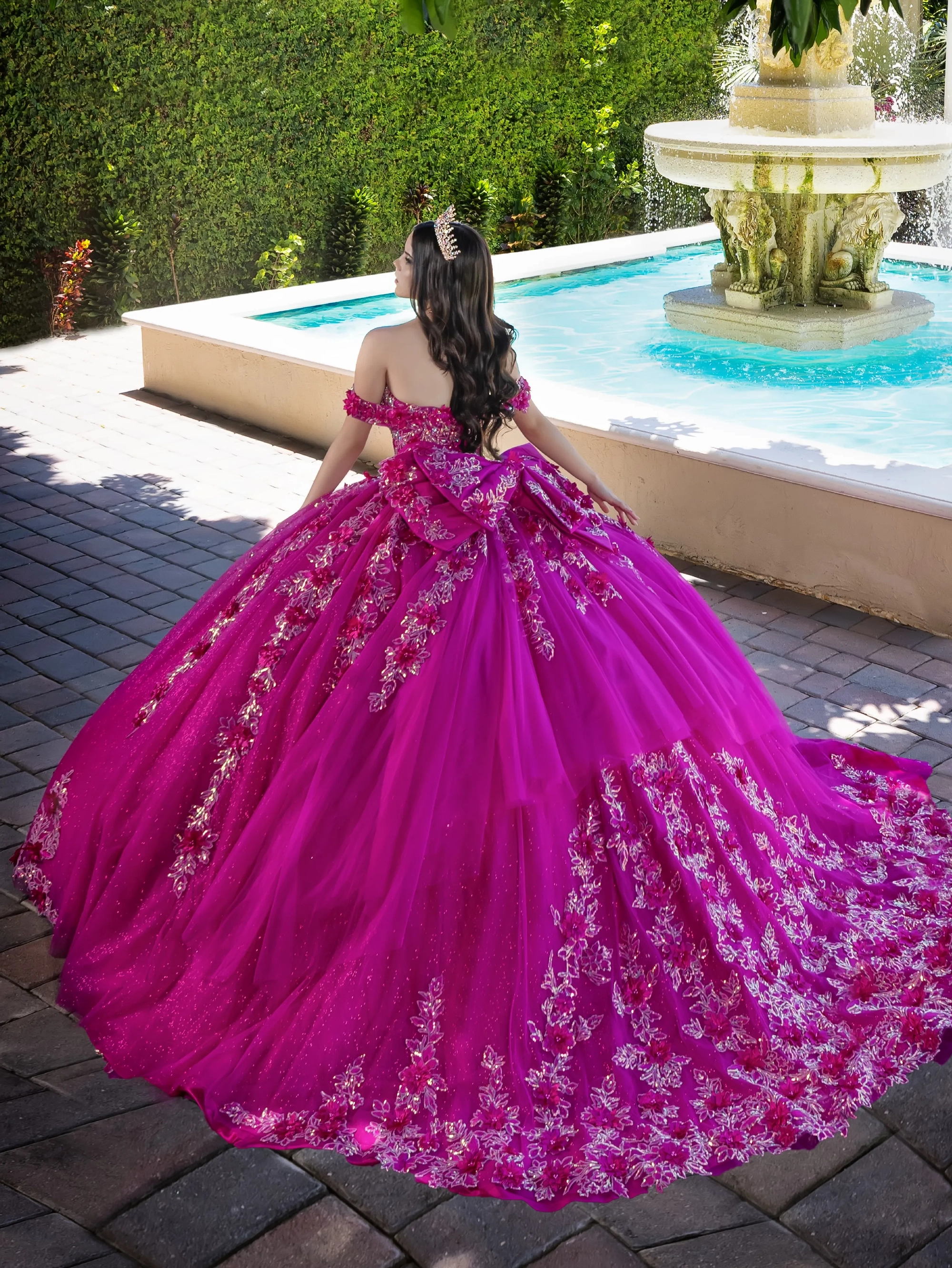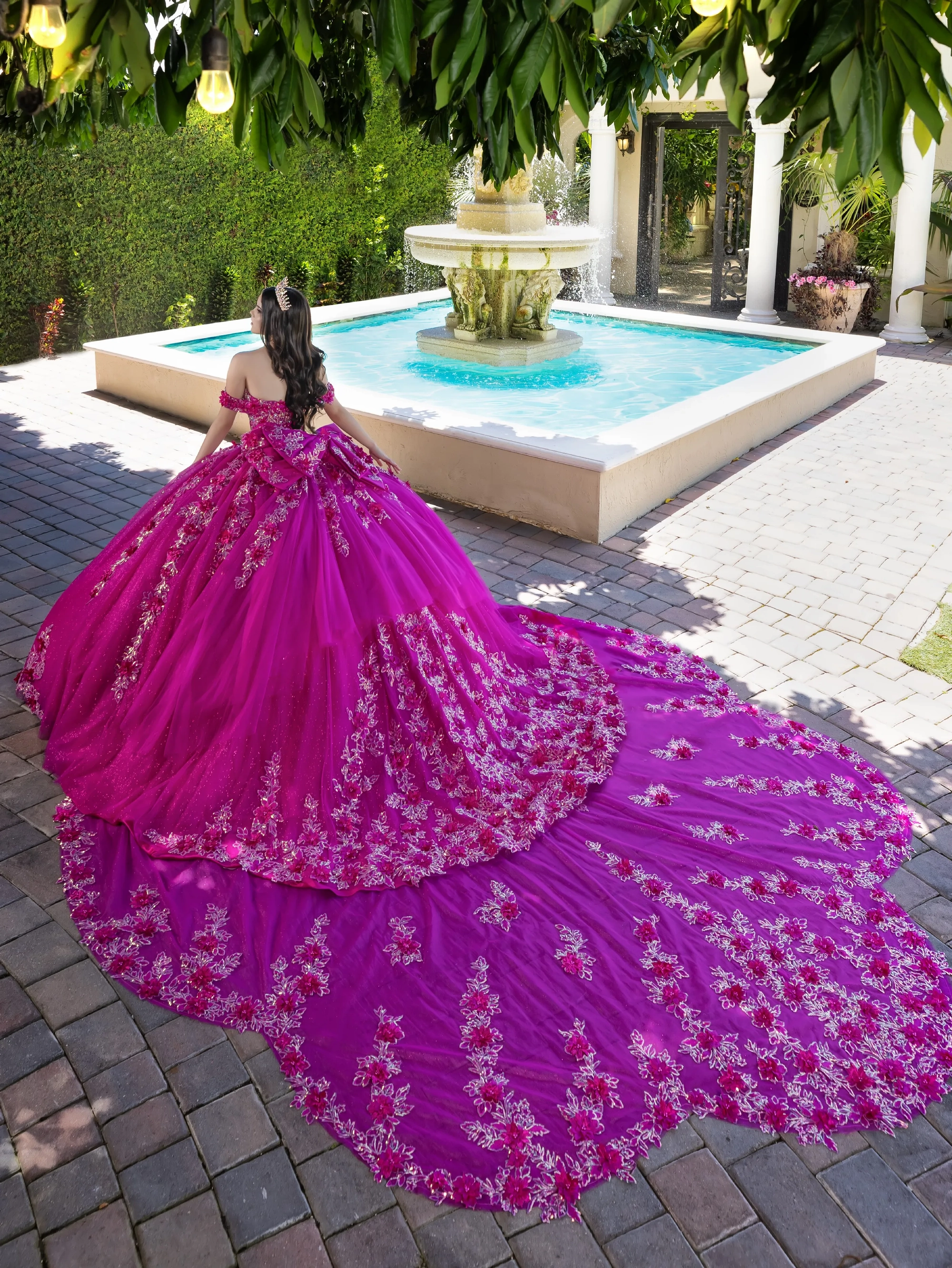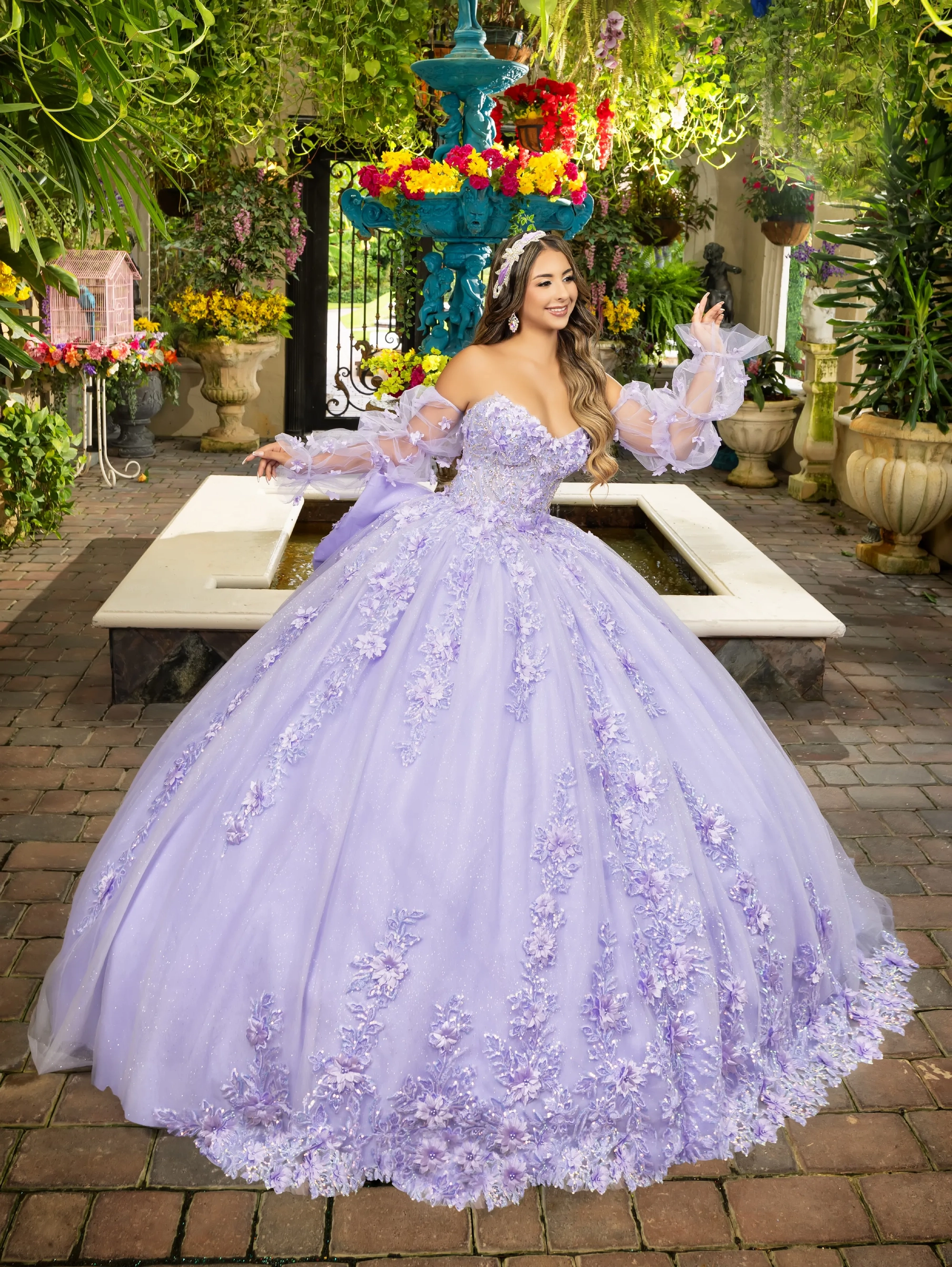 Gorgeous quinceañera ball gown features a soft sweetheart neckline bodice with delicate crystal beaded embroidered lace accenting the sweetheart neckline and Basque waist. Three dimensional flowers are added to create texture and glamour. Detachable sheer multi-layered sleeves and a fun flair to the dress. The full sparkling royal skirt adds a moment of elegance. The back of this dress features a corseted back, a double layer bow, a stunning asymmetrical tulle cascade and a scallop sheer train.