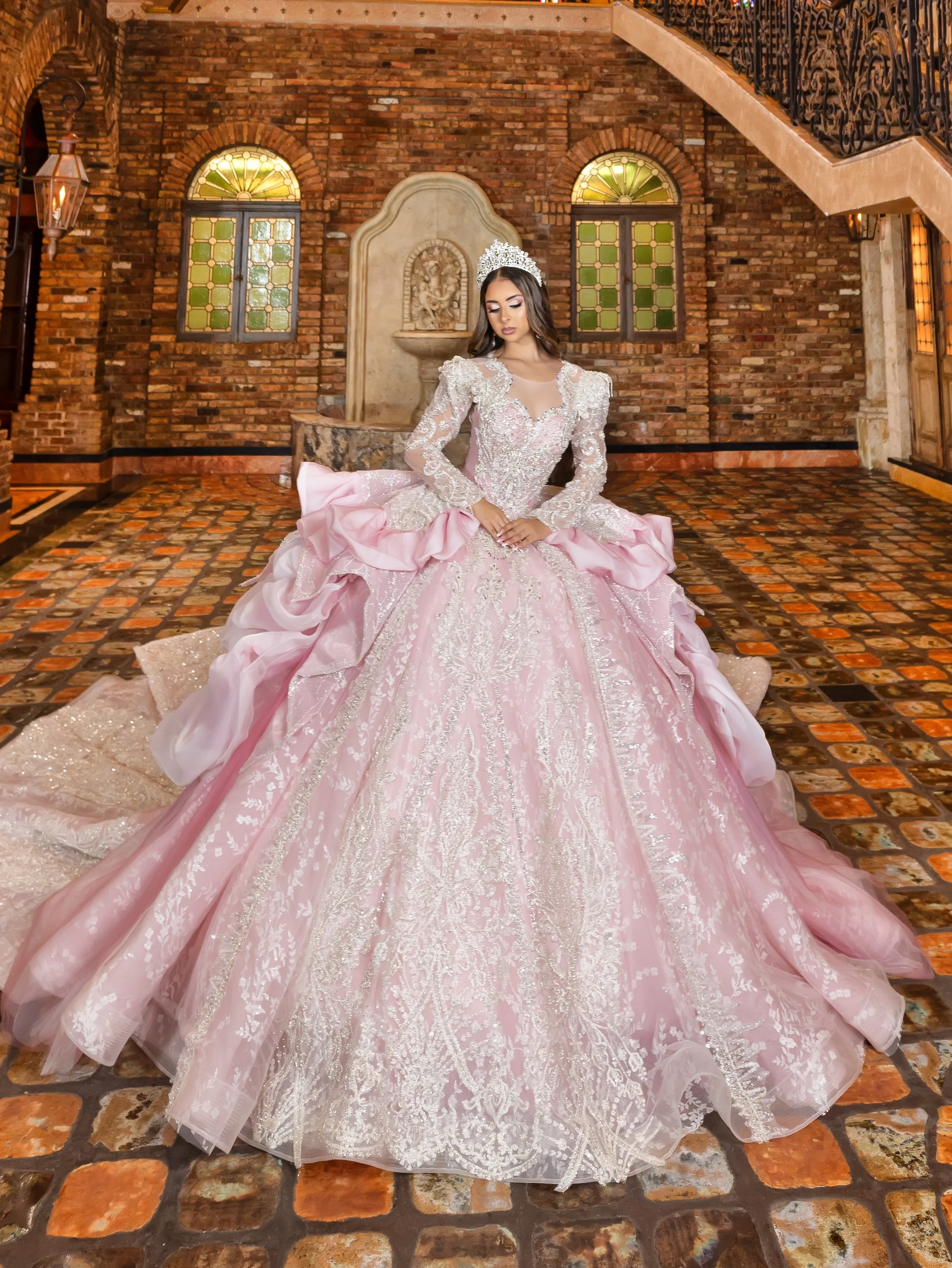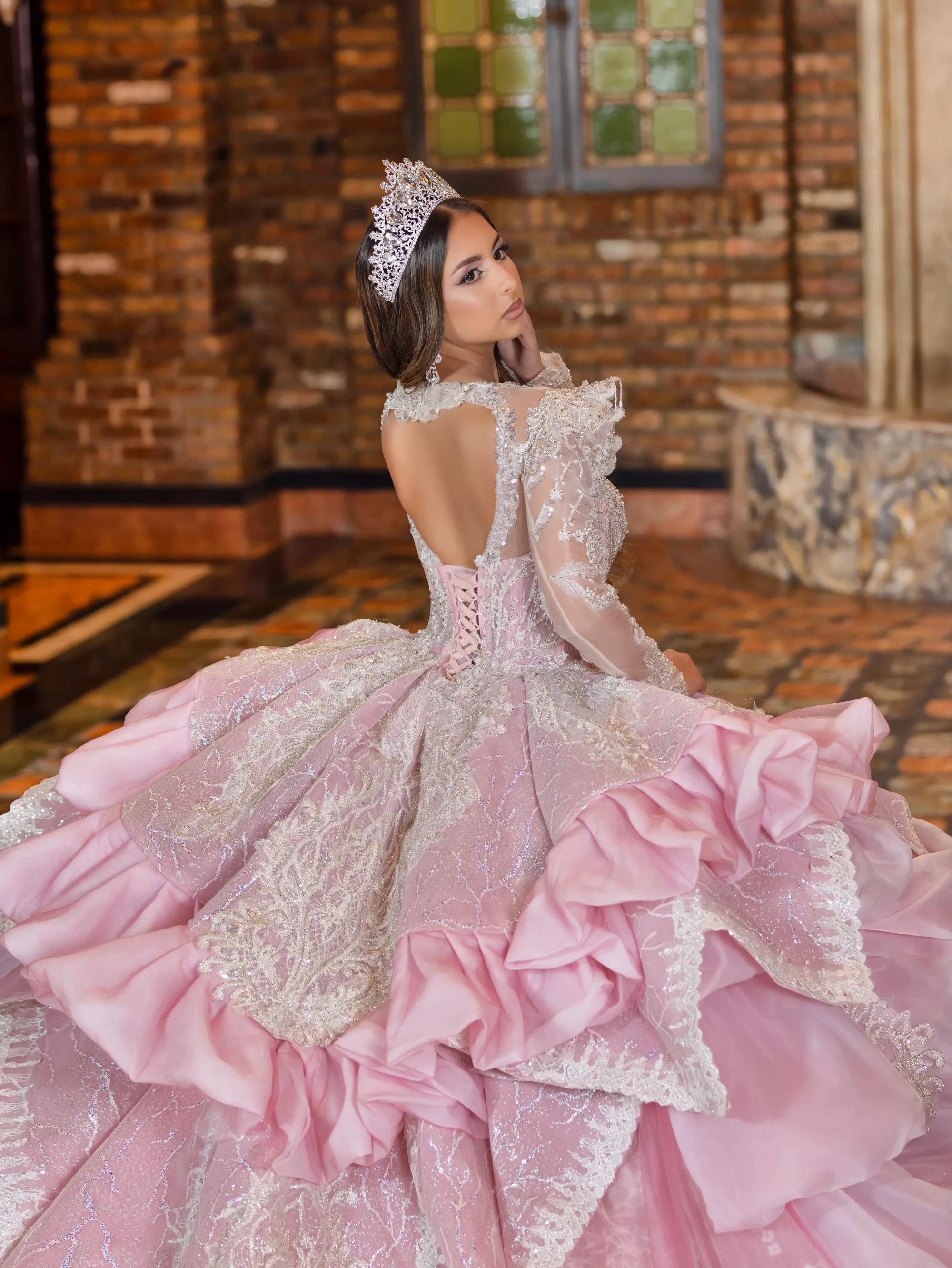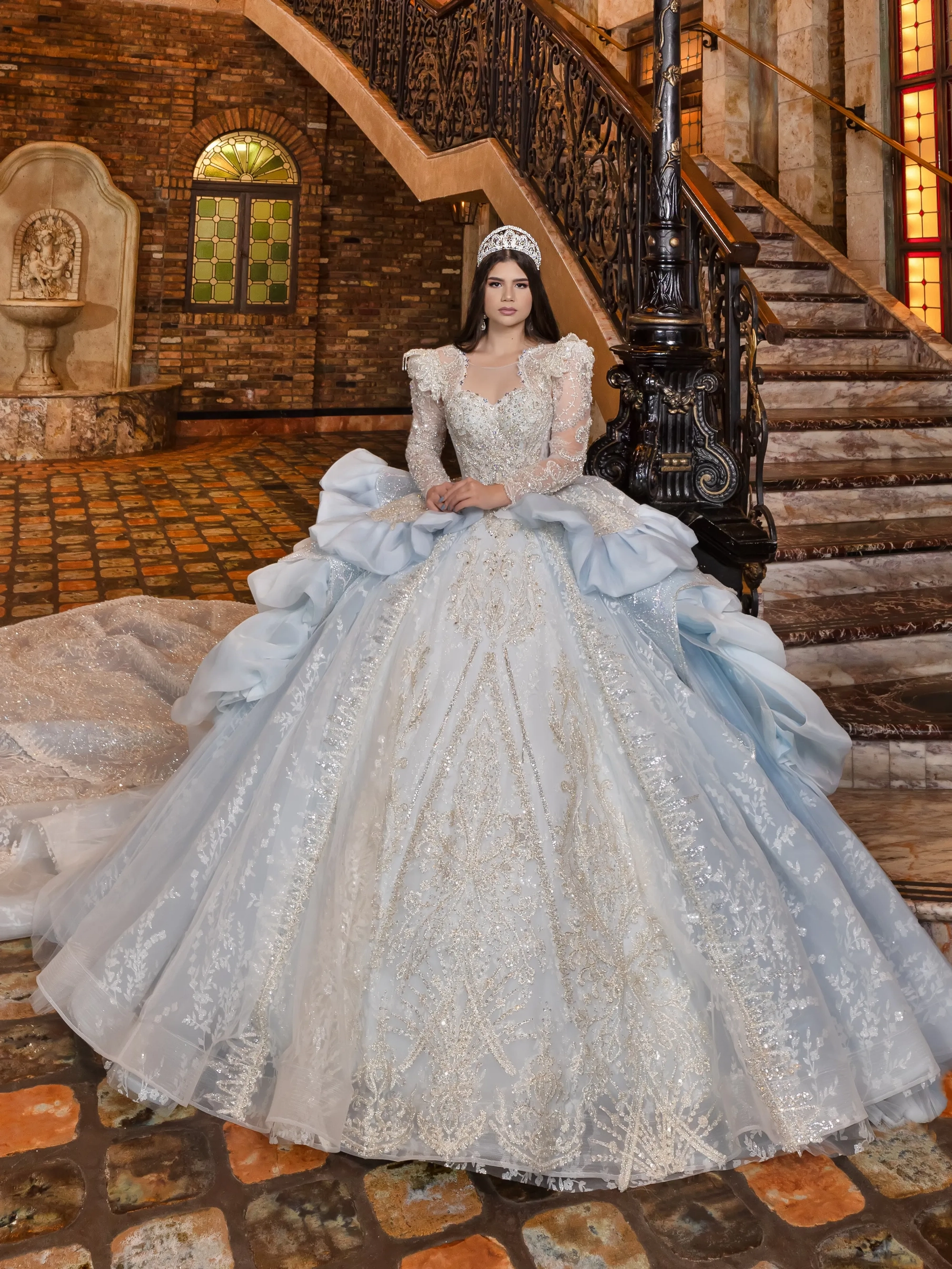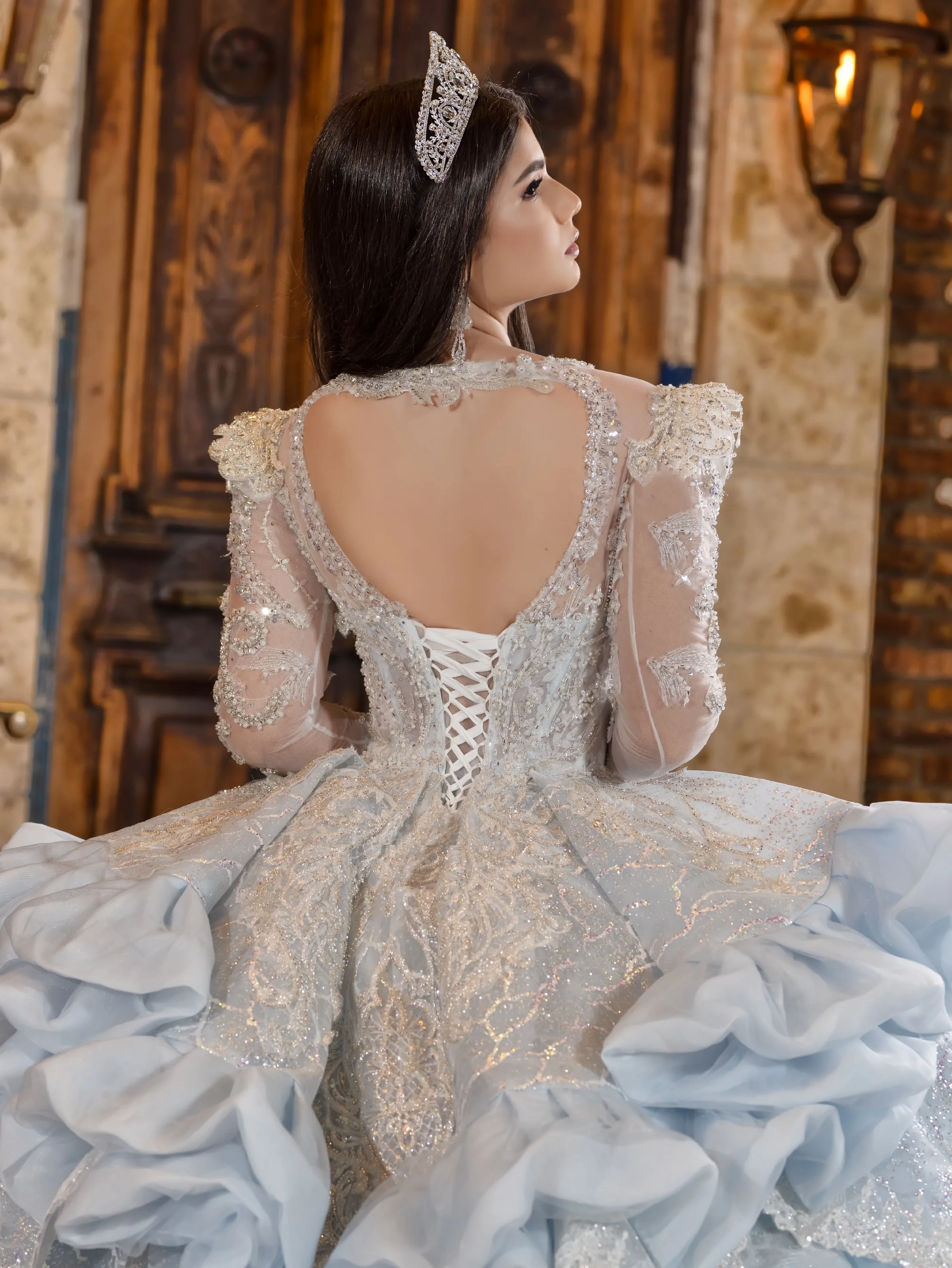 This Quince gown takes its inspiration from haute couture and is fit for a queen. The bodice and neckline are adorned with crystal beaded lace applique. The shoulder sleeves are raised to create structured shape. The gown features removable crystal-beaded sheer long sleeves. The waist is layered with a bubble skirt that drapes into a peplum top layer. The ball gown skirt is decorated with crystal beaded applique. To complete the look, a royal train is added and shaped into a triangular finishing edge.