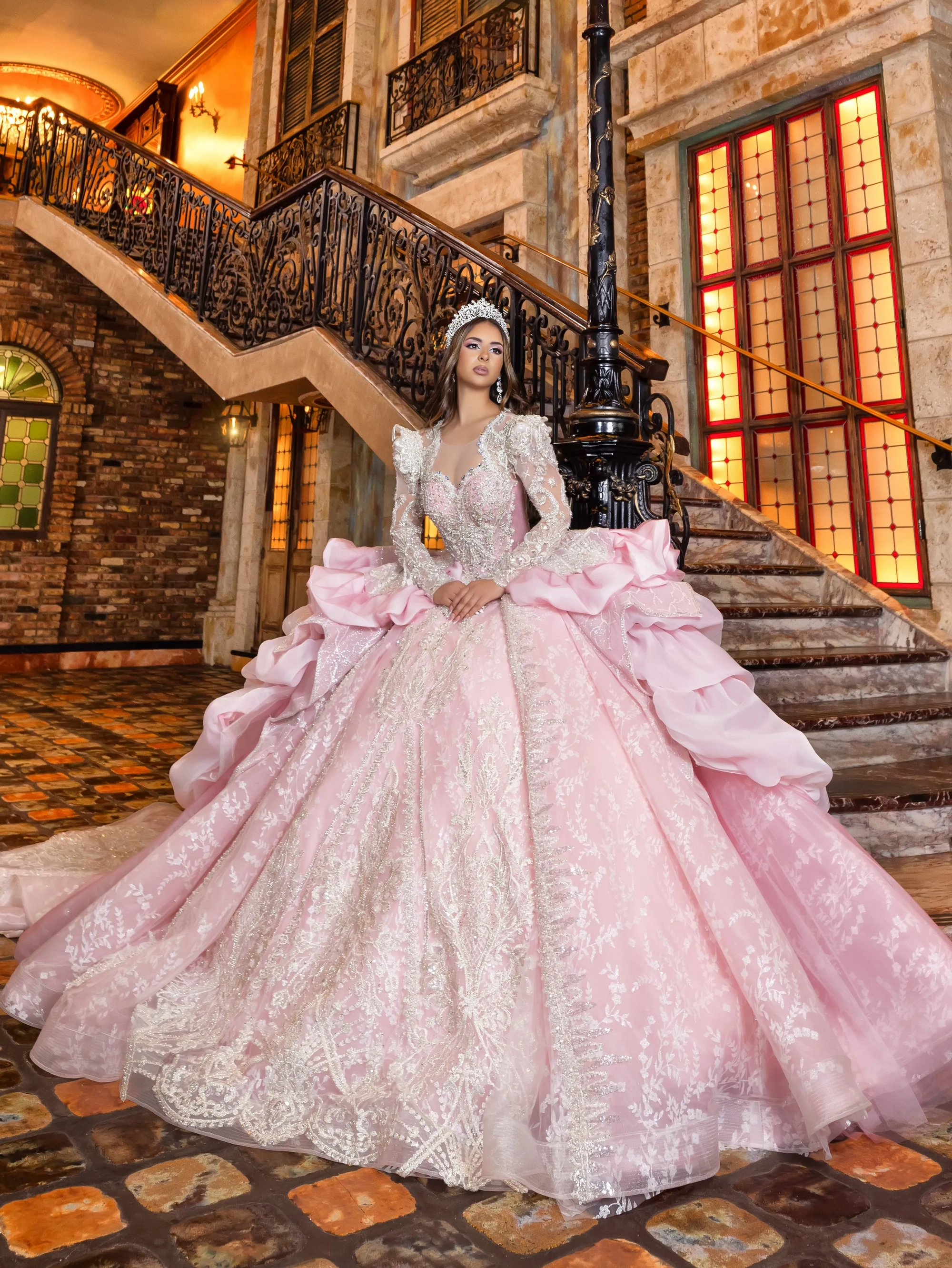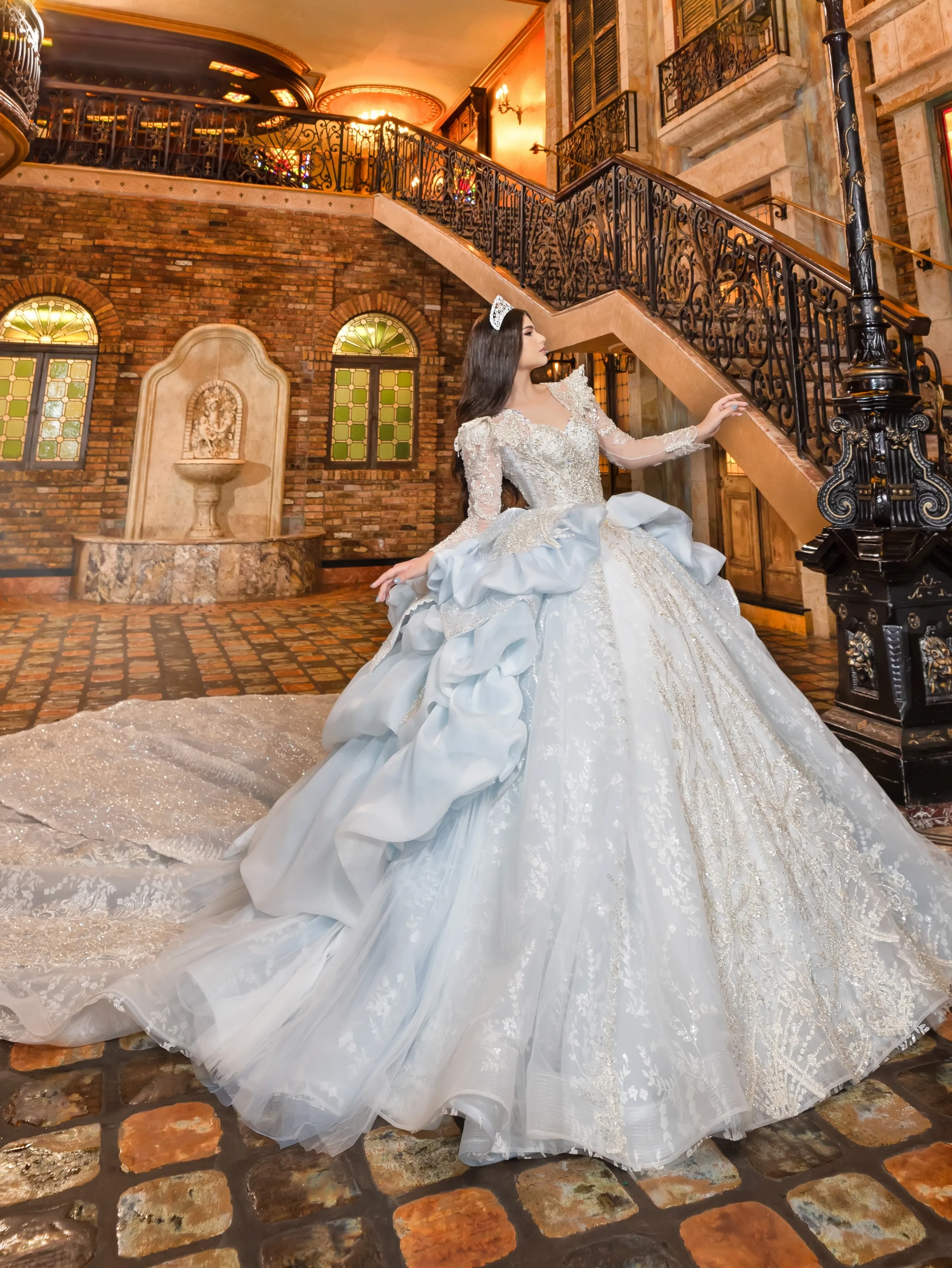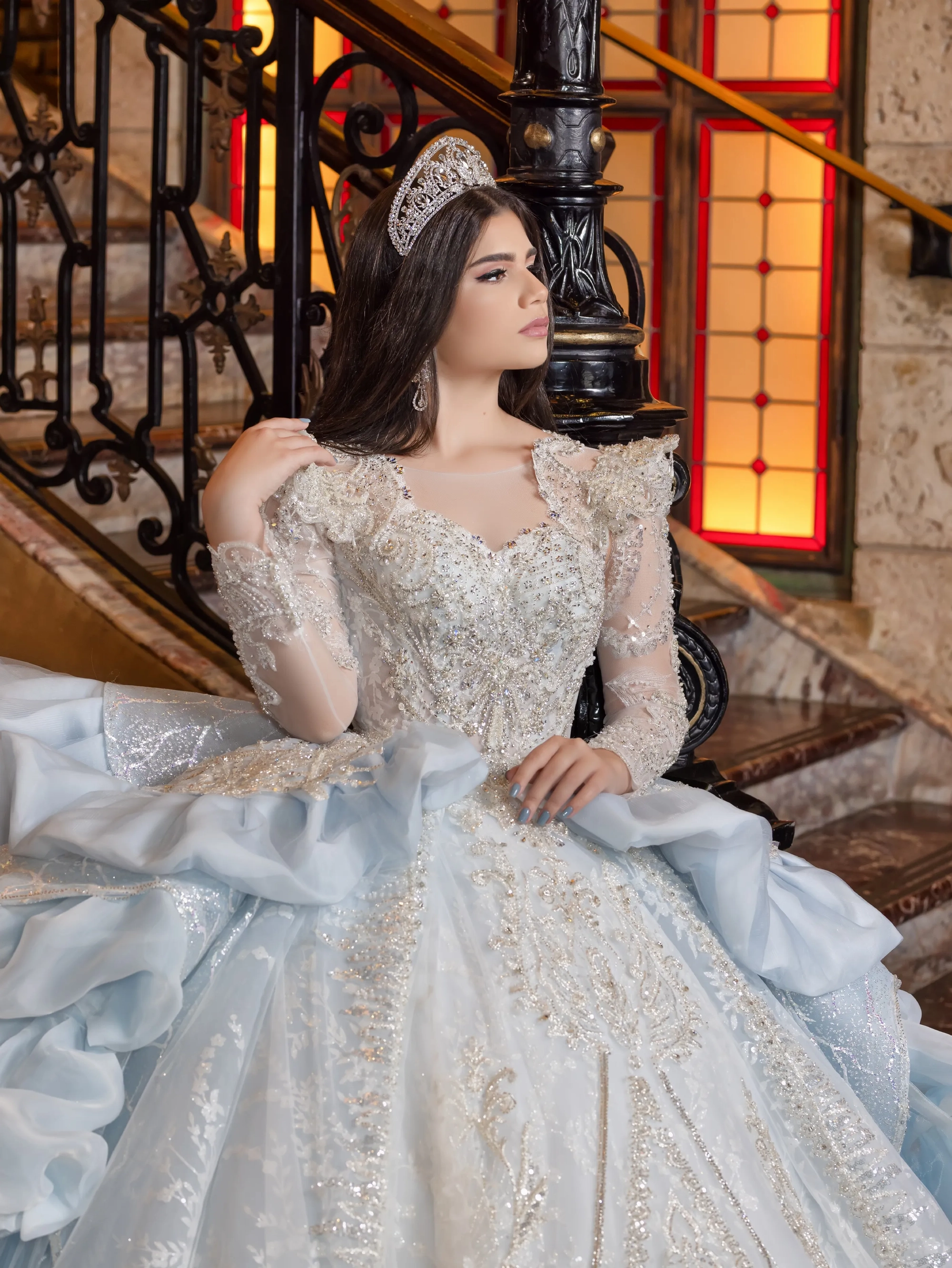This Quince gown takes its inspiration from haute couture and is fit for a queen. The bodice and neckline are adorned with crystal beaded lace applique. The shoulder sleeves are raised to create structured shape. The gown features removable crystal-beaded sheer long sleeves. The waist is layered with a bubble skirt that drapes into a peplum top layer. The ball gown skirt is decorated with crystal beaded applique. To complete the look, a royal train is added and shaped into a triangular finishing edge.