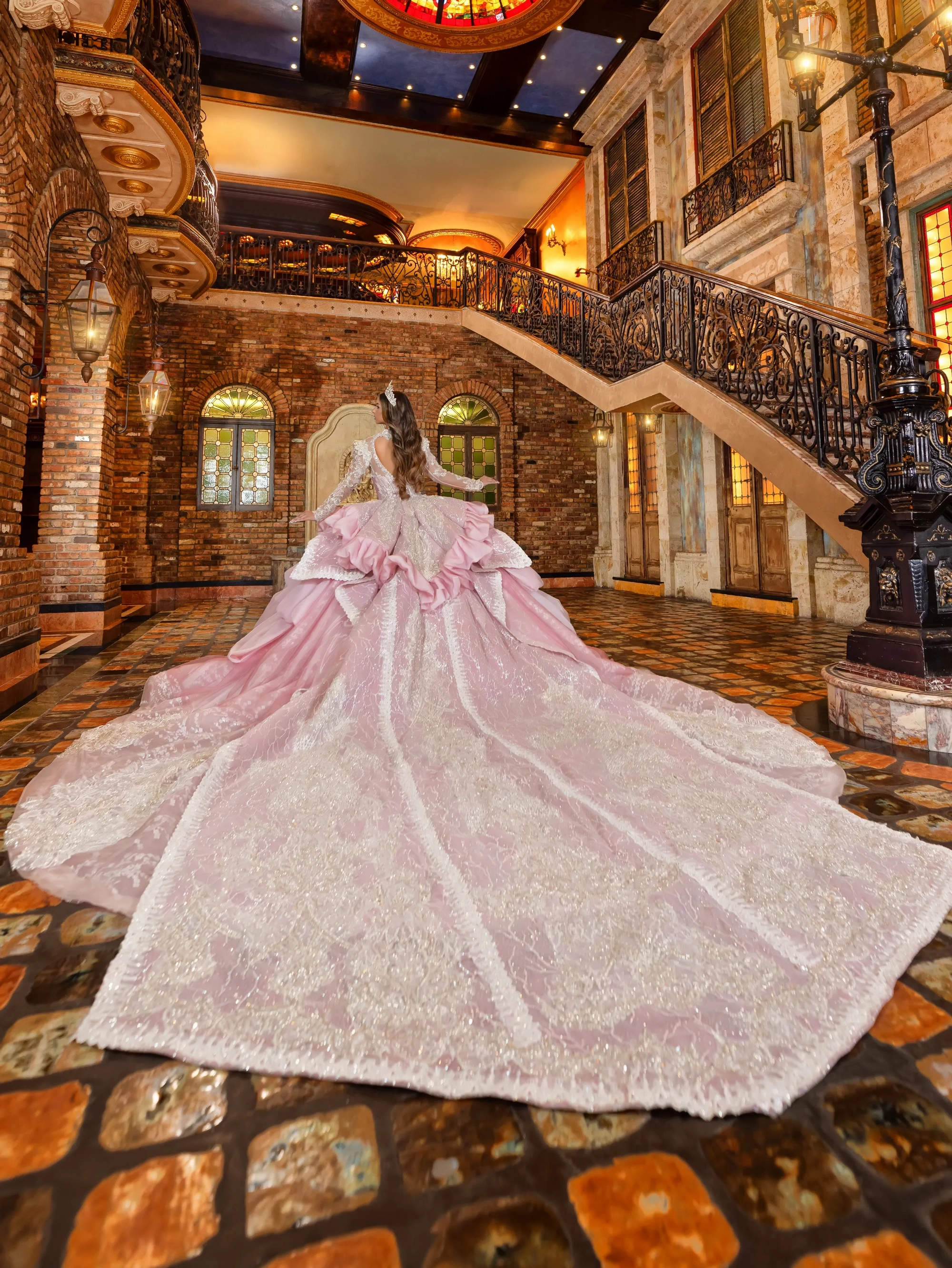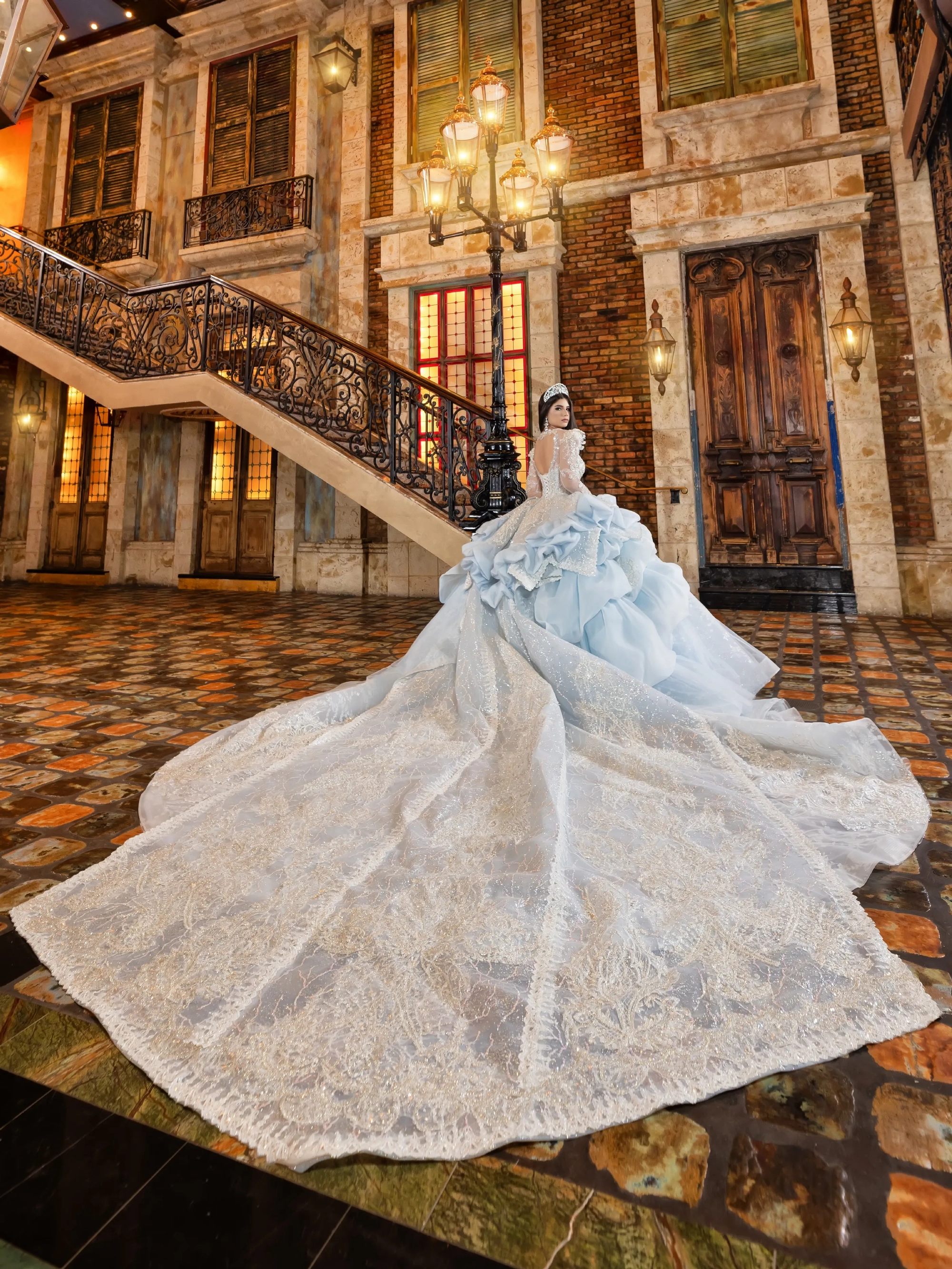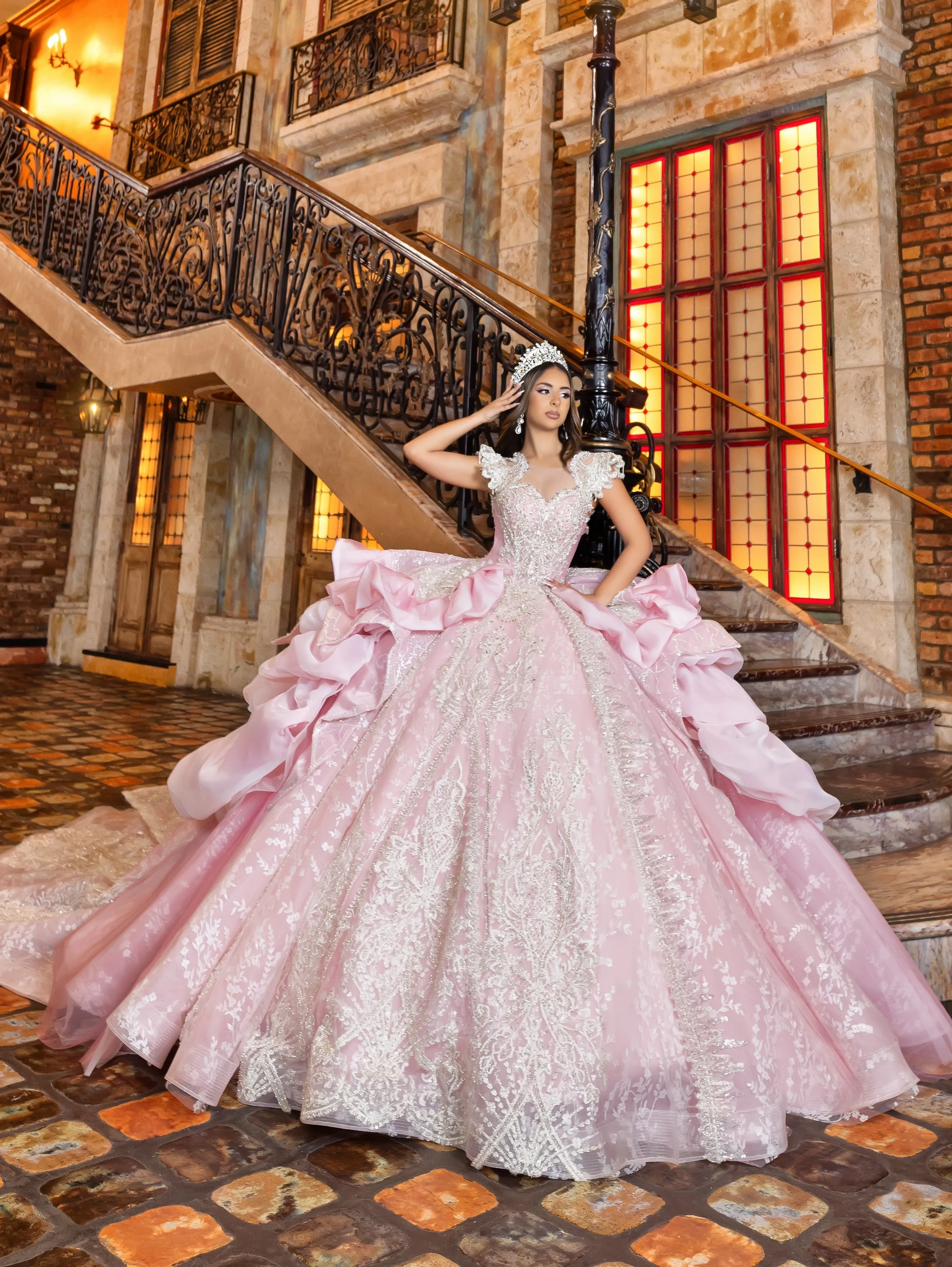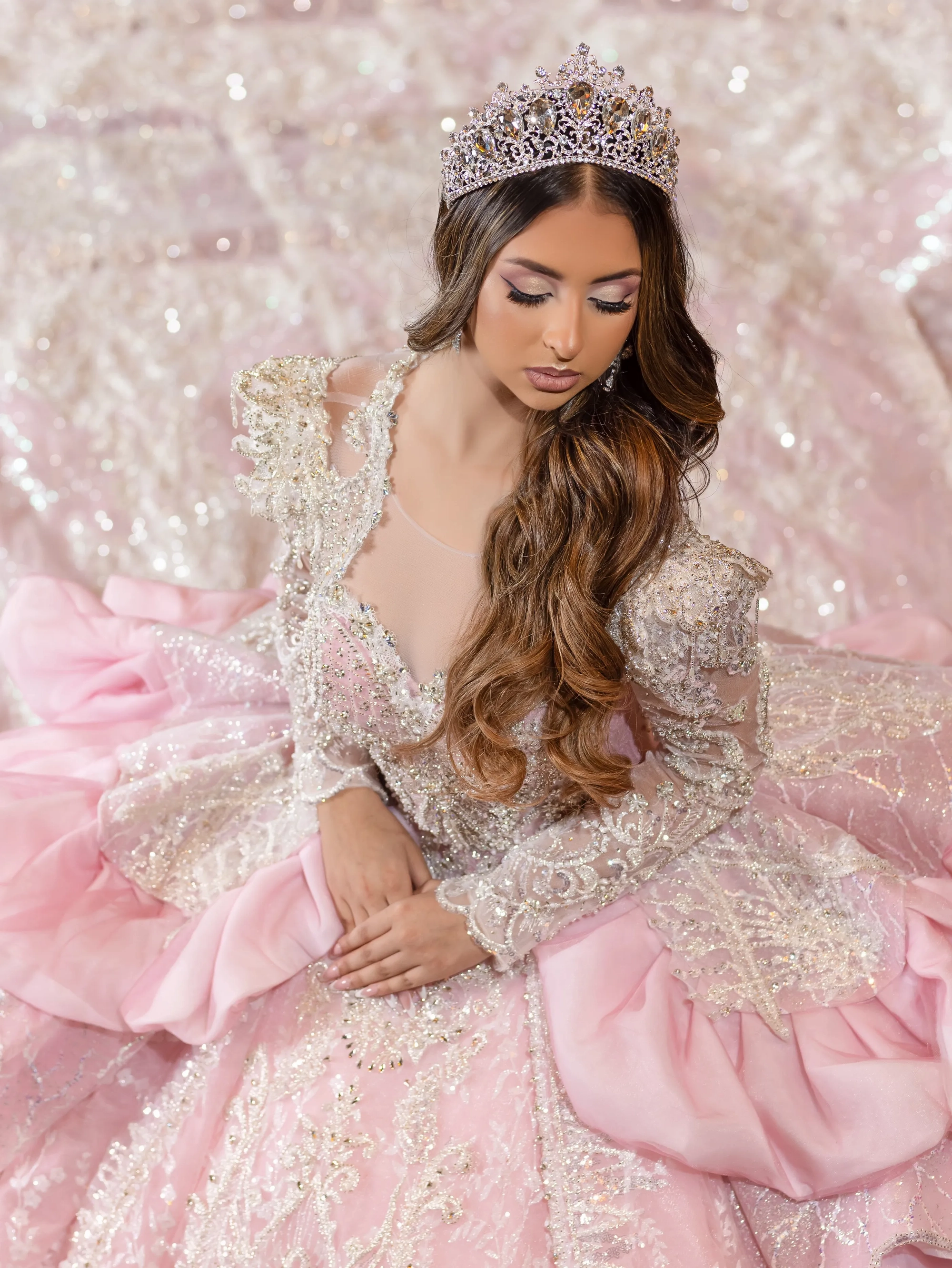 This Quince gown takes its inspiration from haute couture and is fit for a queen. The bodice and neckline are adorned with crystal beaded lace applique. The shoulder sleeves are raised to create structured shape. The gown features removable crystal-beaded sheer long sleeves. The waist is layered with a bubble skirt that drapes into a peplum top layer. The ball gown skirt is decorated with crystal beaded applique. To complete the look, a royal train is added and shaped into a triangular finishing edge.