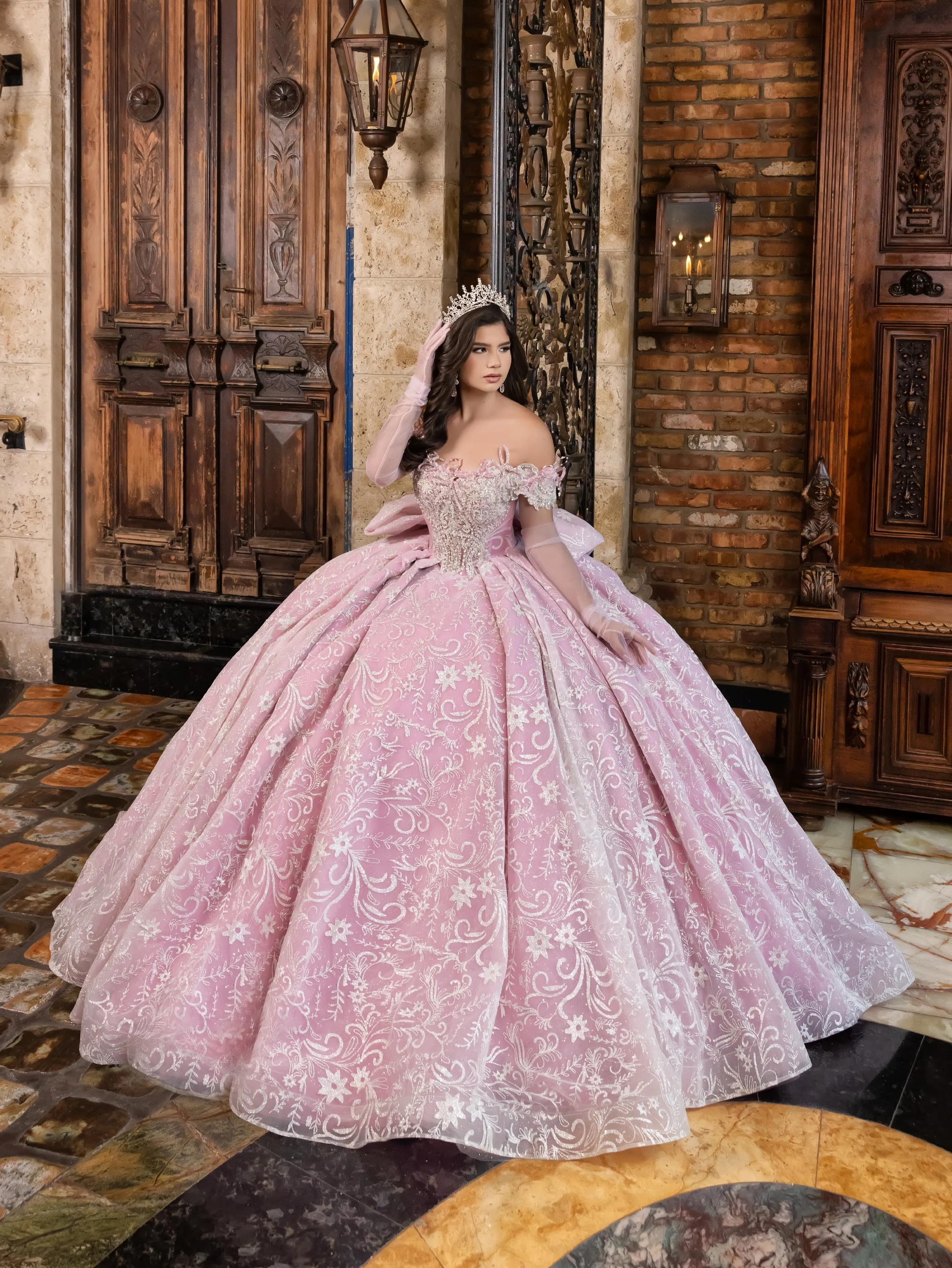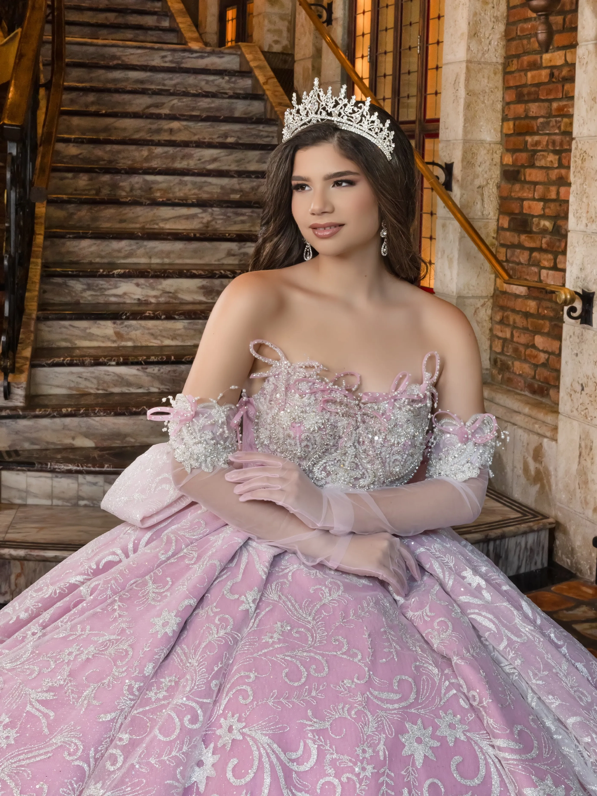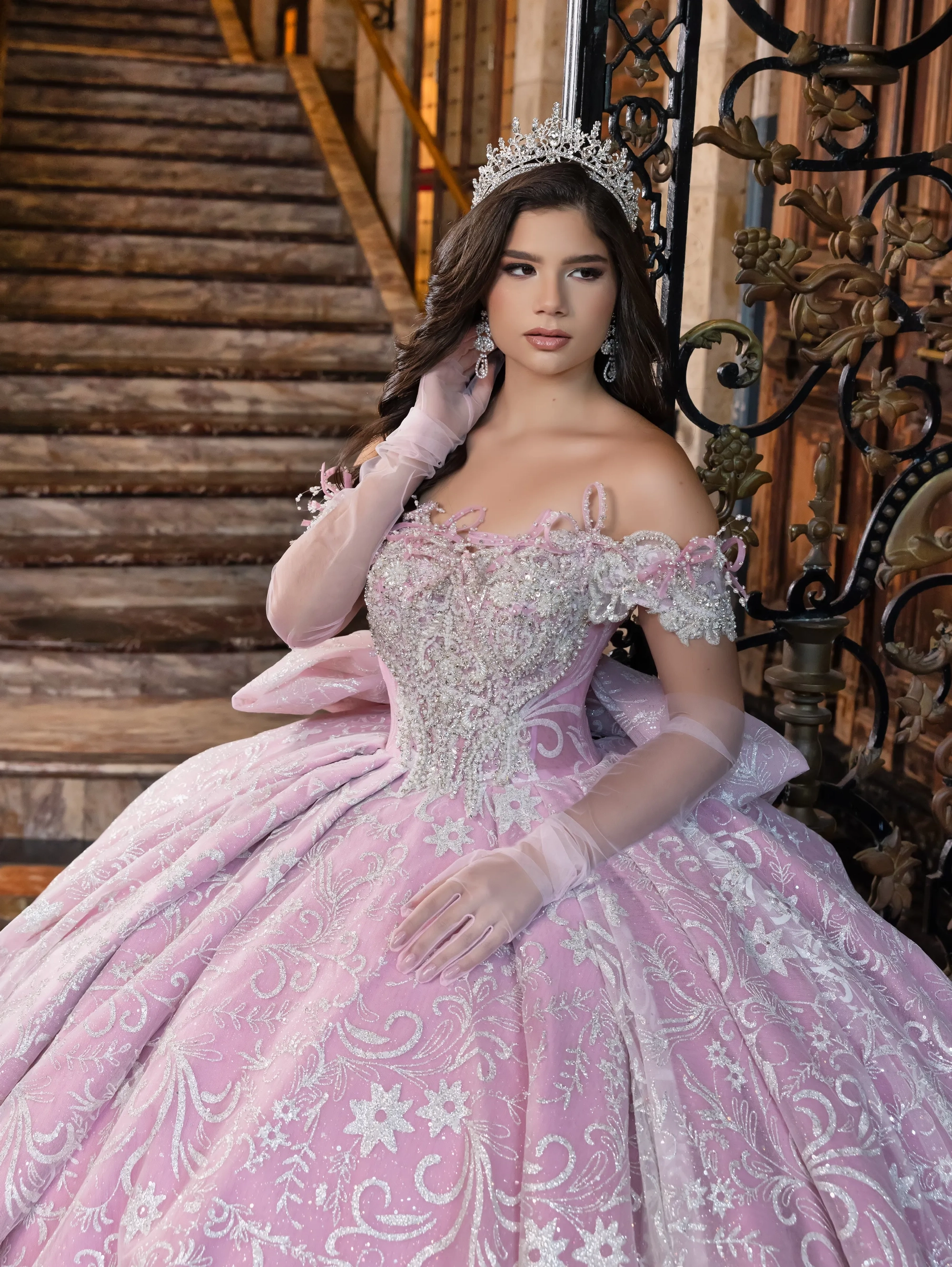 This stunning quince ball gown features a couture-draped bodice and a modern sweetheart neckline, off-the-shoulder sleeves, and delicate crystalized bows. This box pleat royal ballgown is adorned with a burst of glitter to create the ultimate sparkle. The royal train is completed with a statement bow. We added sheer gloves to show how to make it your own.