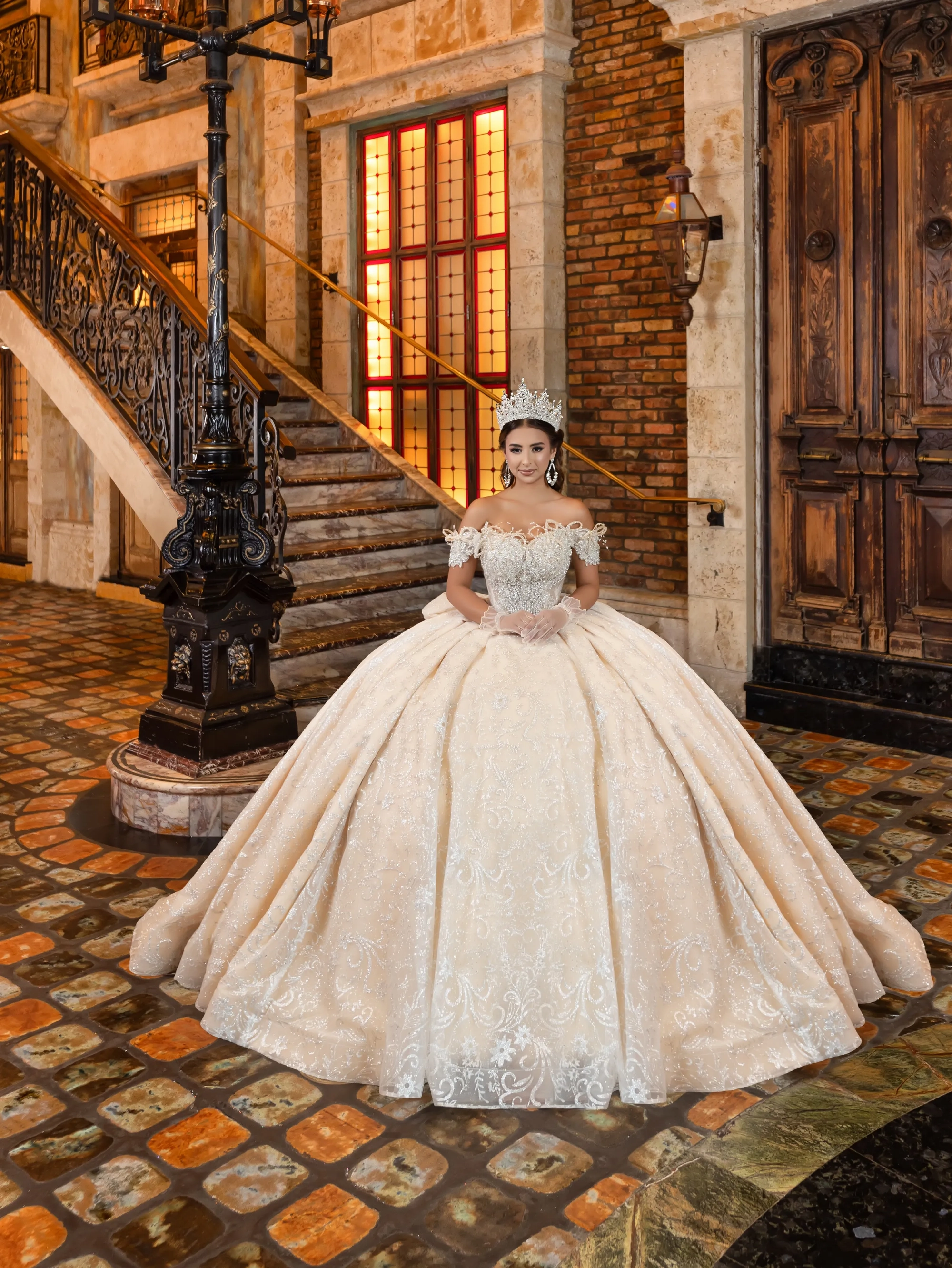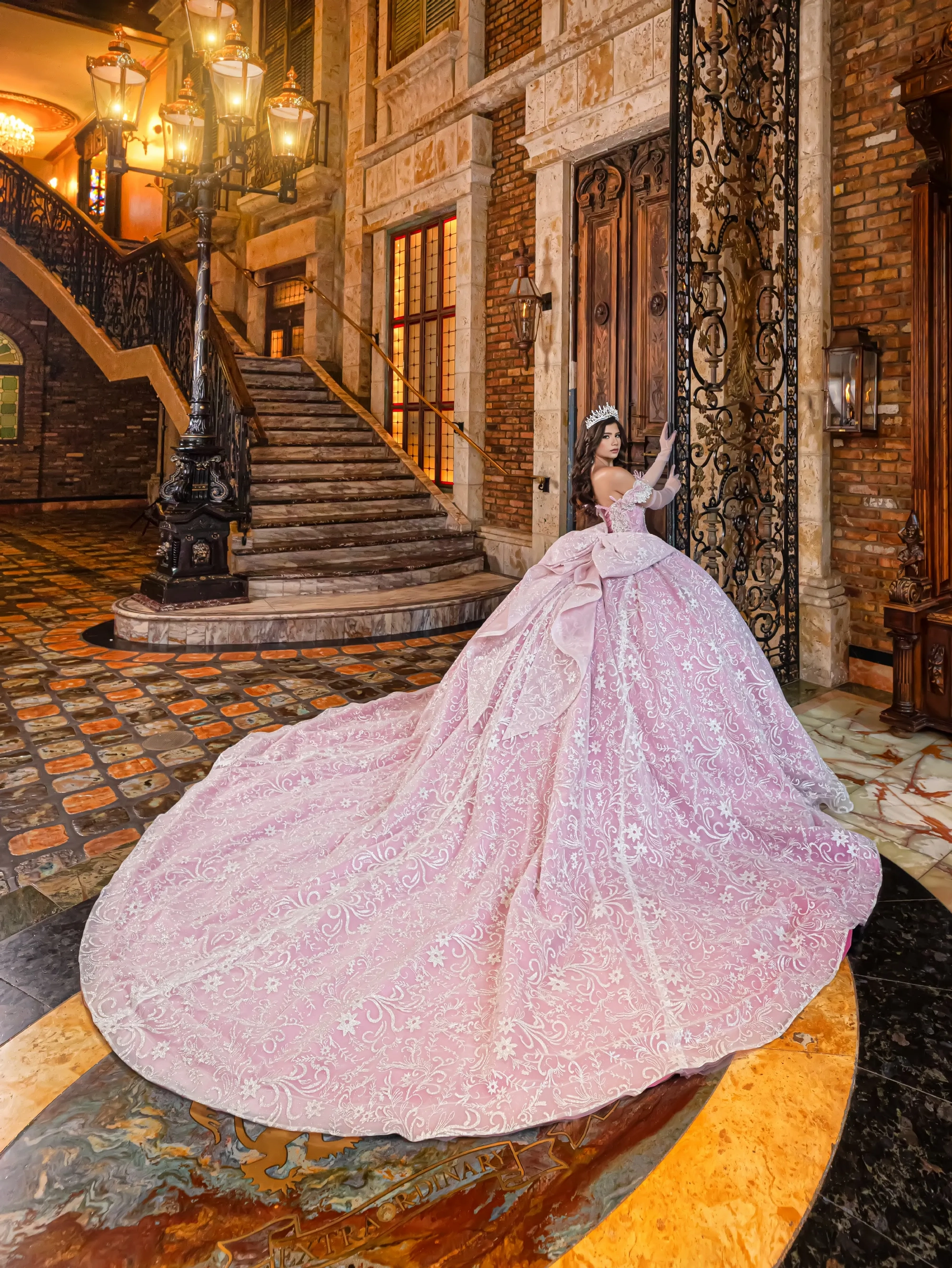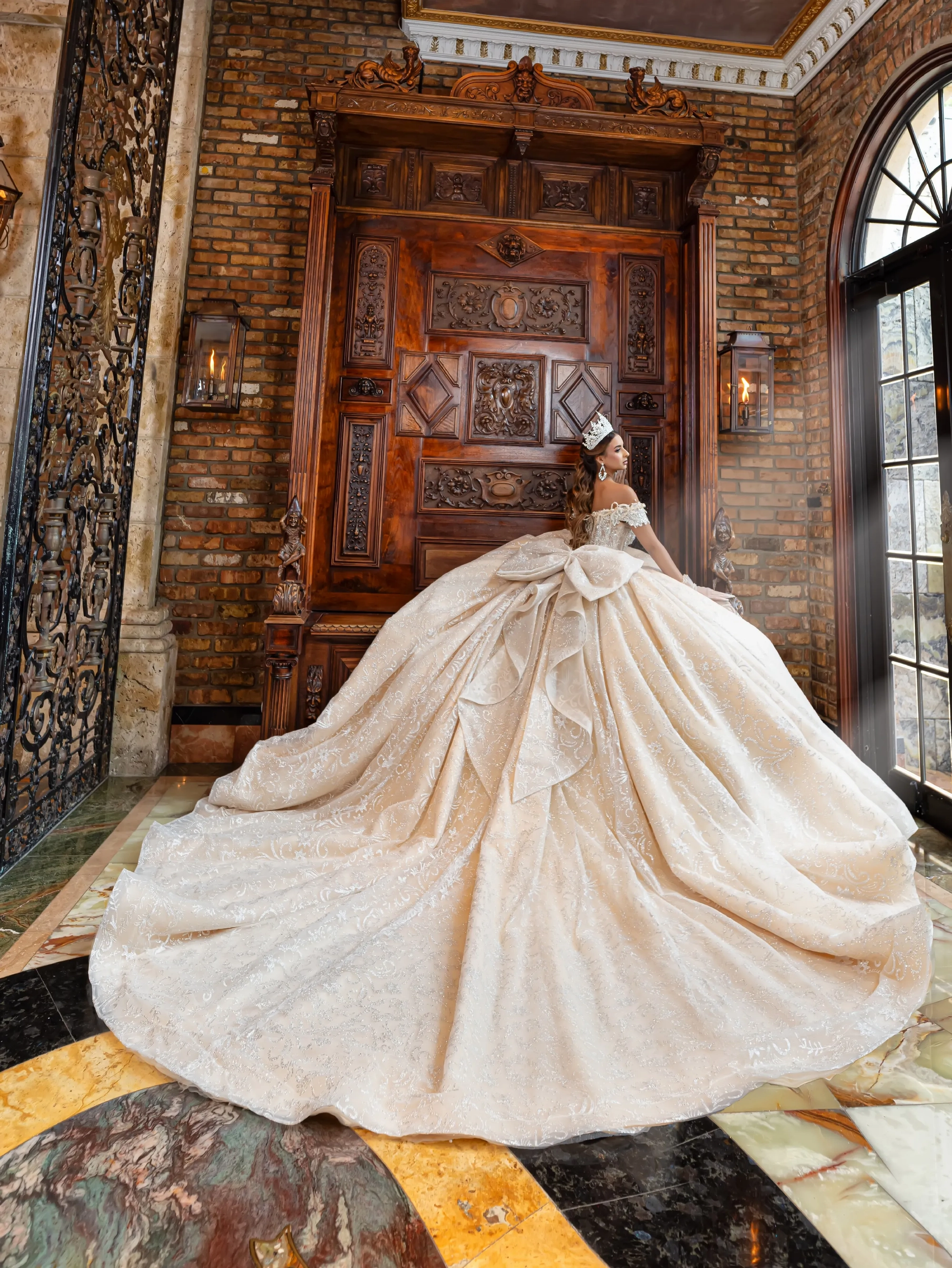 This stunning quince ball gown features a couture-draped bodice and a modern sweetheart neckline, off-the-shoulder sleeves, and delicate crystalized bows. This box pleat royal ballgown is adorned with a burst of glitter to create the ultimate sparkle. The royal train is completed with a statement bow. We added sheer gloves to show how to make it your own.