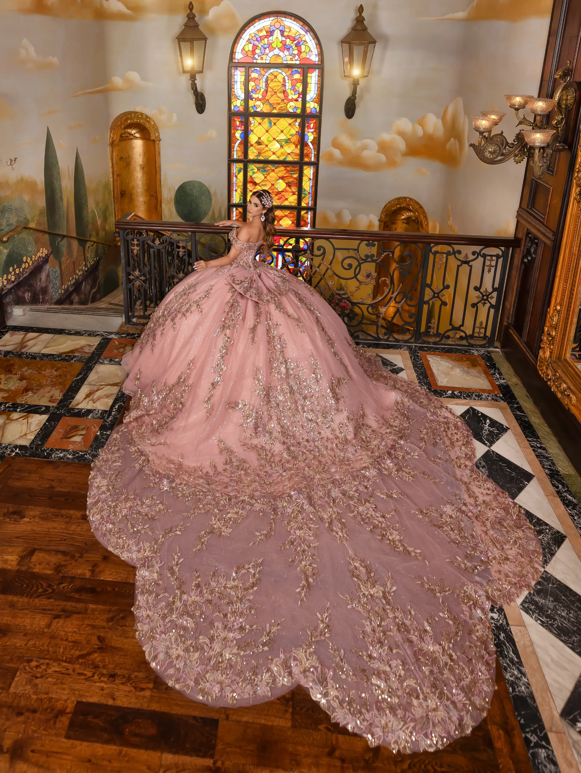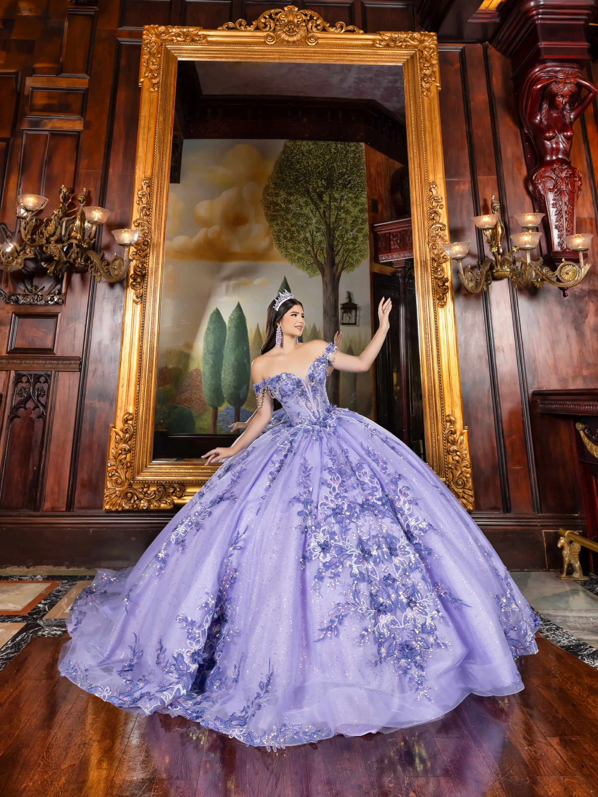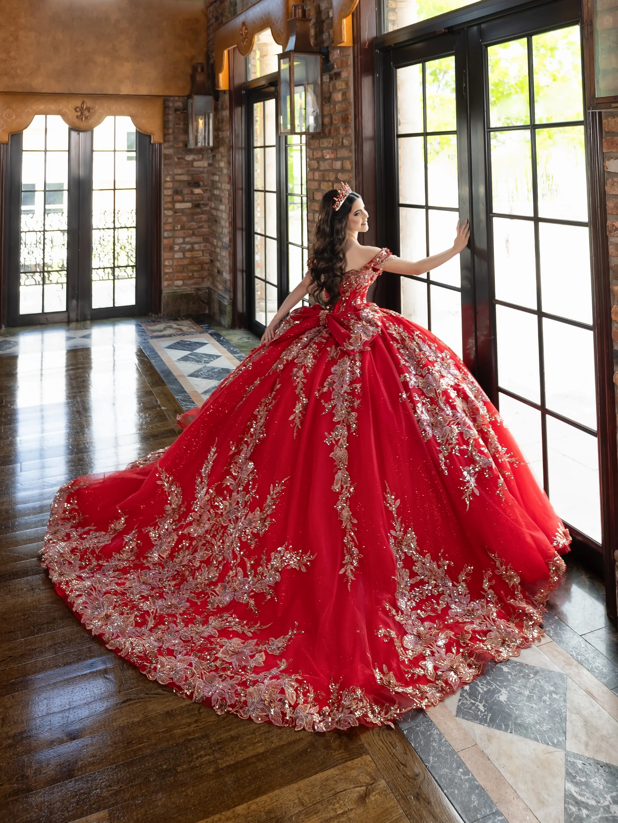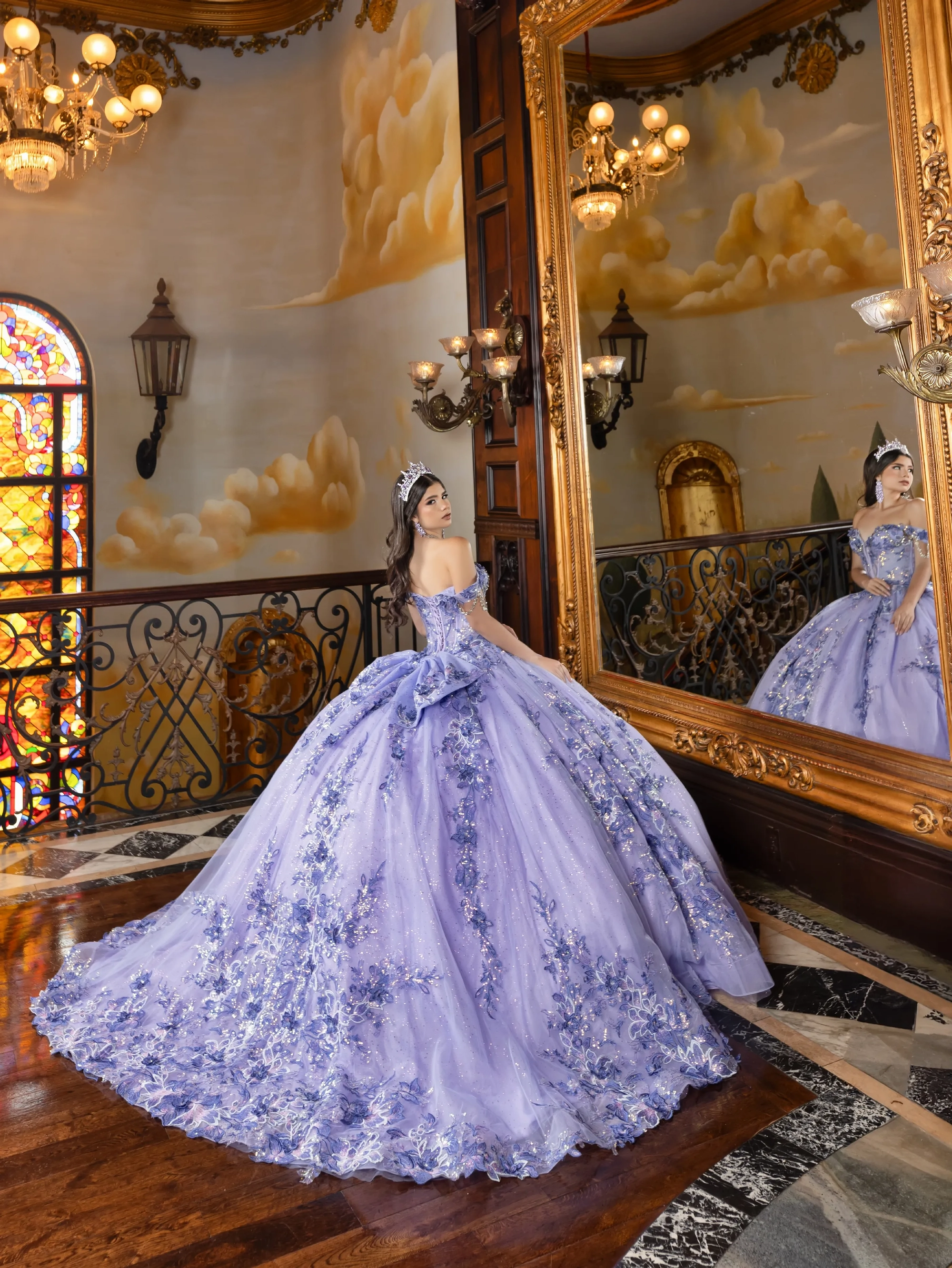 This modern princess ball gown features a regal off-the-shoulder design that showcases three-dimensional lace floral appliques. Delicate crystal beading is draped all around the off-the-shoulder sleeves to add a touch of sparkle. The full ball gown skirt is adorned with statement 3D lace appliques to create the ultimate grand fantasy. The detachable train features a unique scallop shape.