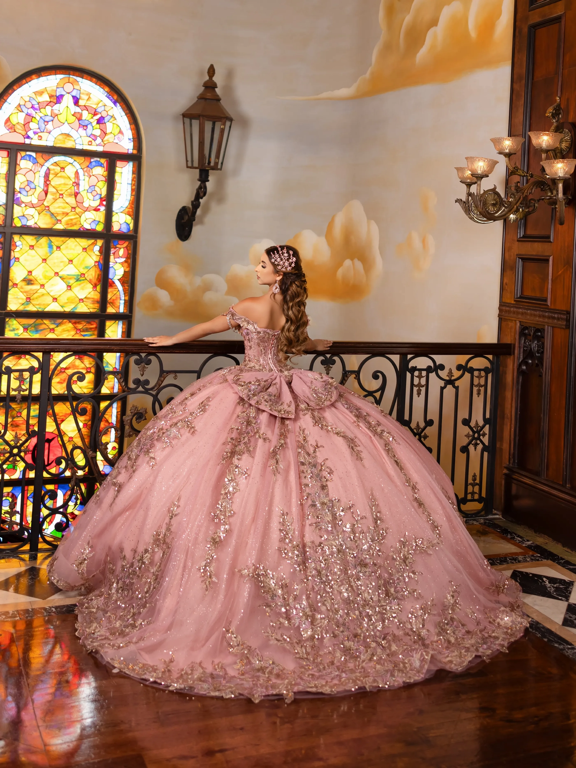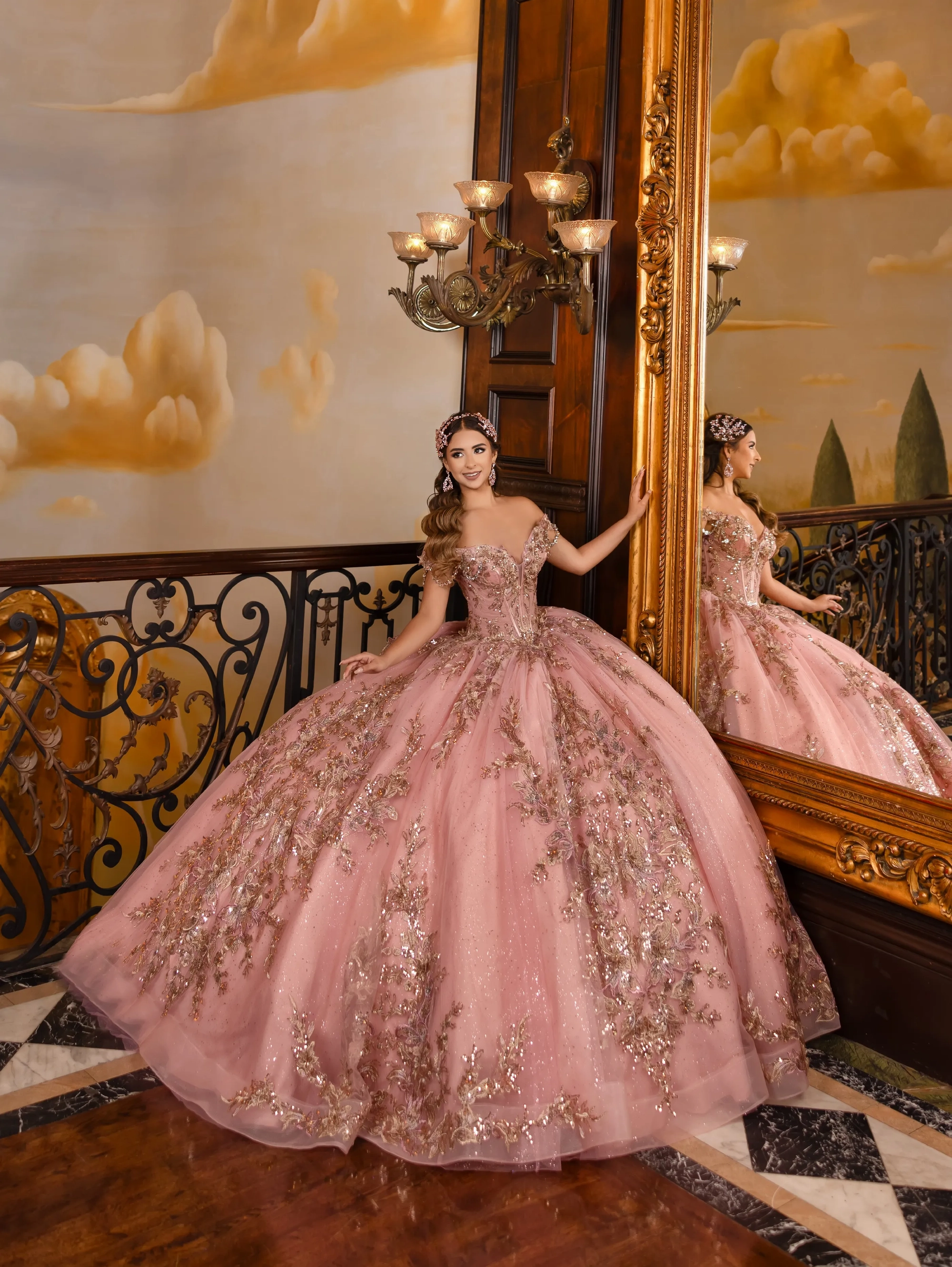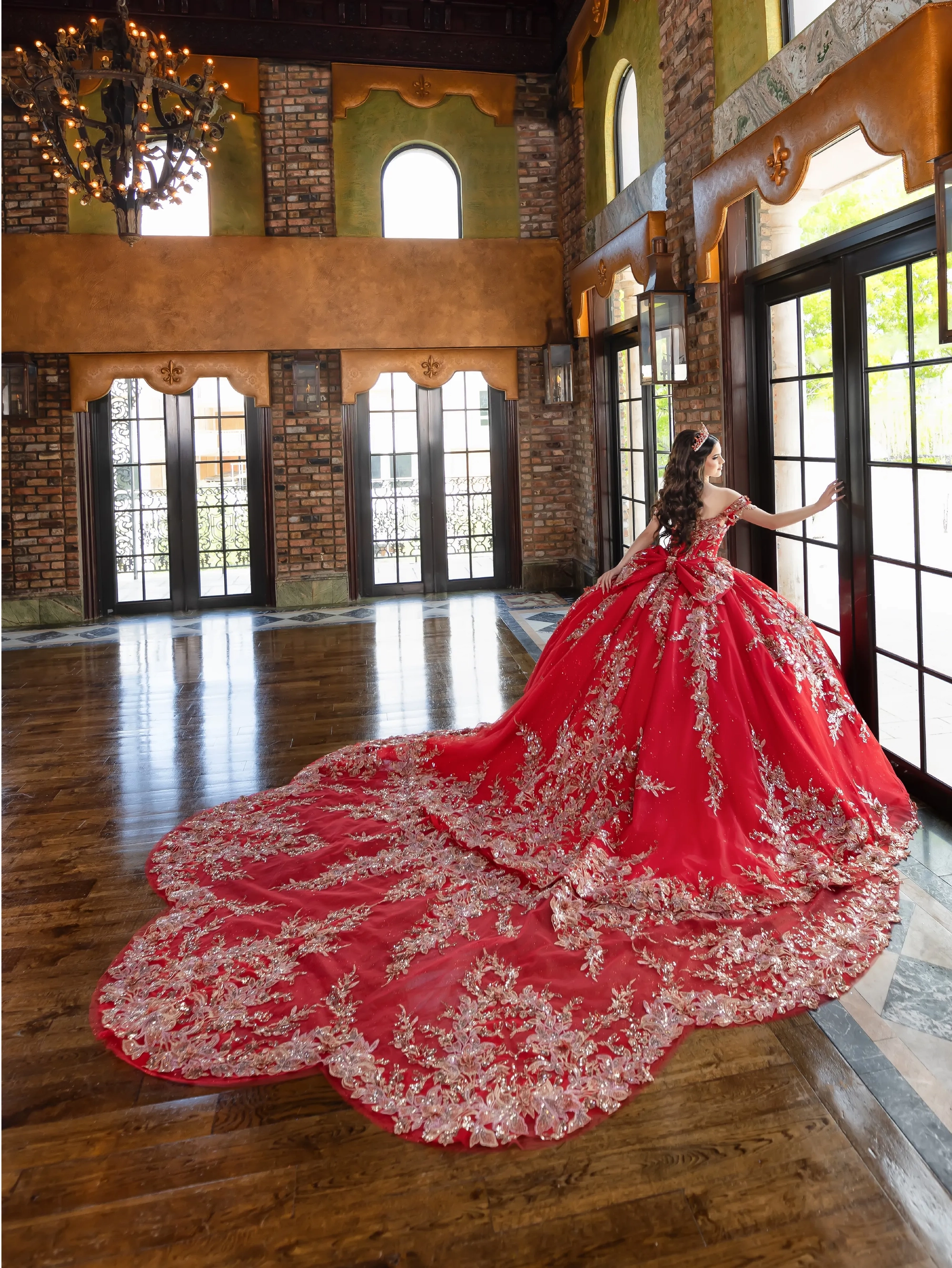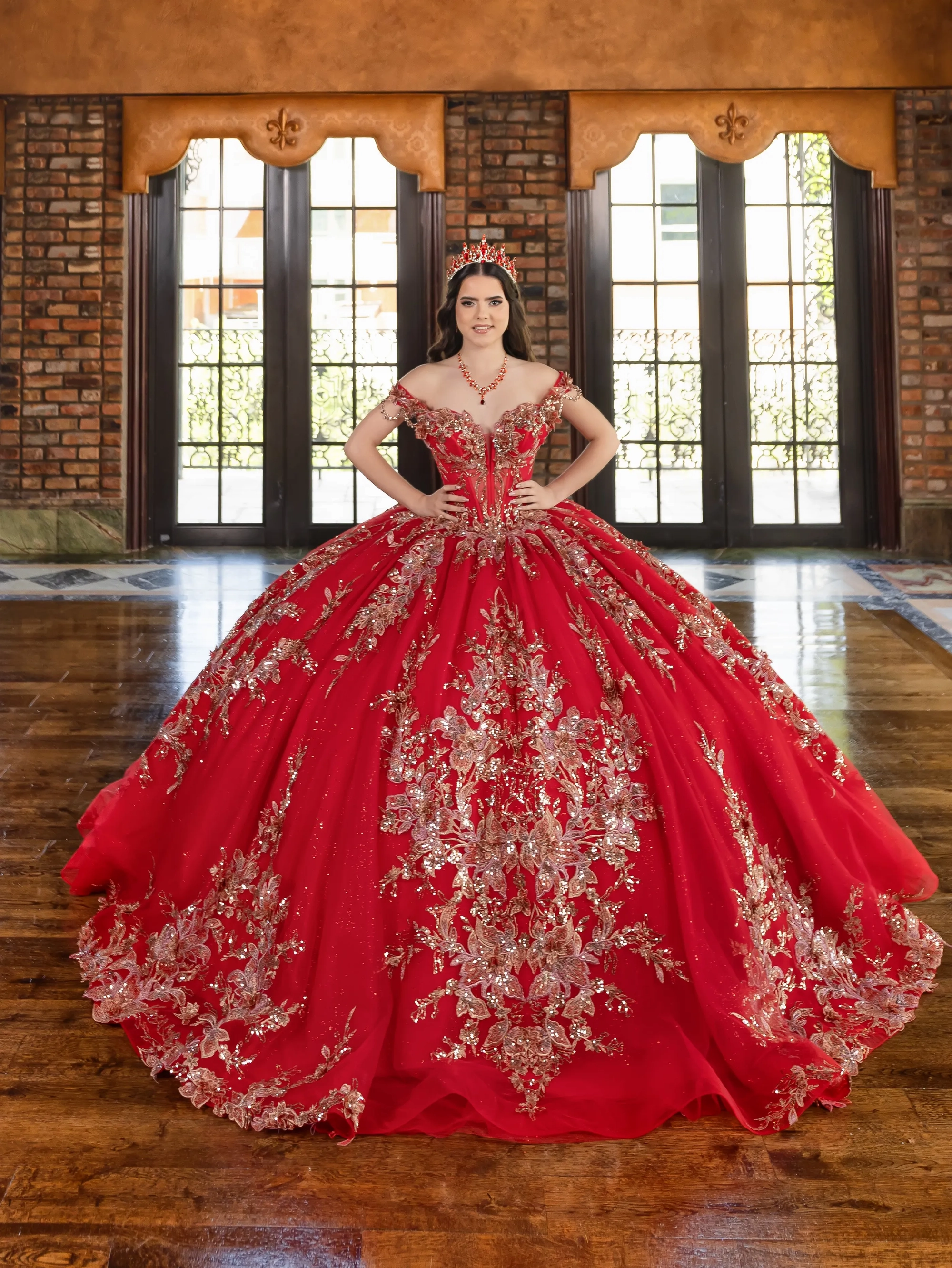 This modern princess ball gown features a regal off-the-shoulder design that showcases three-dimensional lace floral appliques. Delicate crystal beading is draped all around the off-the-shoulder sleeves to add a touch of sparkle. The full ball gown skirt is adorned with statement 3D lace appliques to create the ultimate grand fantasy. The detachable train features a unique scallop shape.