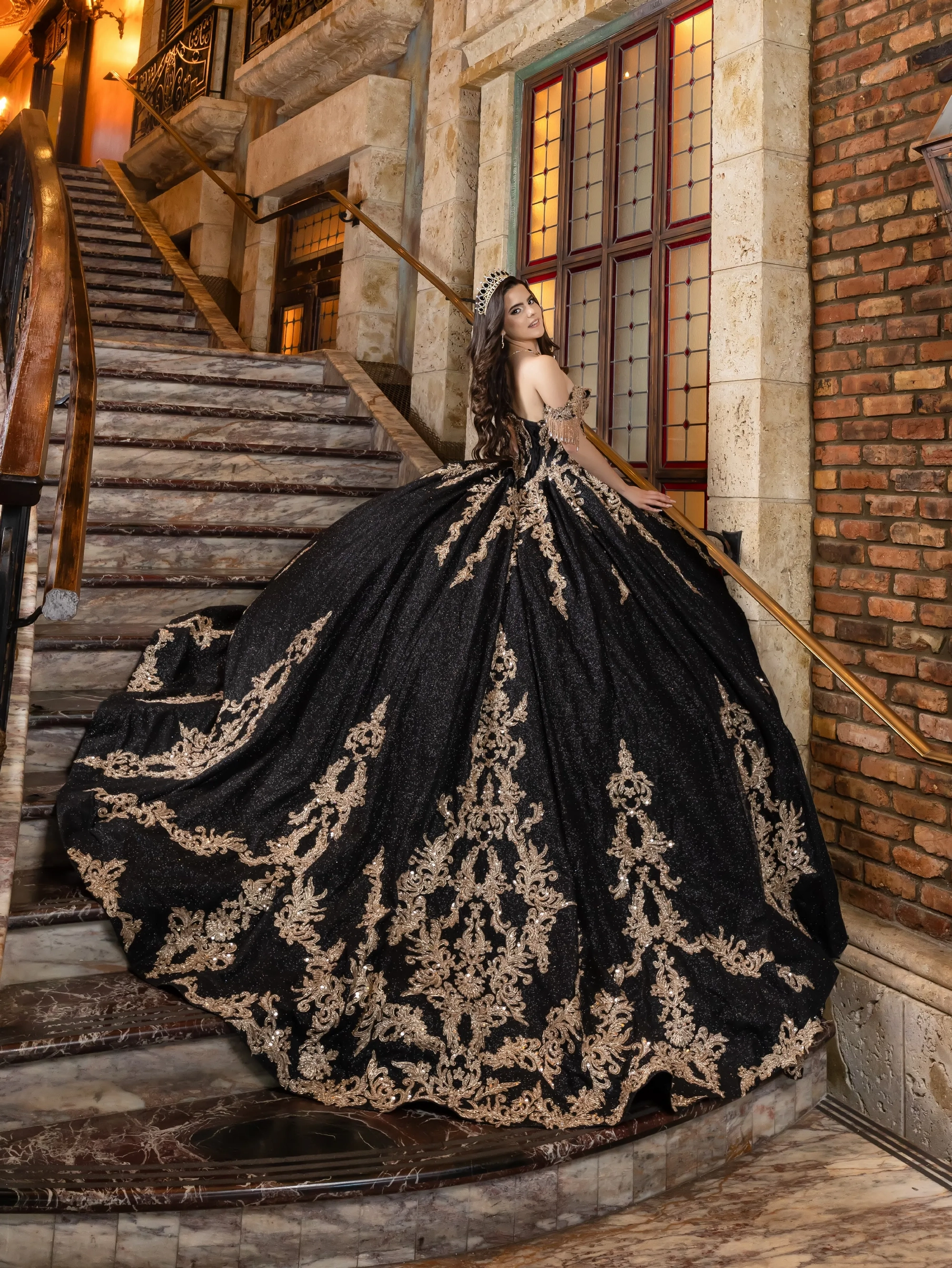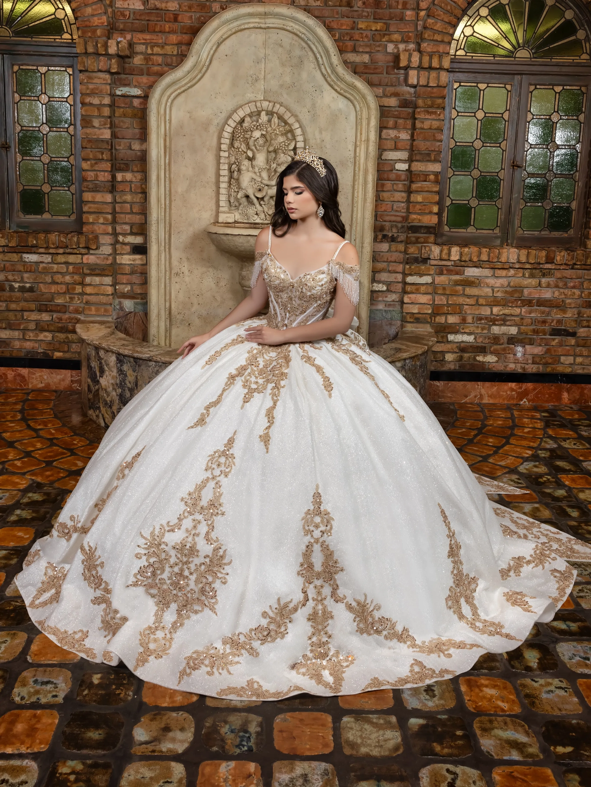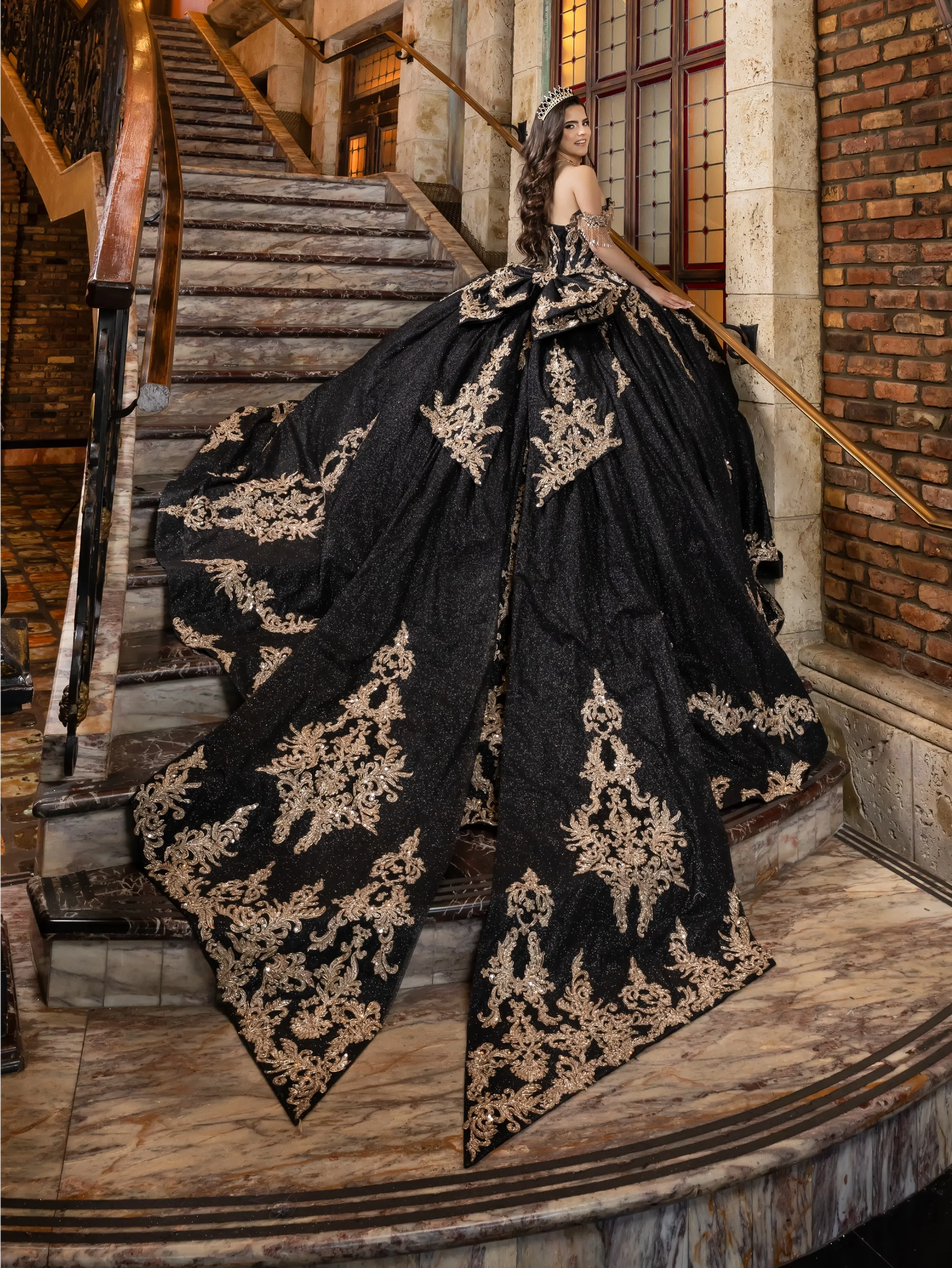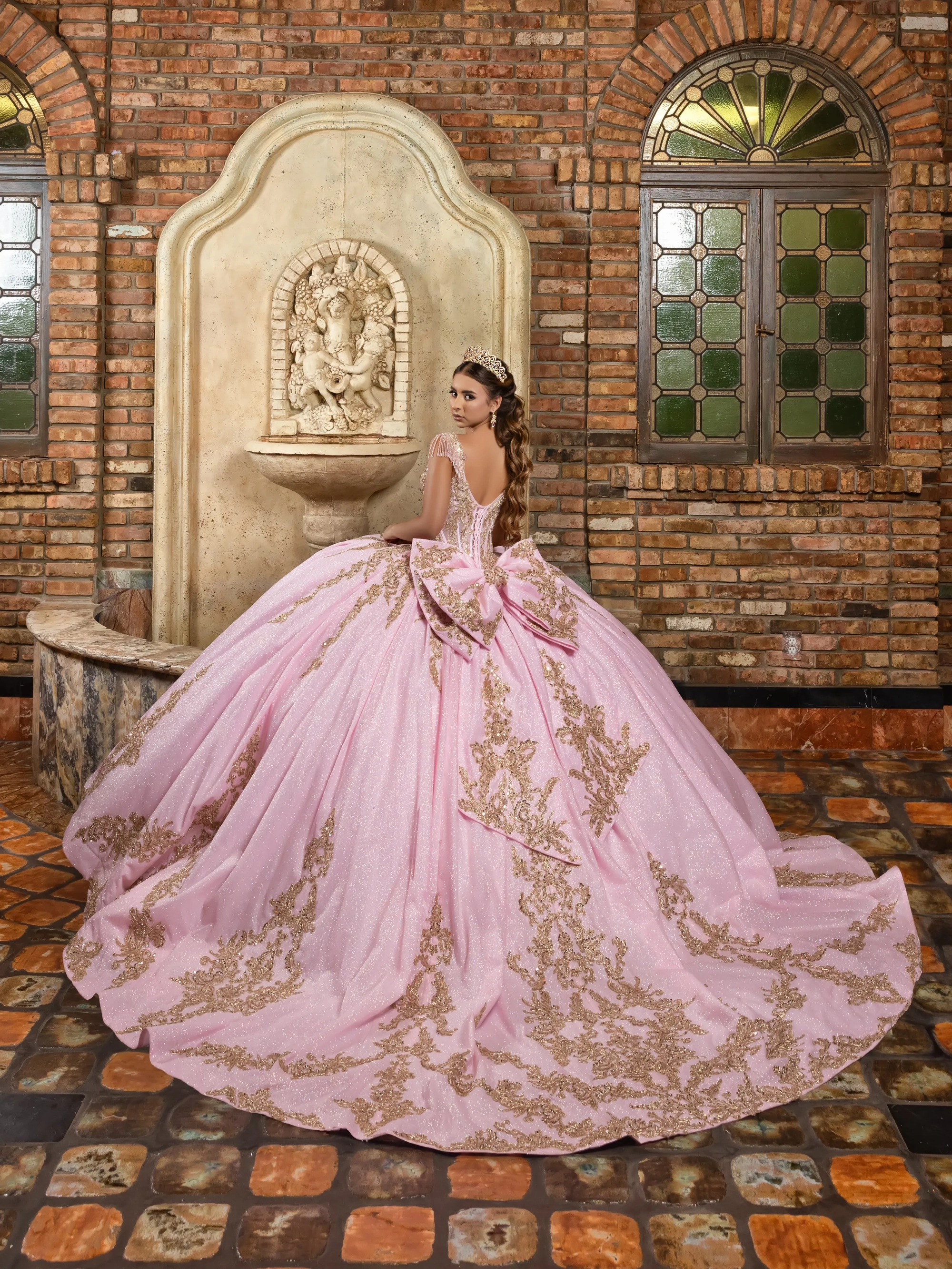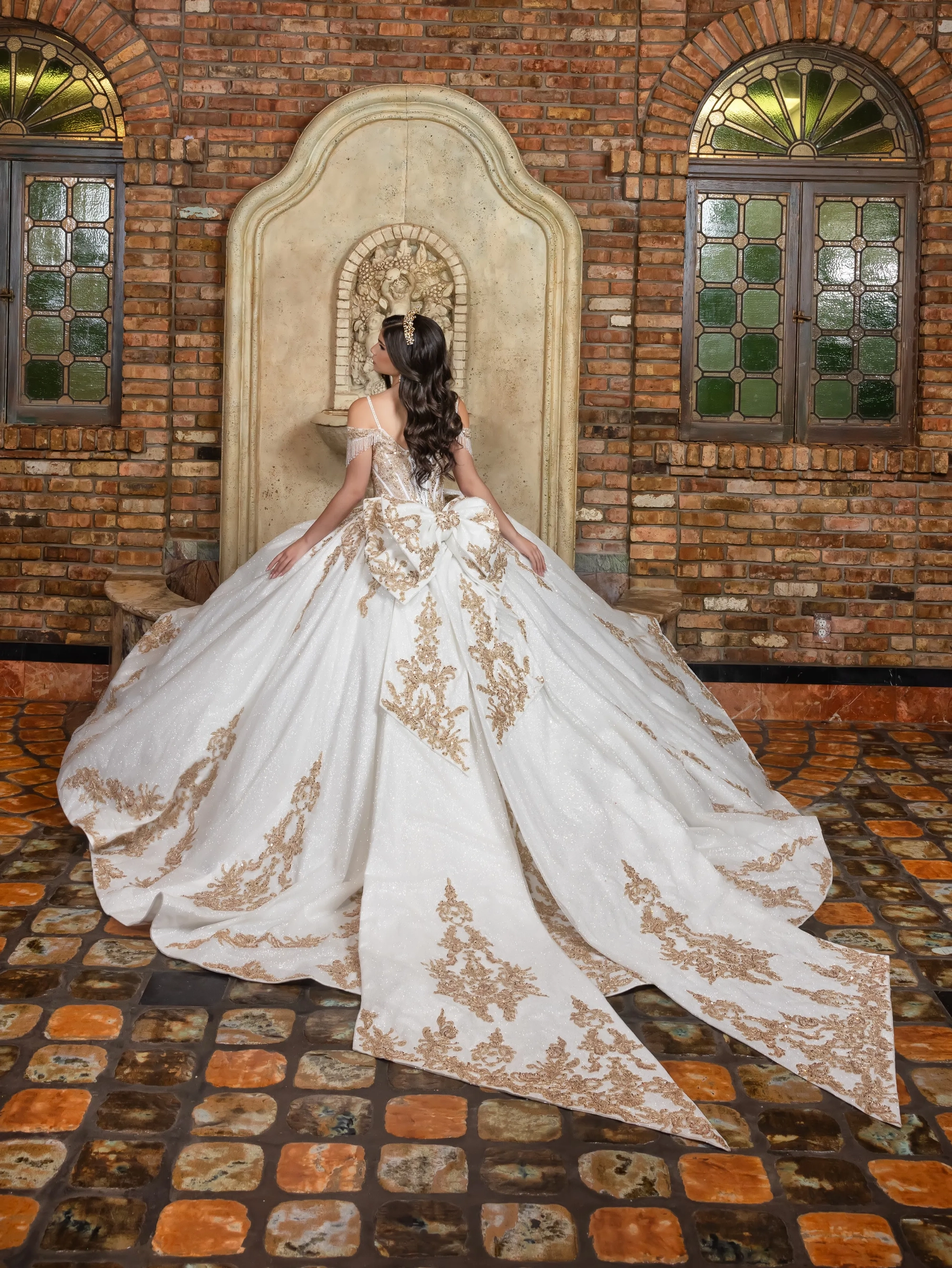This stunning Quinceanera ballgown features a regal lace applique. Delicate shoulder straps are beaded to complement a cascade of beads that adorn the off-the-shoulder straps. The full glitter tulle royal ball gown is made of gorgeous lace applique for an eye-catching style. To complete this look, we added a statement bow with long streamers that drapes down the train.