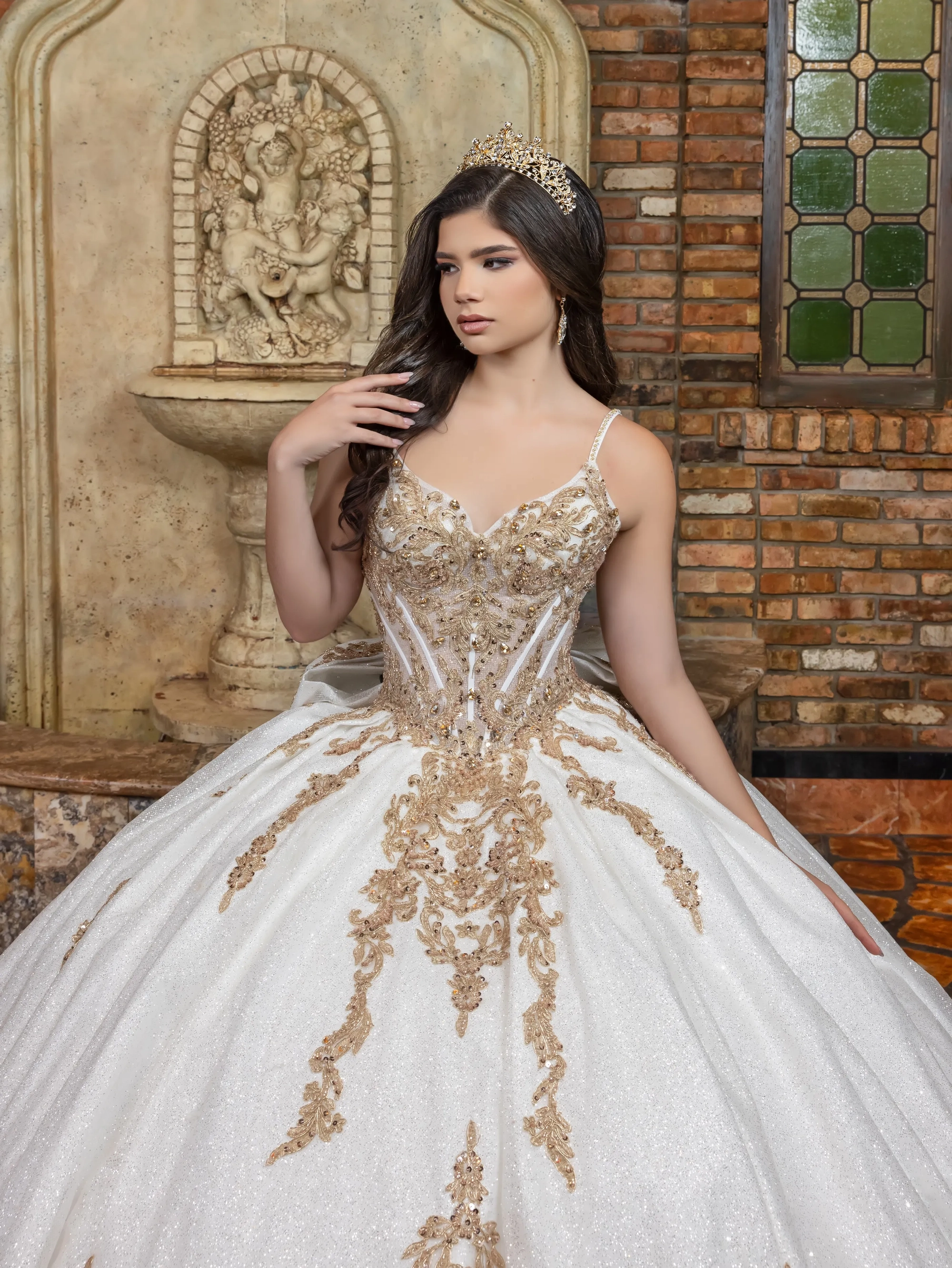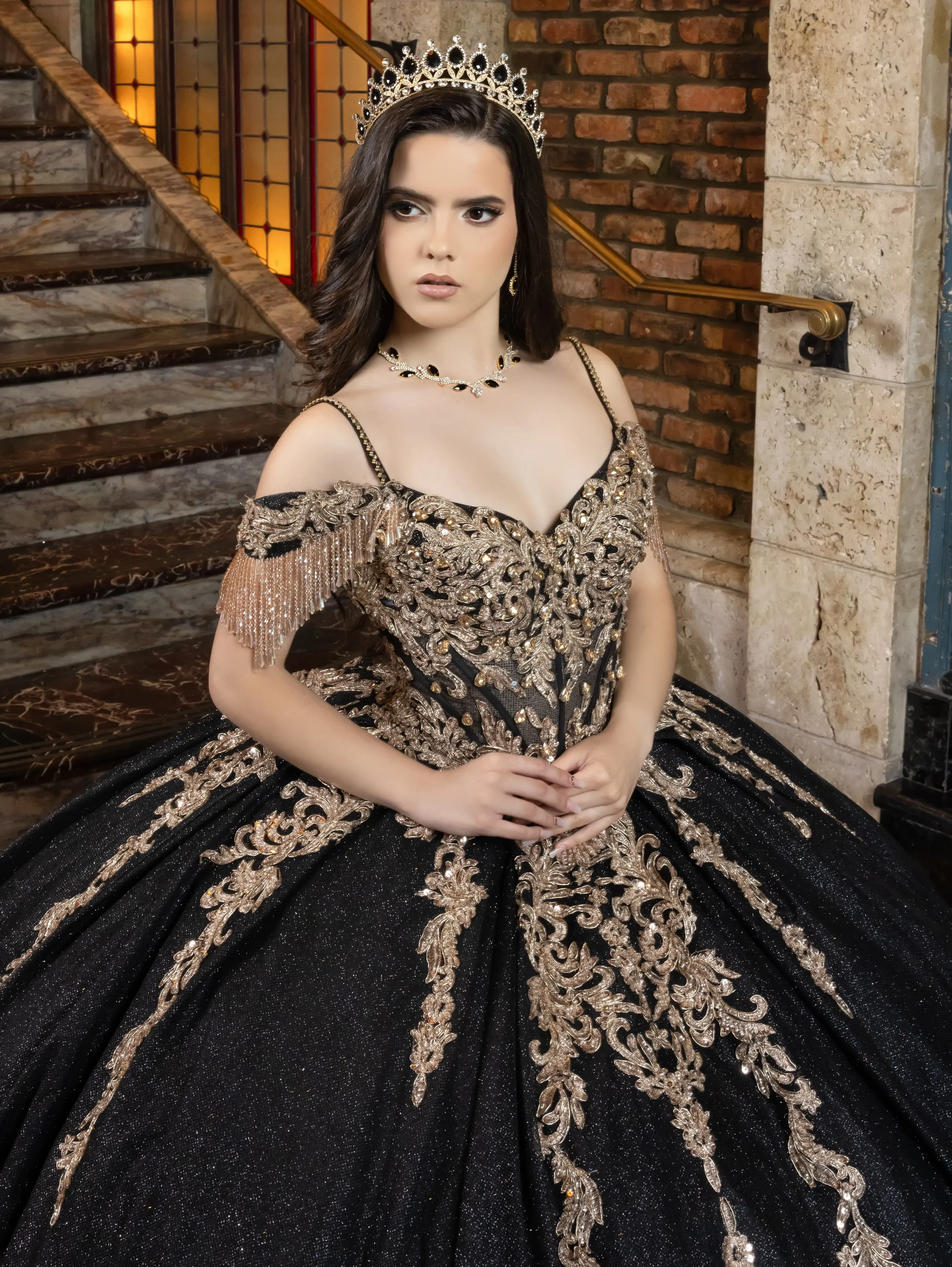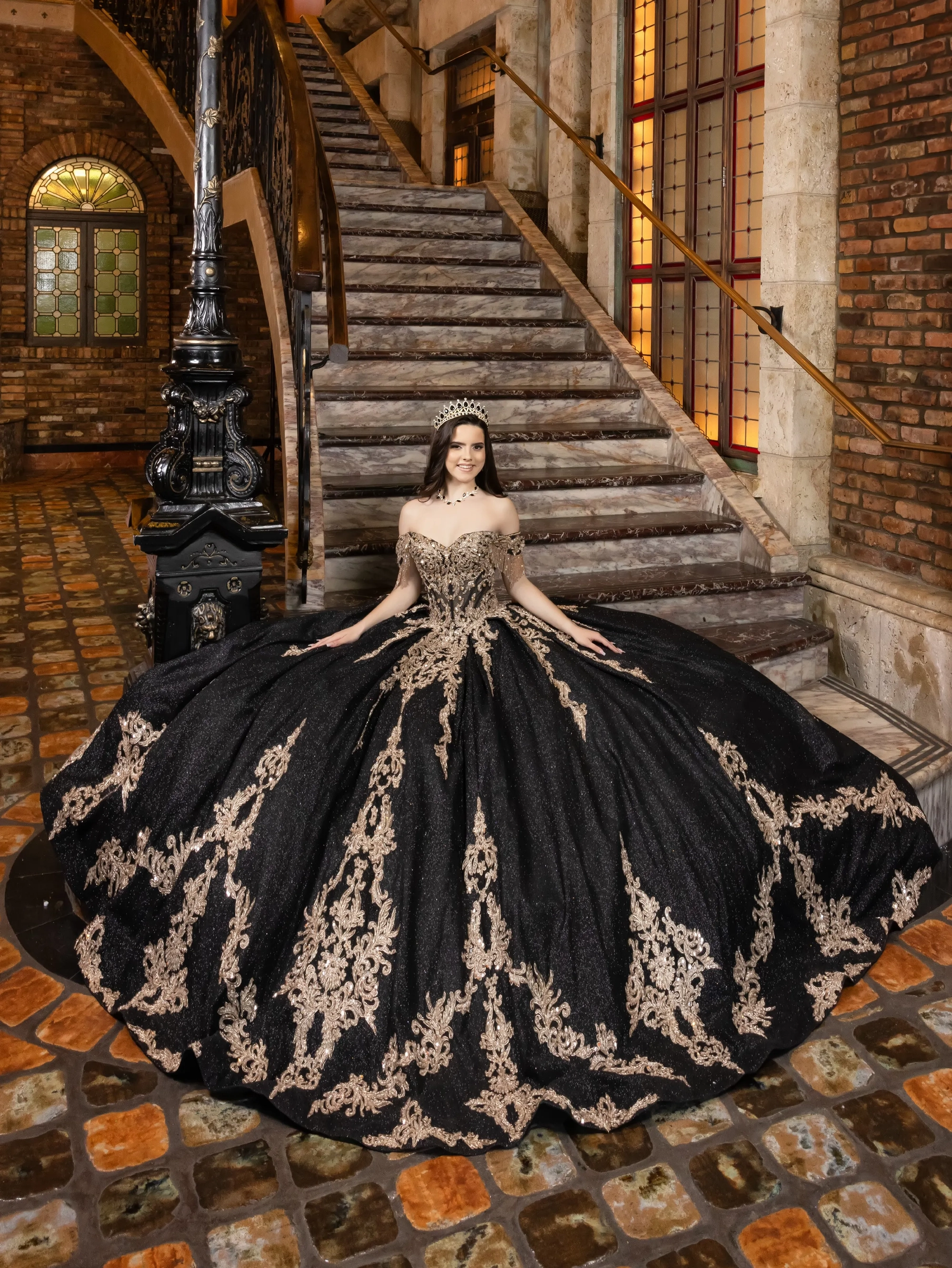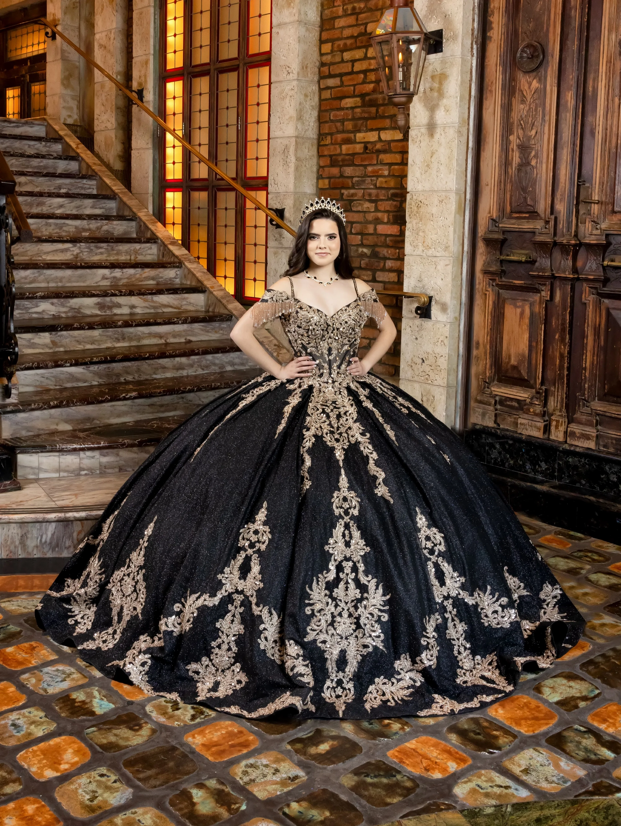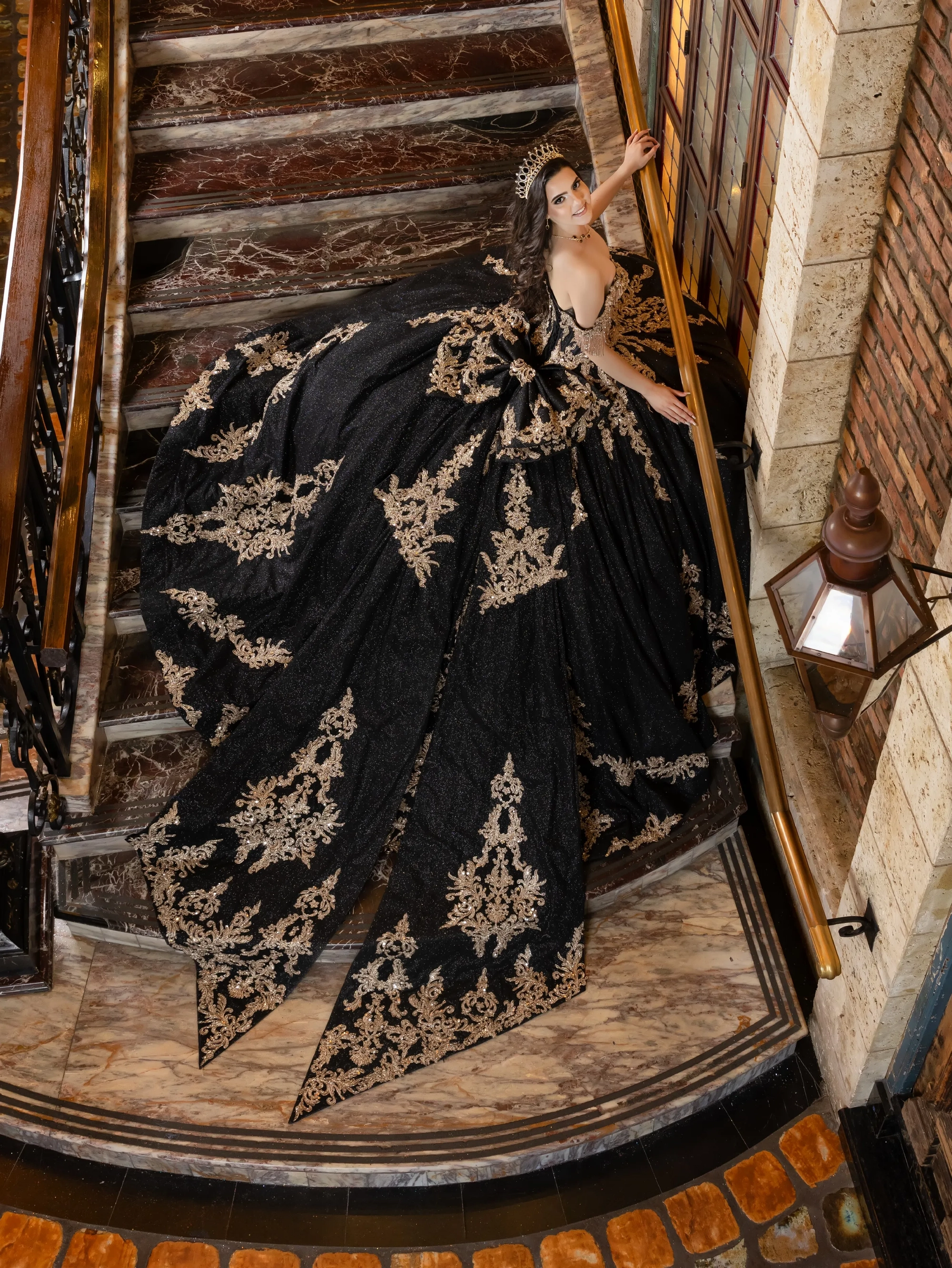 This stunning Quinceanera ballgown features a regal lace applique. Delicate shoulder straps are beaded to complement a cascade of beads that adorn the off-the-shoulder straps. The full glitter tulle royal ball gown is made of gorgeous lace applique for an eye-catching style. To complete this look, we added a statement bow with long streamers that drapes down the train.