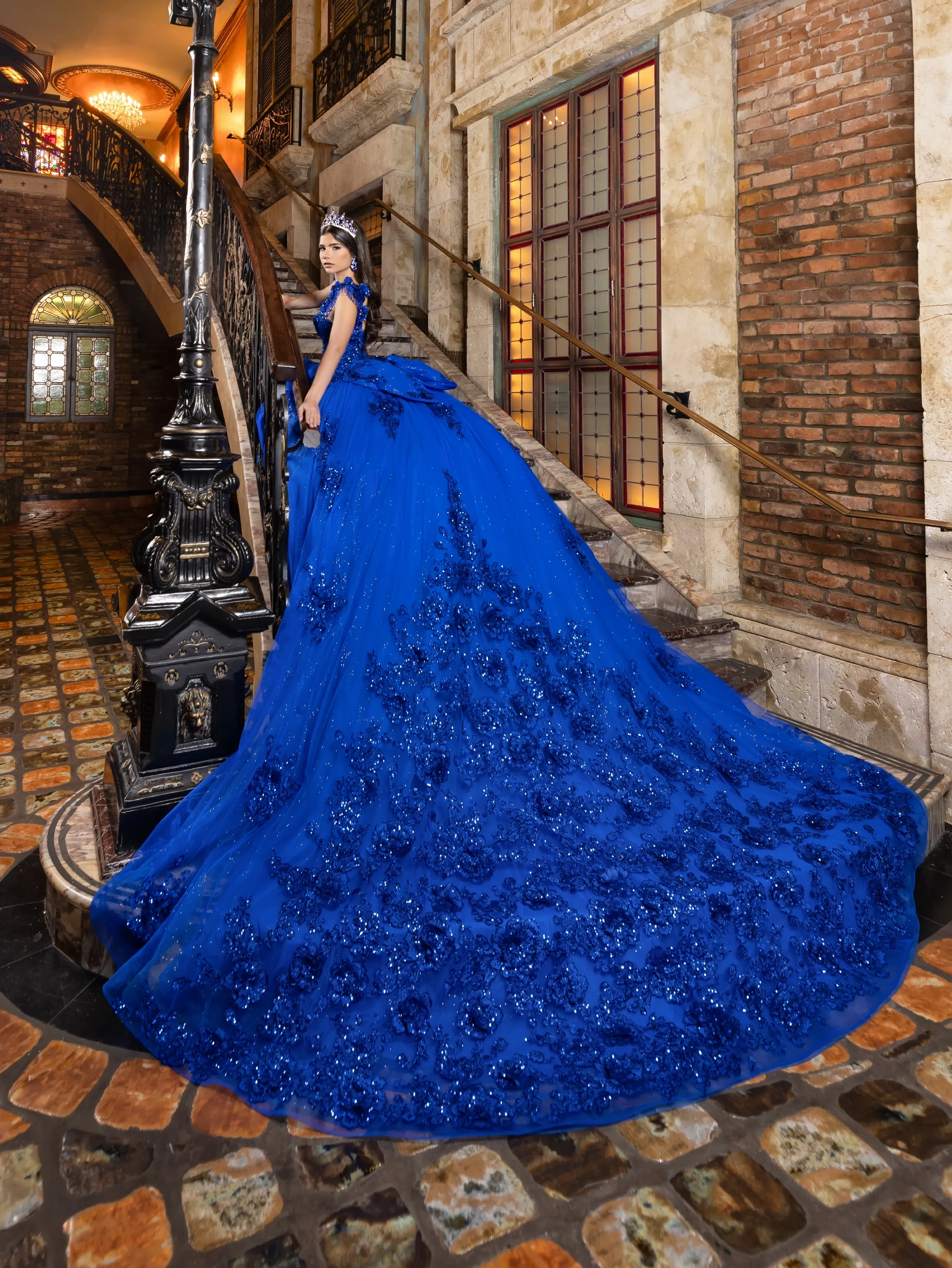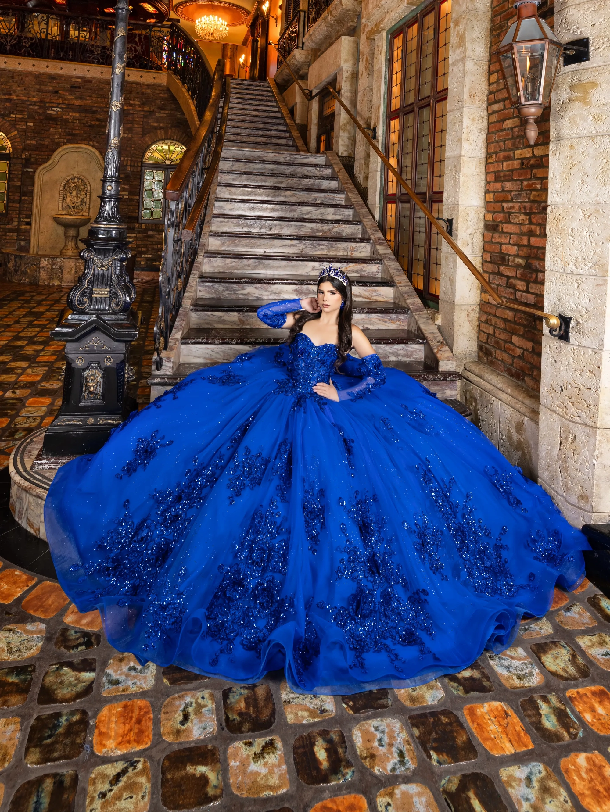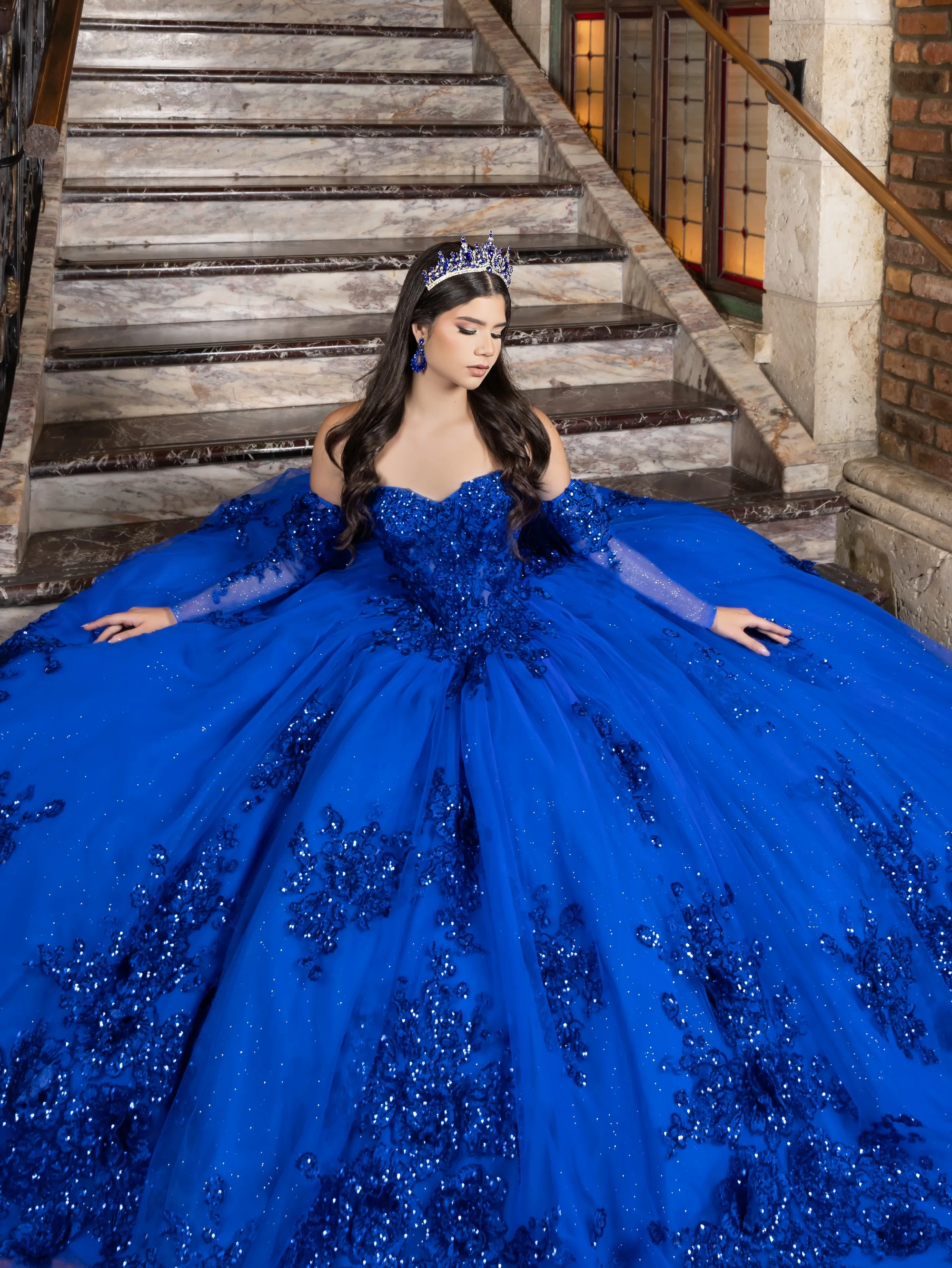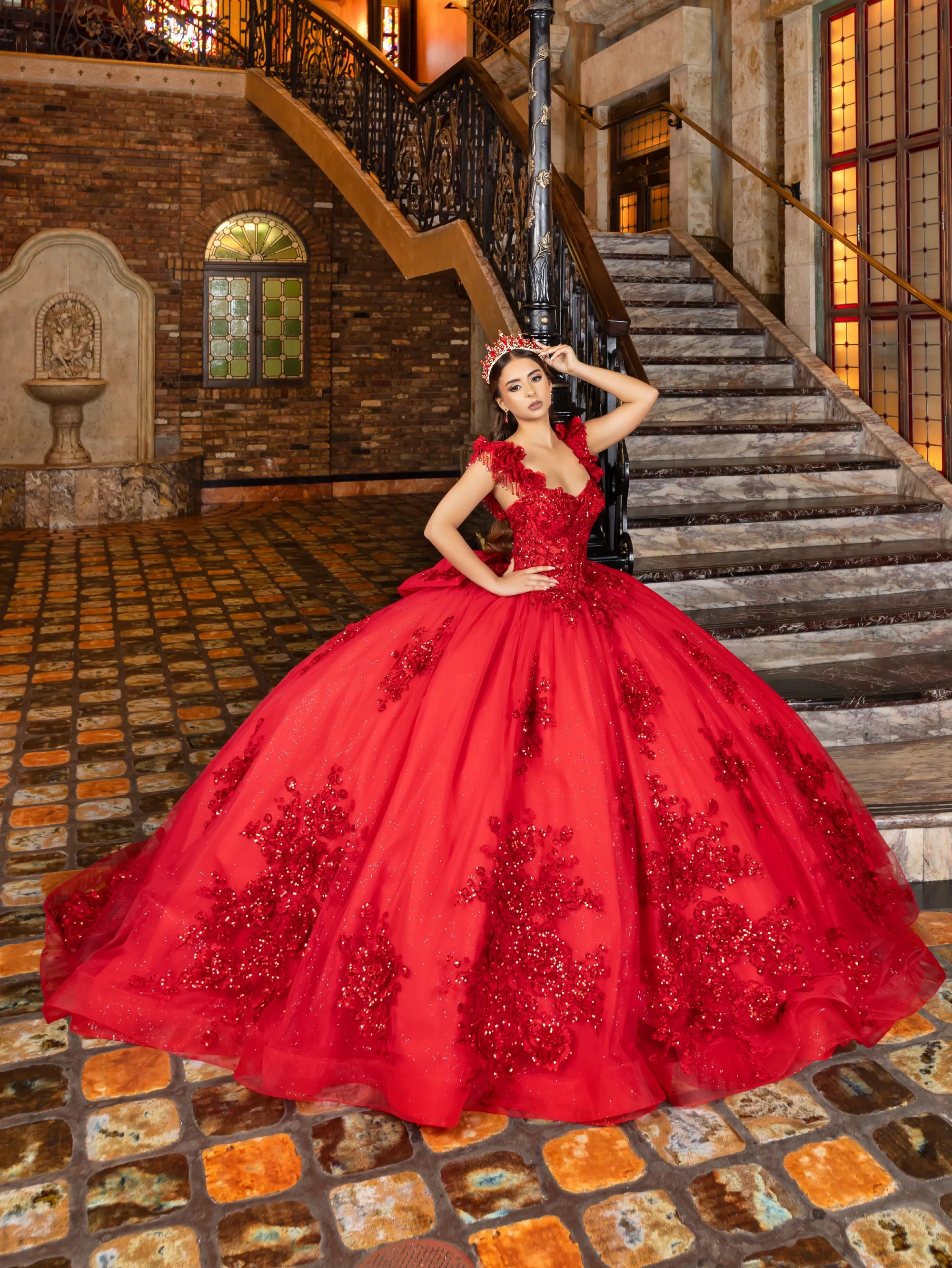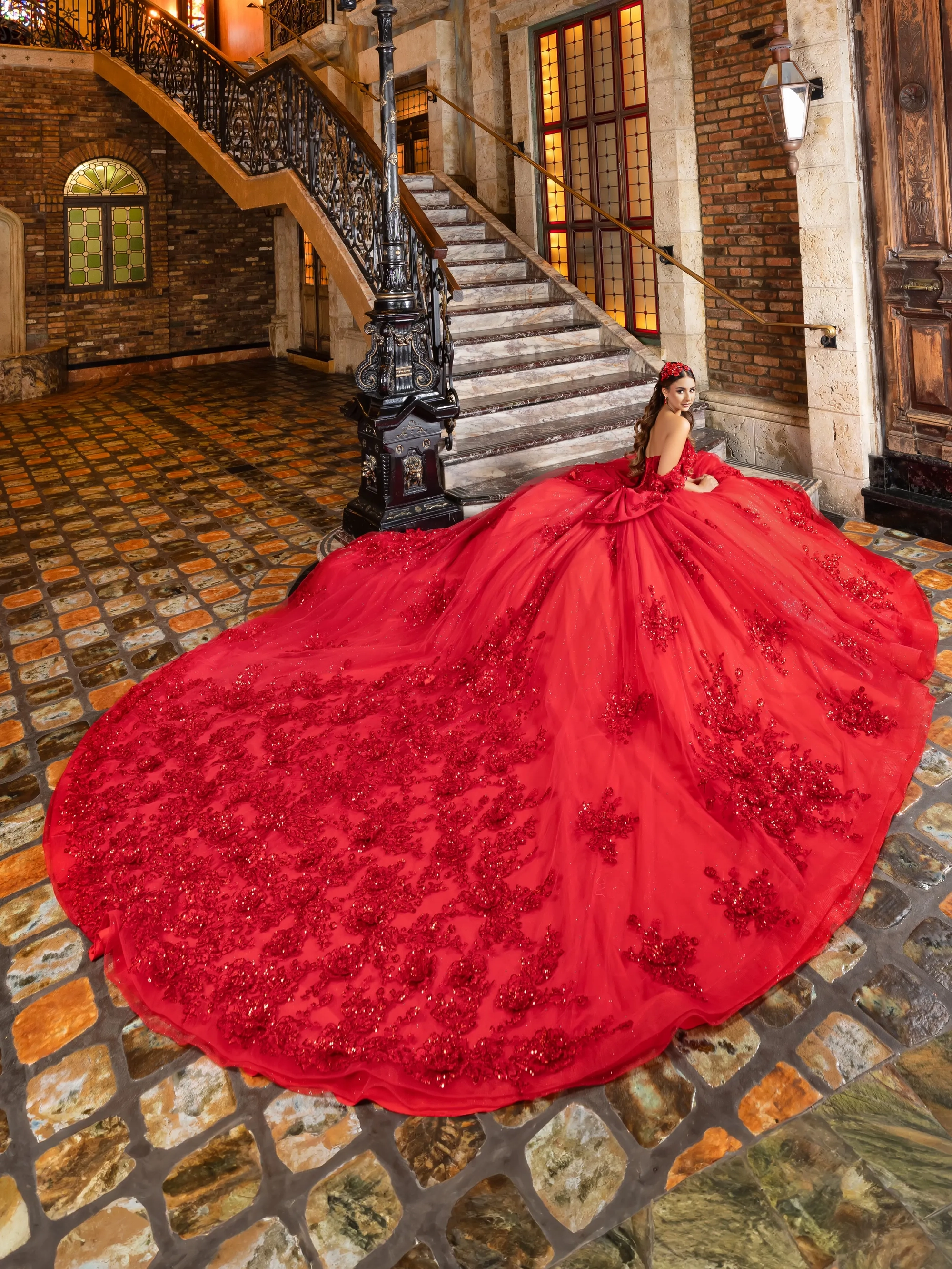 This classic style takes on a modern twist with gorgeous 3D lace applique. The bodice features a soft sweetheart neckline, and off-the-shoulder straps are made to look like flowers. Teardrop beading is added to the shoulder straps for a touch of sparkle. A basque waist accentuates the full princess ball gown skirt. We added sheer tulle fingerless gloves with lace applique for a unique touch. A back bow is added to highlight the long 3D floral train.