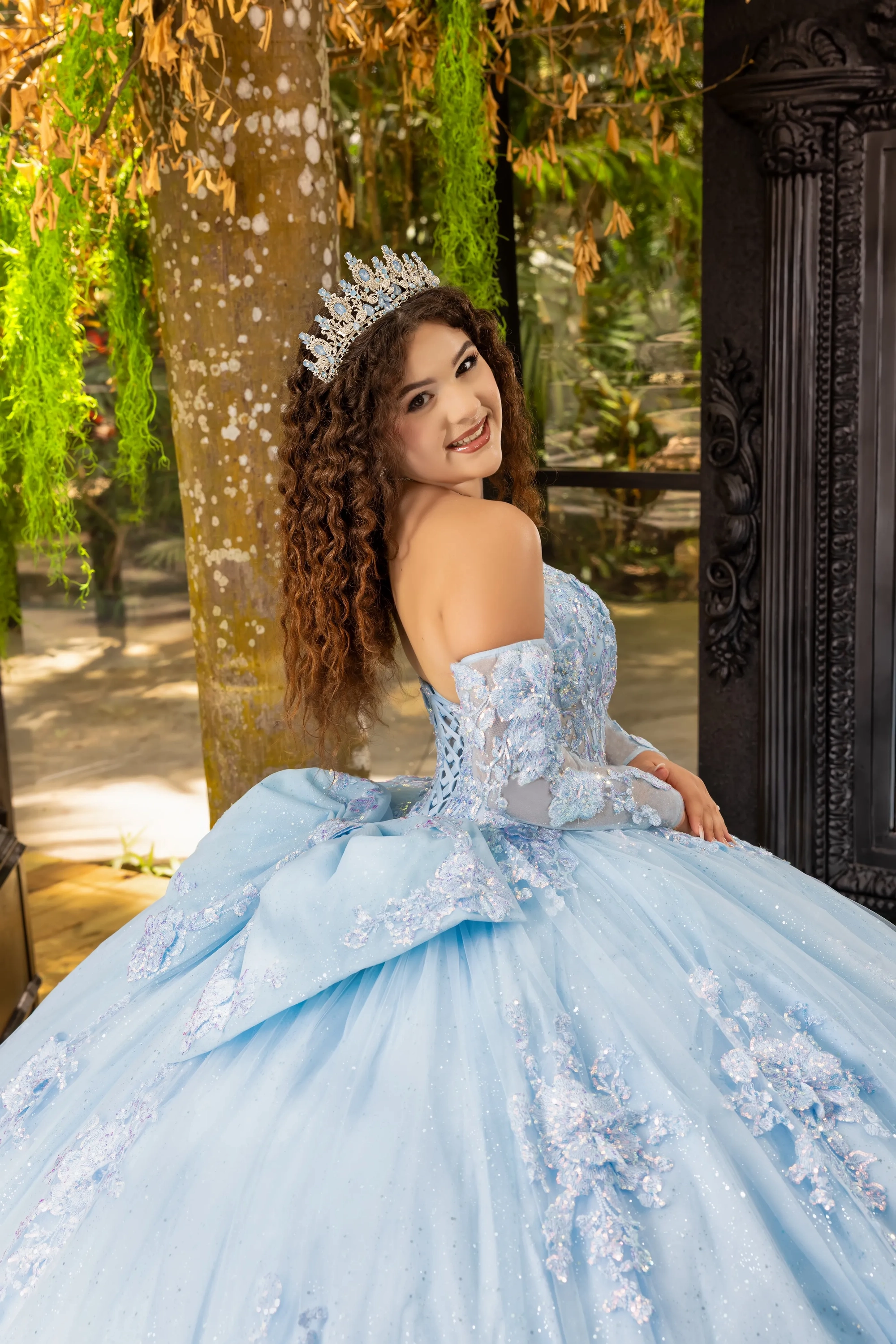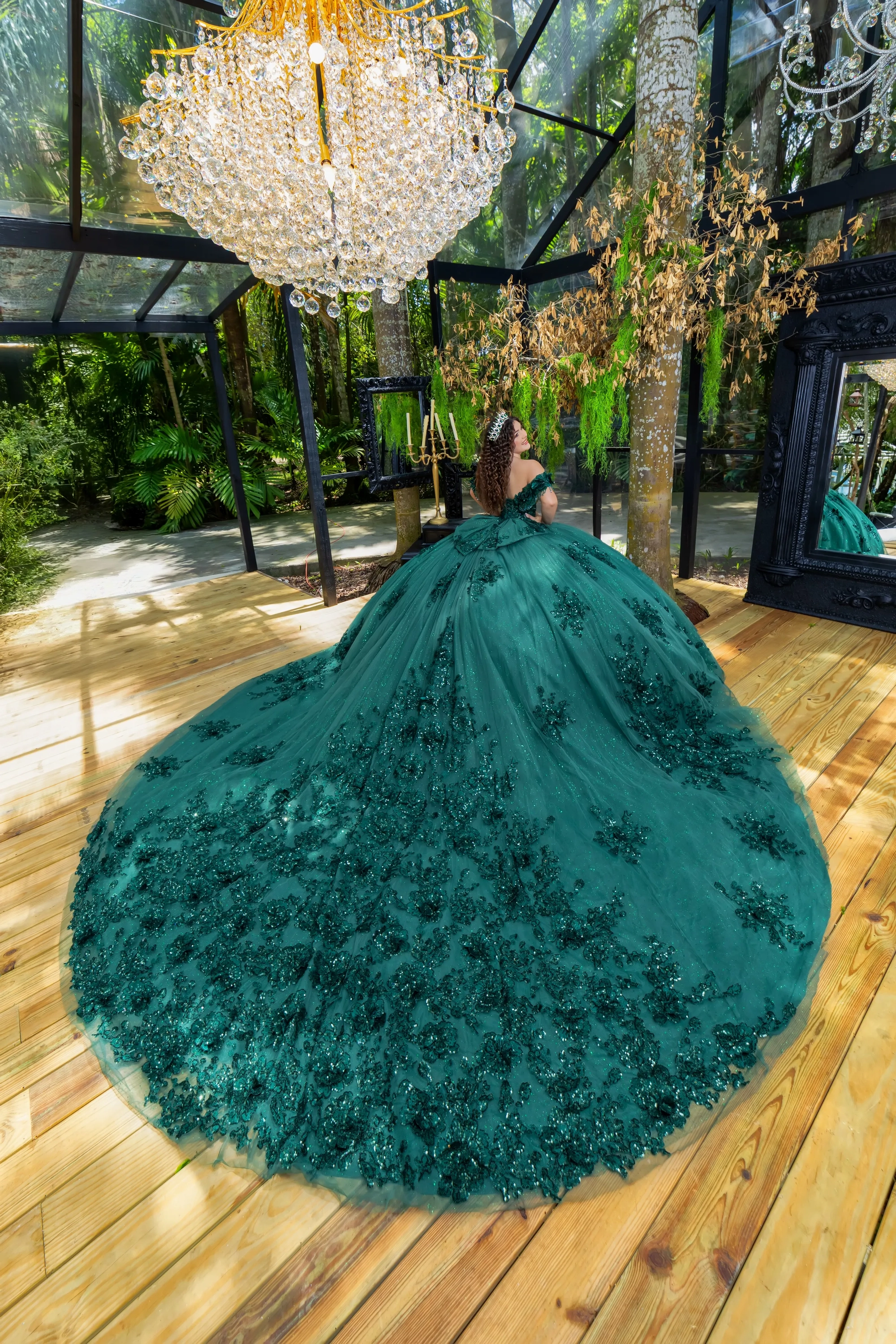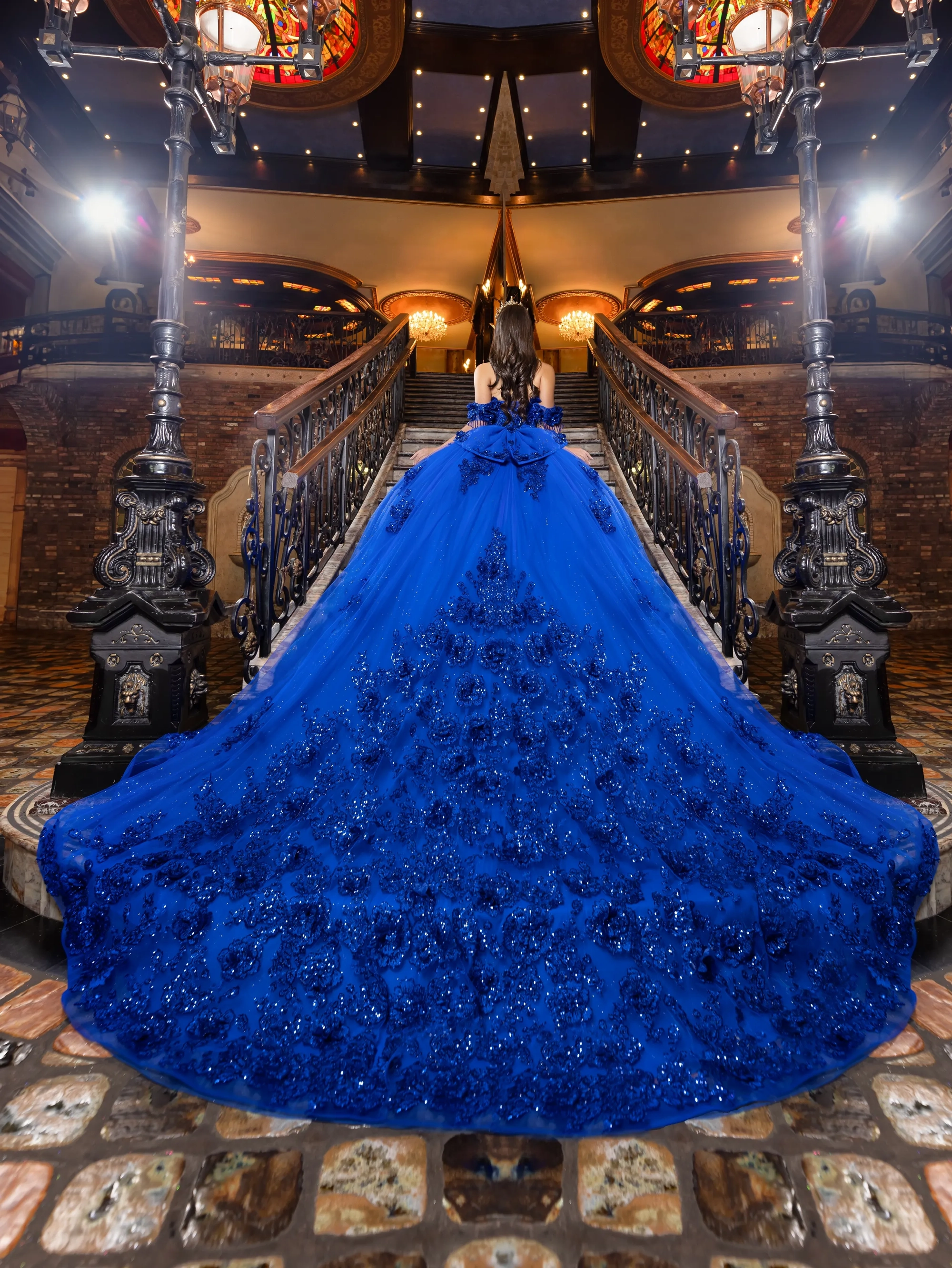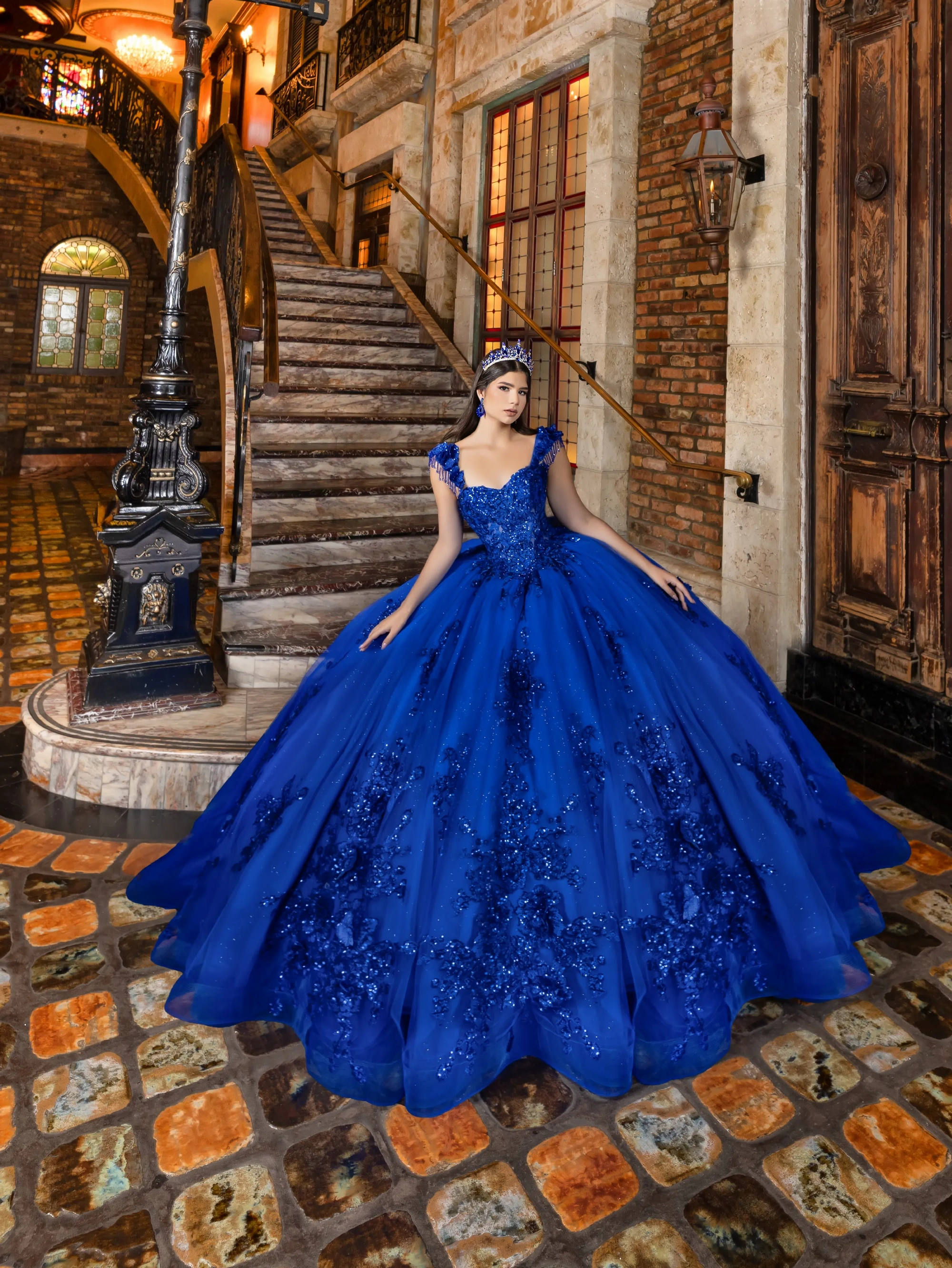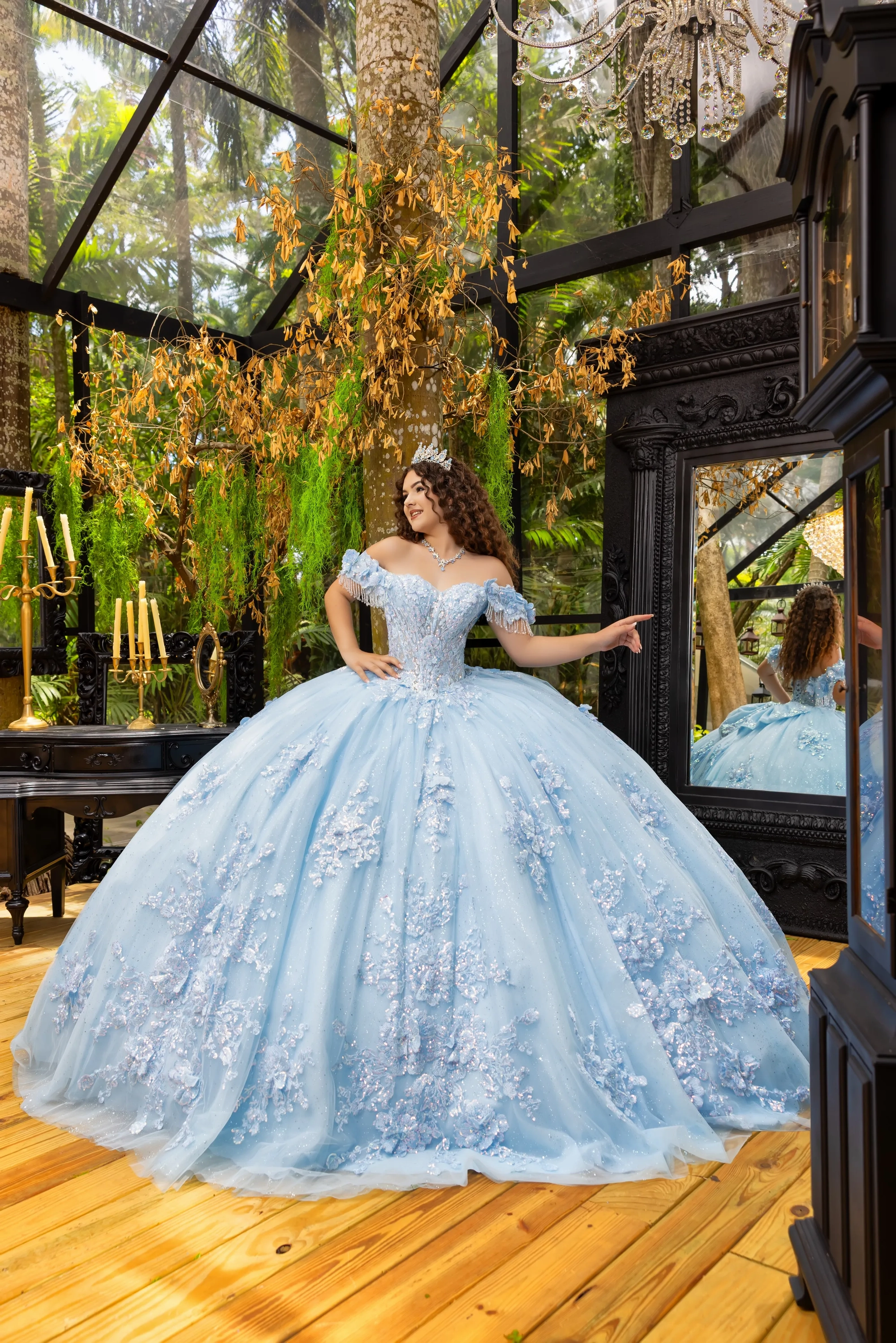 This classic style takes on a modern twist with gorgeous 3D lace applique. The bodice features a soft sweetheart neckline, and off-the-shoulder straps are made to look like flowers. Teardrop beading is added to the shoulder straps for a touch of sparkle. A basque waist accentuates the full princess ball gown skirt. We added sheer tulle fingerless gloves with lace applique for a unique touch. A back bow is added to highlight the long 3D floral train.