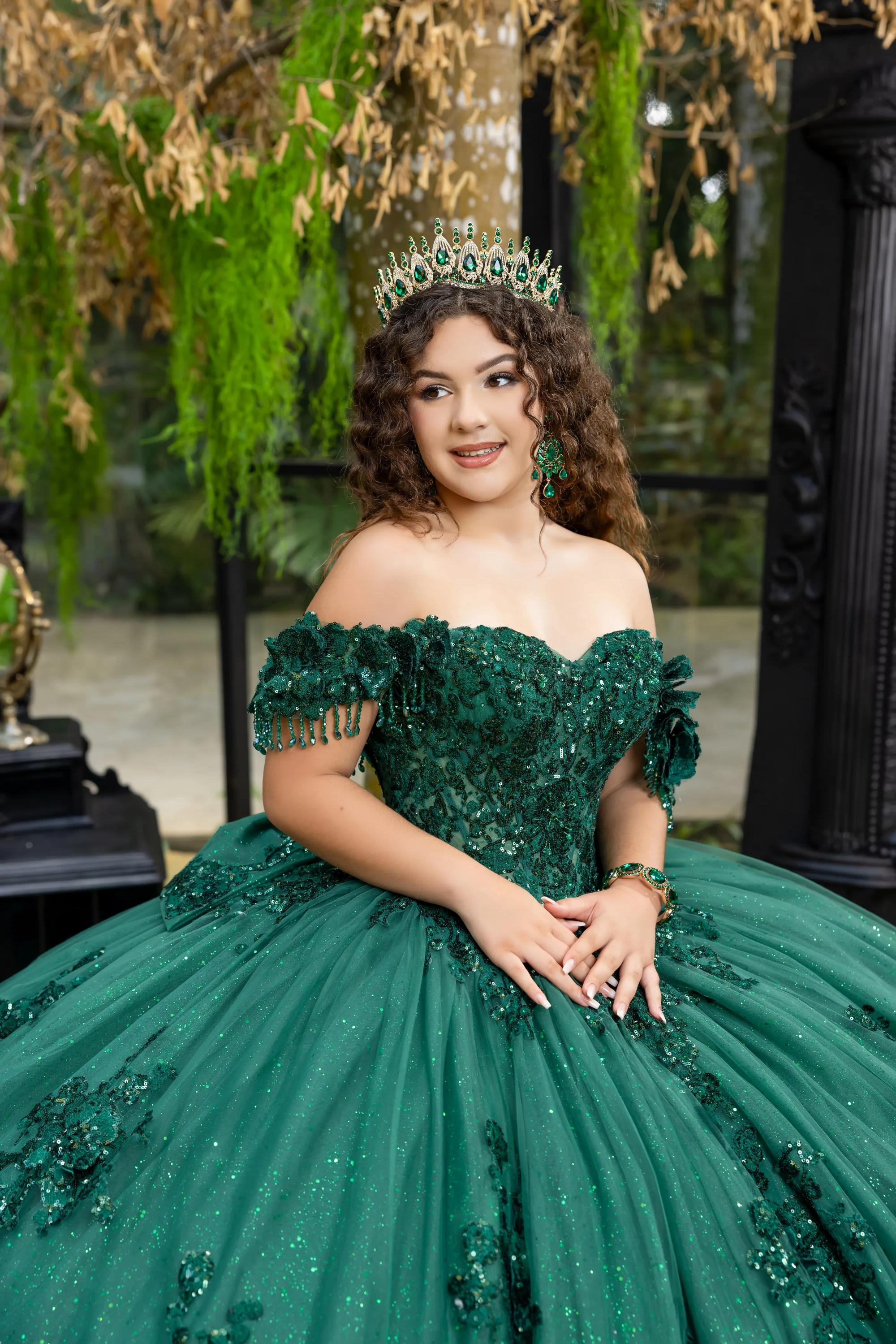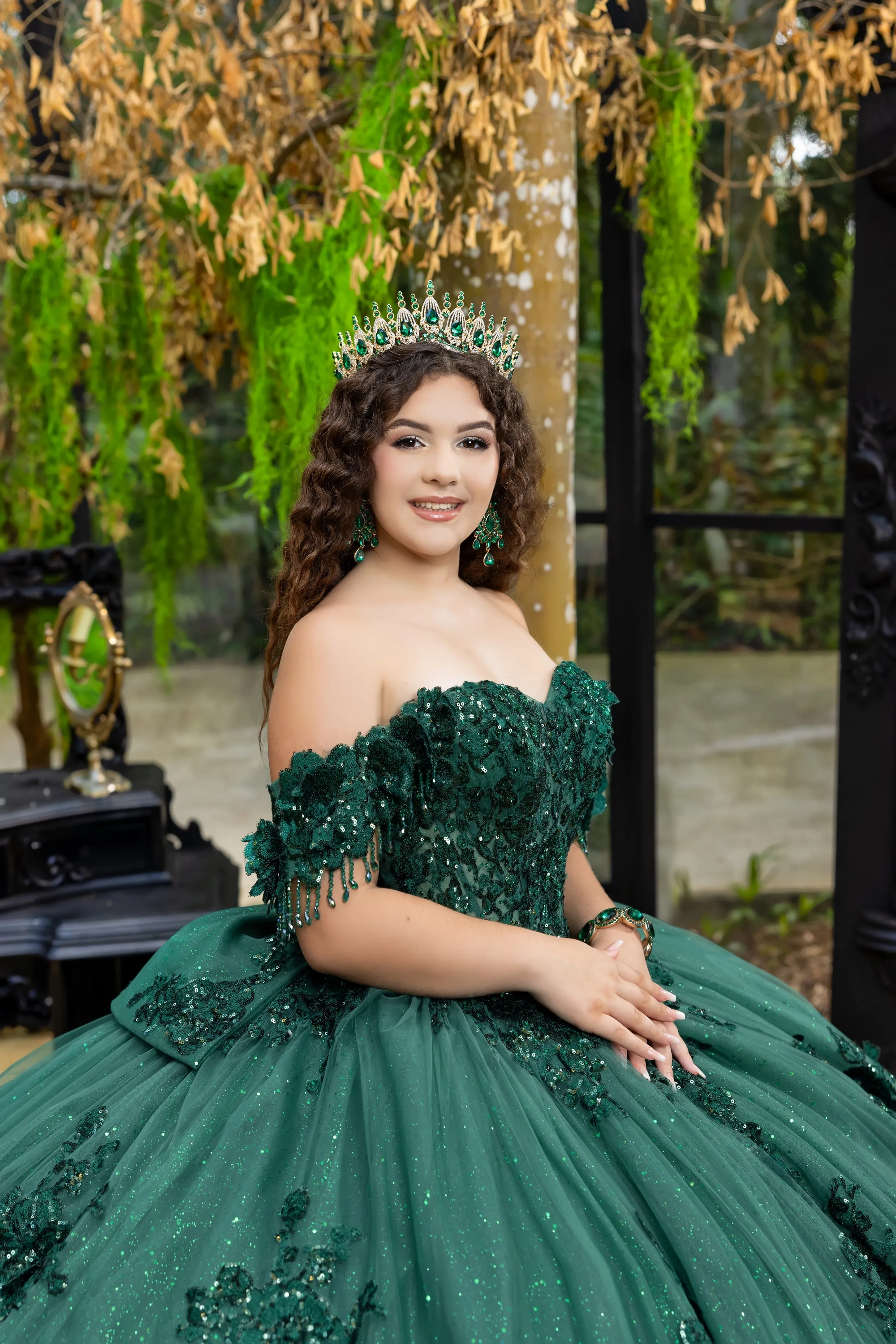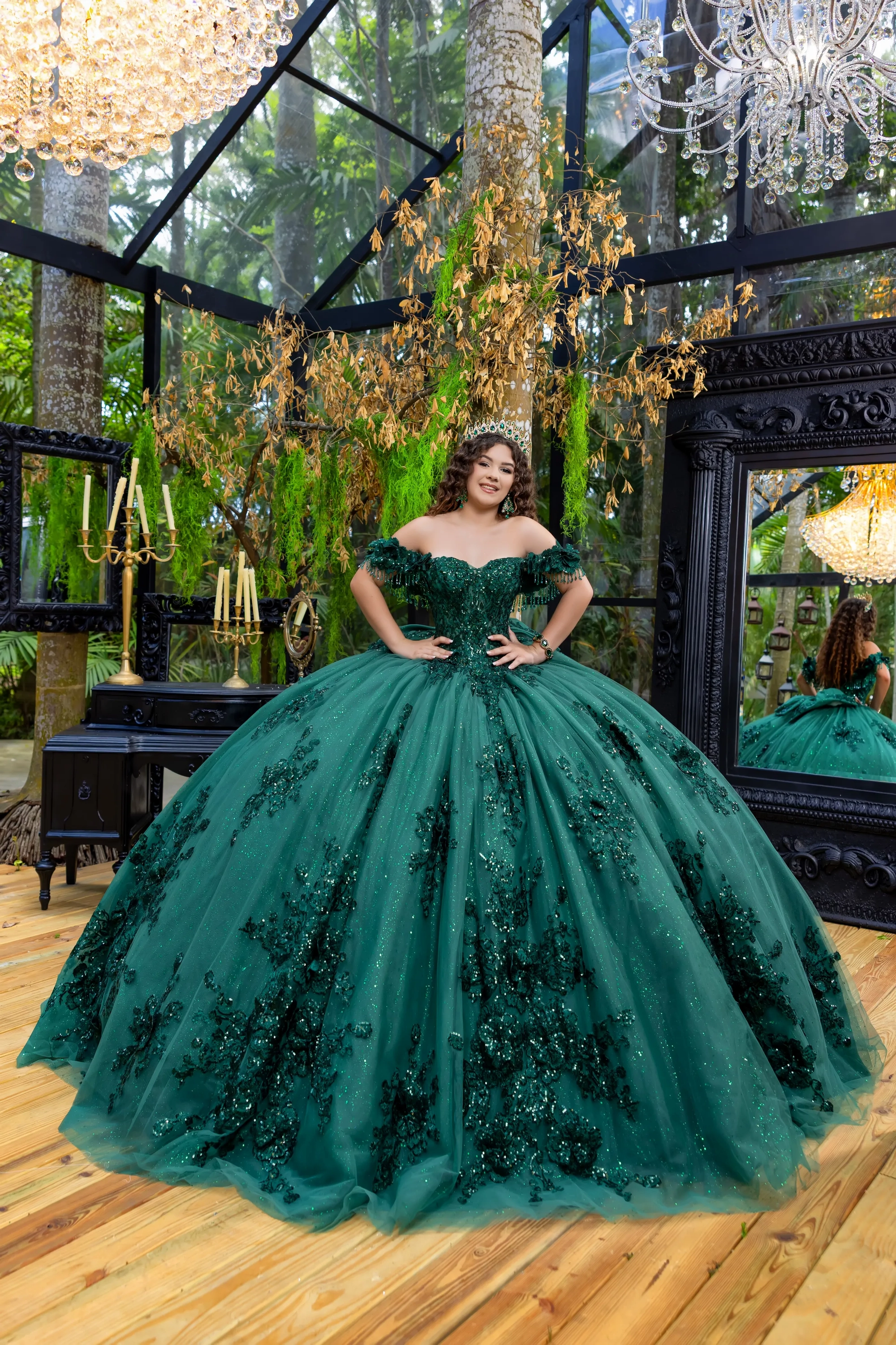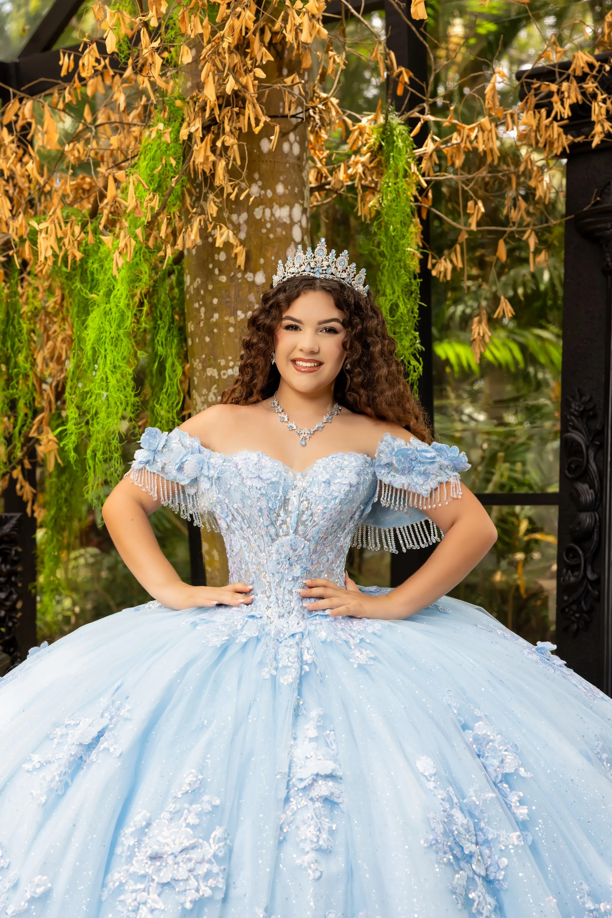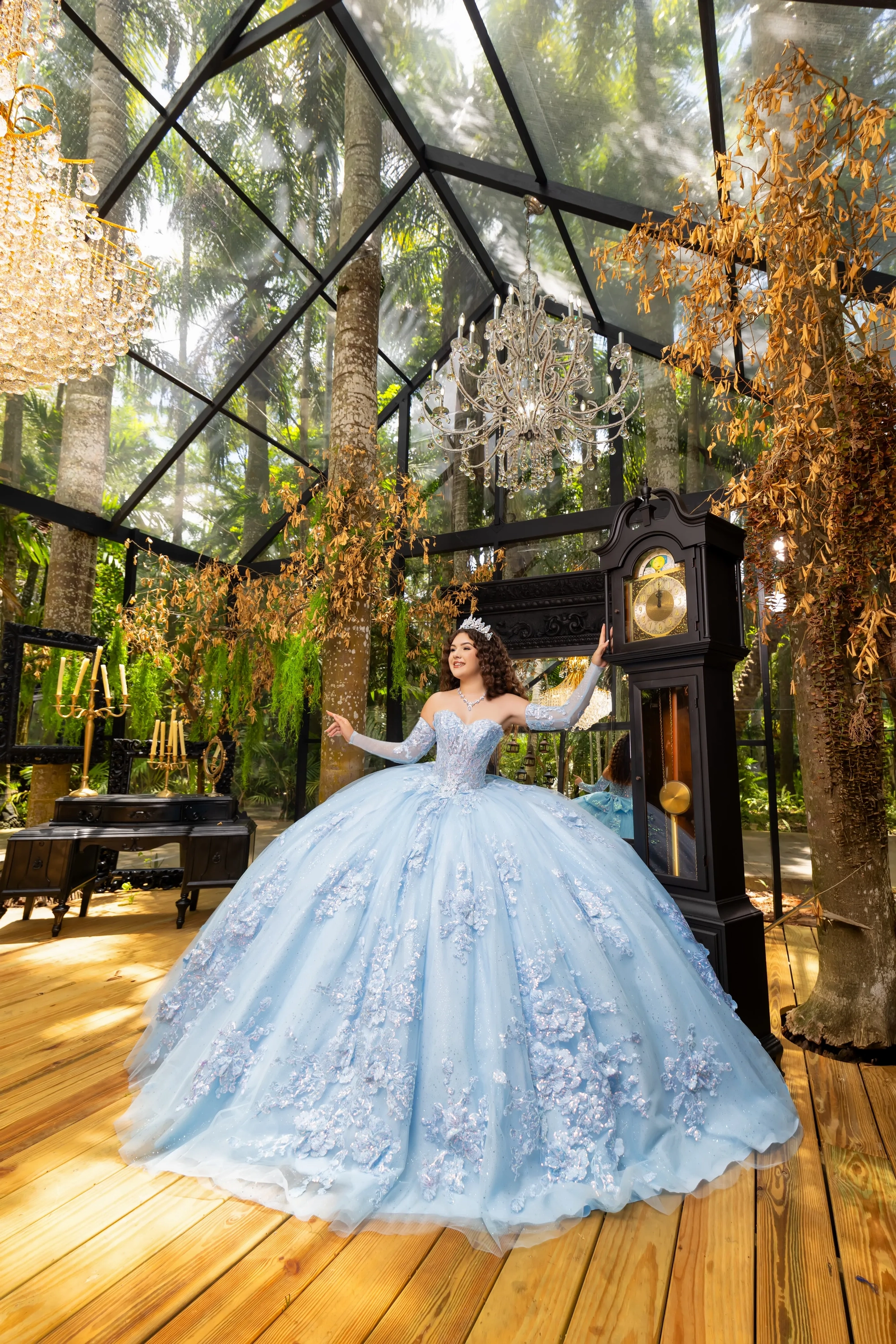 This classic style takes on a modern twist with gorgeous 3D lace applique. The bodice features a soft sweetheart neckline, and off-the-shoulder straps are made to look like flowers. Teardrop beading is added to the shoulder straps for a touch of sparkle. A basque waist accentuates the full princess ball gown skirt. We added sheer tulle fingerless gloves with lace applique for a unique touch. A back bow is added to highlight the long 3D floral train.