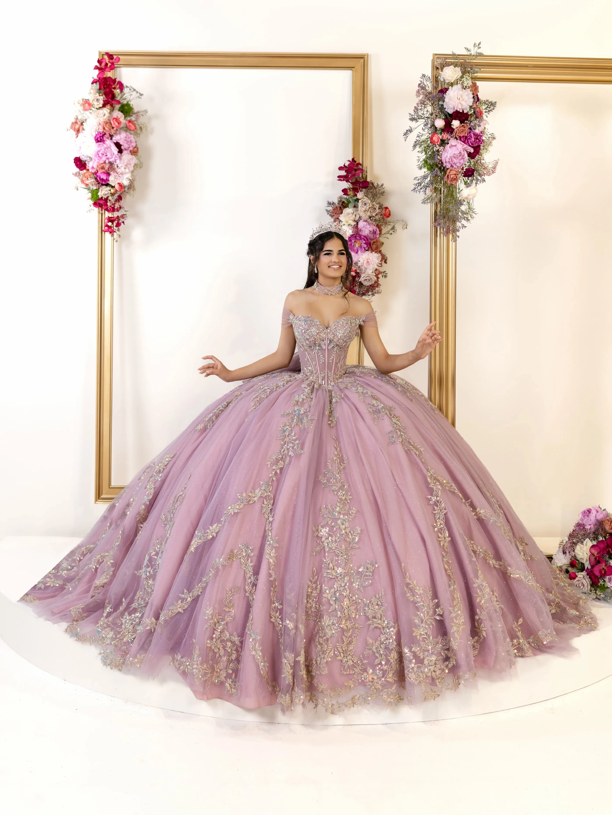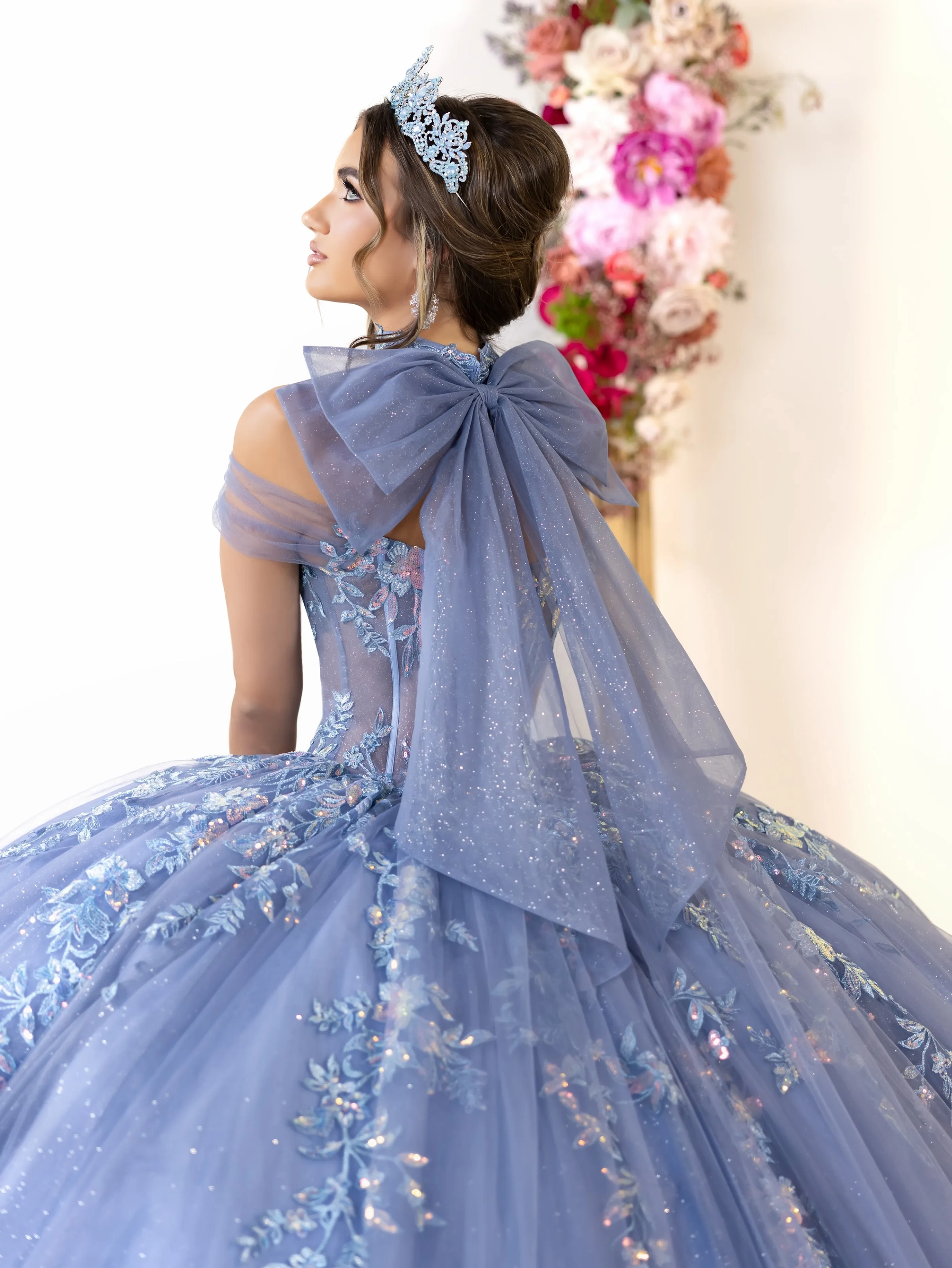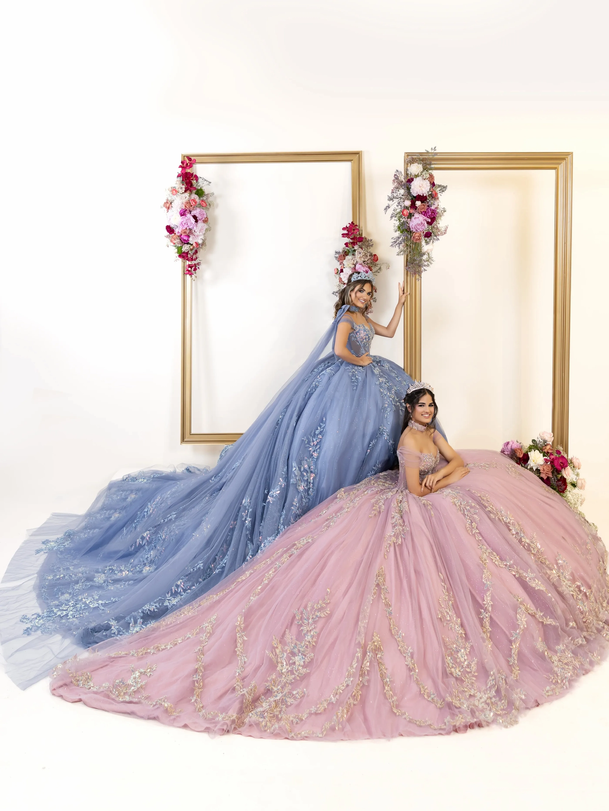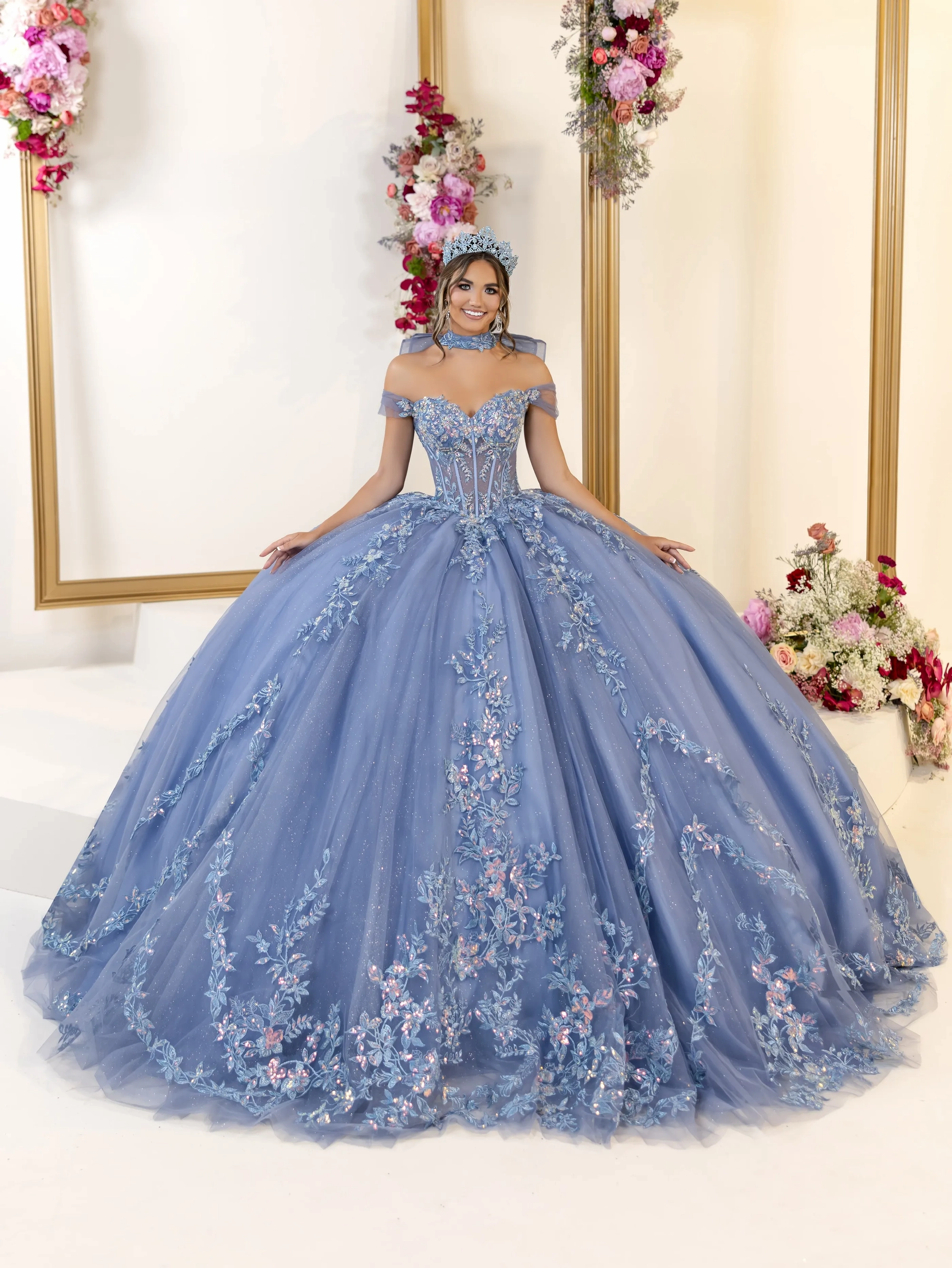 This gown embodies ethereal beauty with its romantic off-the-shoulder sweetheart neckline, softened by delicately ruched tulle and subtle floral appliqués. The fitted bodice features visible boning and a sheer corset structure, creating a modern yet elegant silhouette. The entire front is adorned with cascading 3D floral embroidery in soft pastel tones, blending seamlessly into the voluminous glitter tulle skirt. Sparkling accents scattered throughout the skirt add just the right amount of shimmer for a fairy-tale glow. The back view stuns with a dramatic cathedral-length train, fully enveloped in delicate floral appliqué trails that flow in graceful, vine-like patterns. A soft tulle bow at the neckline drapes down the back, adding a whimsical, graceful finish. The corset lacing detail ensures a perfect fit and carries the romantic floral design all the way through. Light catches the glitter tulle beautifully as it fans out behind the wearer.