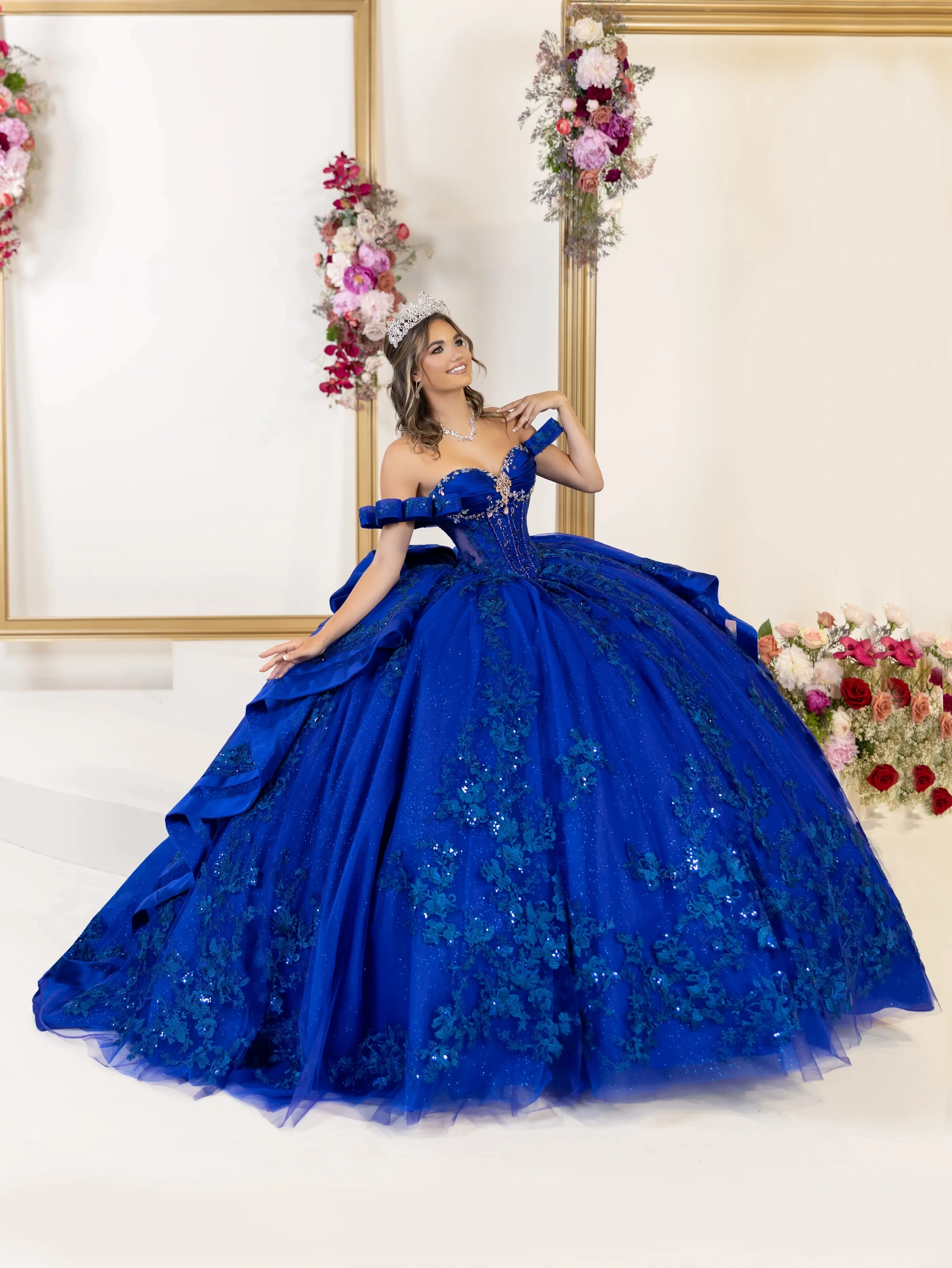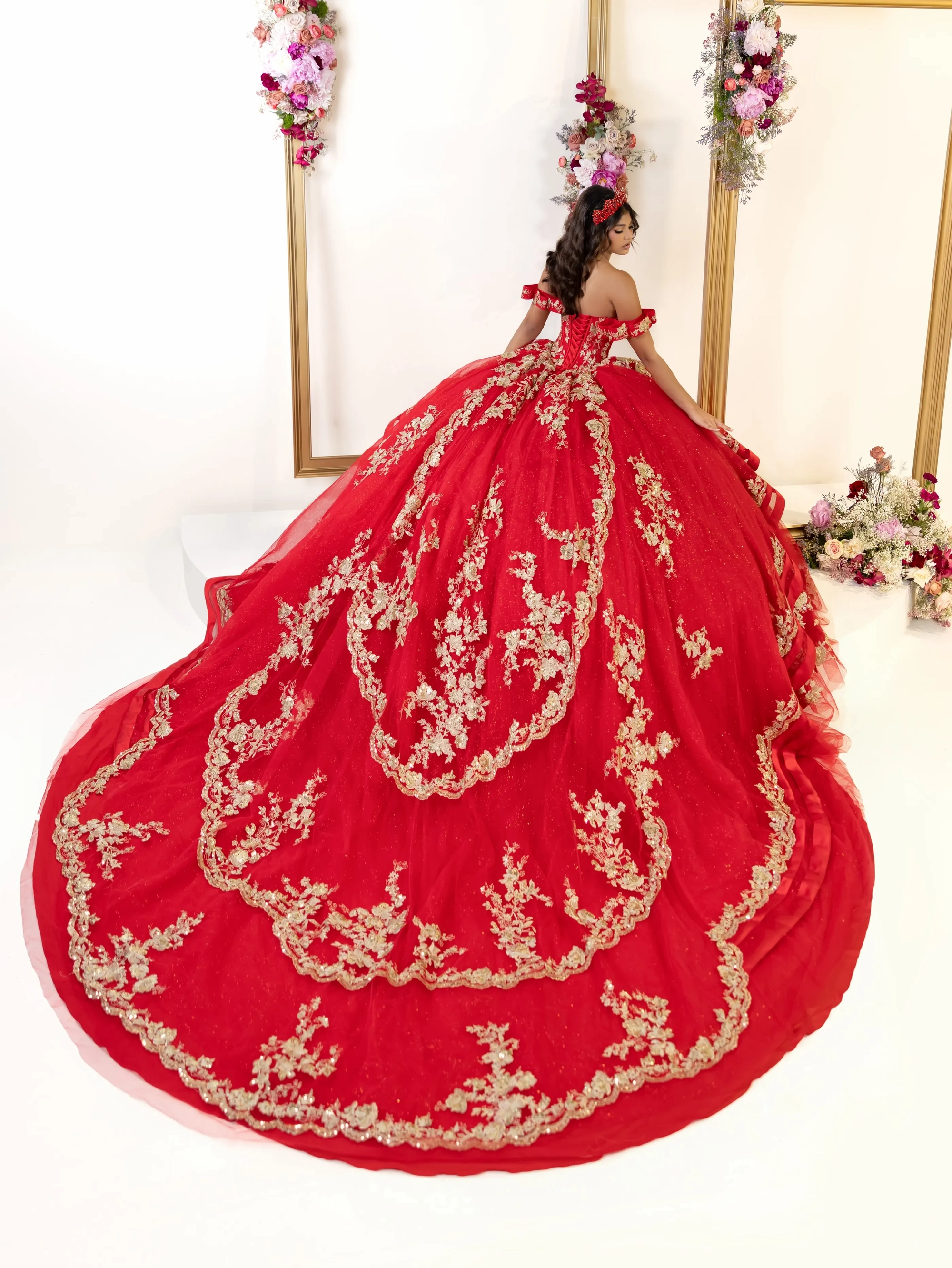This gown captivates with its romantic off-the-shoulder neckline, featuring delicate ruffle-trimmed straps and a beautifully structured bodice. The corset-style top is richly adorned with gold floral embroidery, sequins, and beadwork, forming a regal pattern that tapers toward the waist. A voluminous skirt, layered in glittering tulle, erupts from the fitted bodice, continuing the gold floral embroidery in lavish abundance across the front. The gown exudes opulence, charm, and fairy-tale magic. The back of the gown is equally dramatic, boasting a cascading layered train outlined in ornate gold embroidery that mirrors the floral patterns of the front. The embroidery flows in scalloped, symmetrical tiers that create depth and visual grandeur. The bodice continues the lace detailing up the back with a subtle yet structured fit, maintaining a seamless silhouette from top to bottom. It’s a showstopping, 360-degree masterpiece designed to dazzle at every turn.