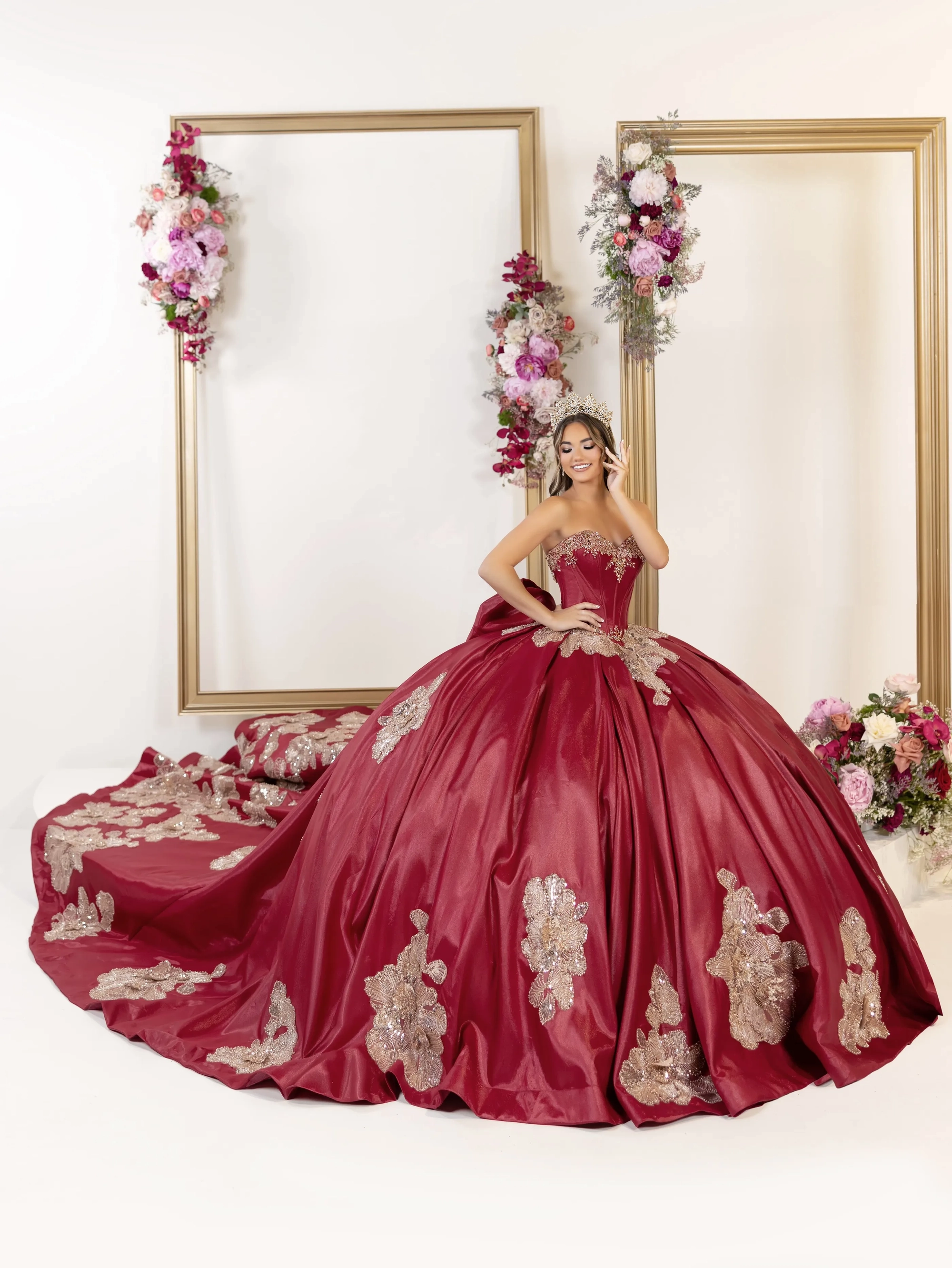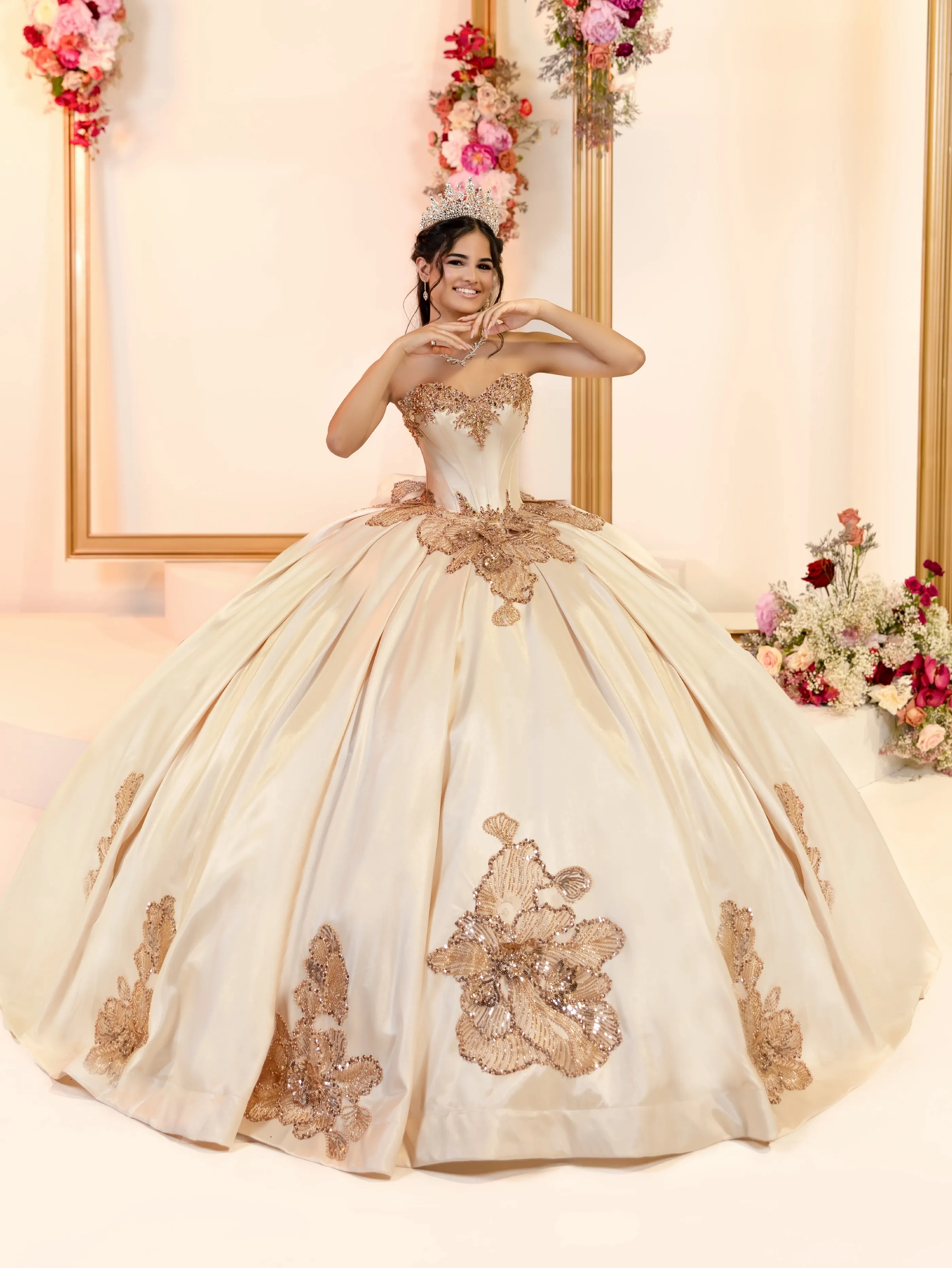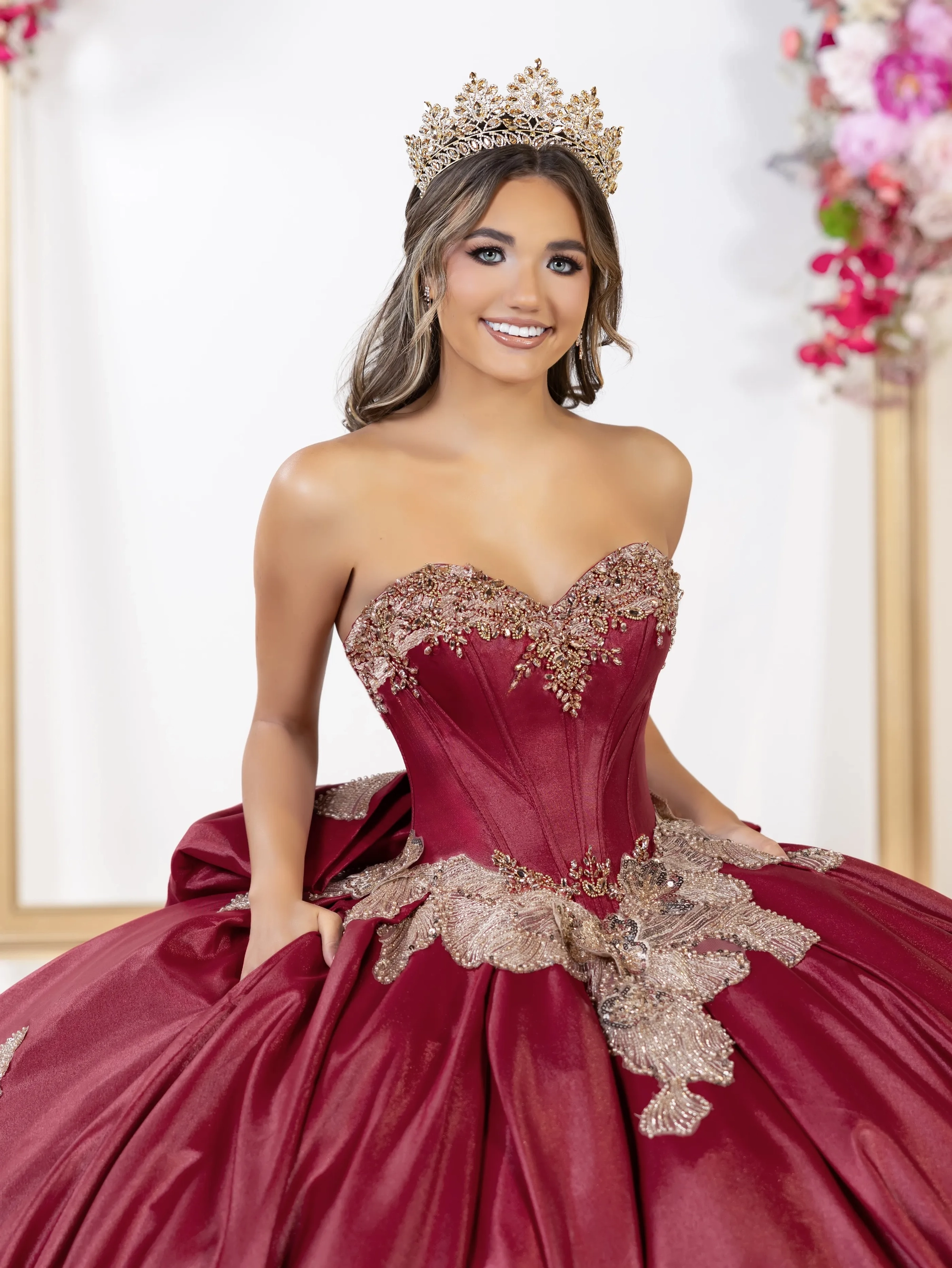 Strapless sweetheart bodice adorned with intricate gold lace appliques delicately frames the neckline. The skirt itself features scattered gold floral appliques adding a regal contrast against the rich fabric for this semi-cathedral train ball gown.