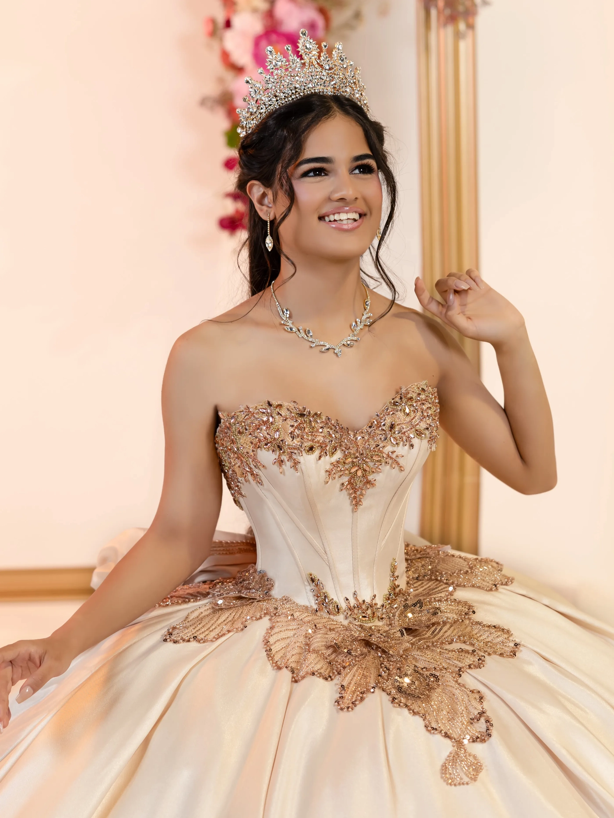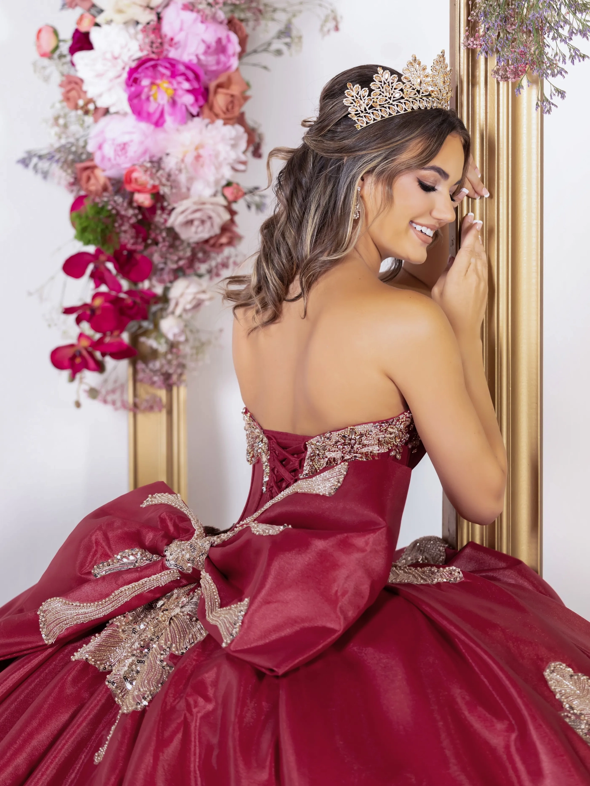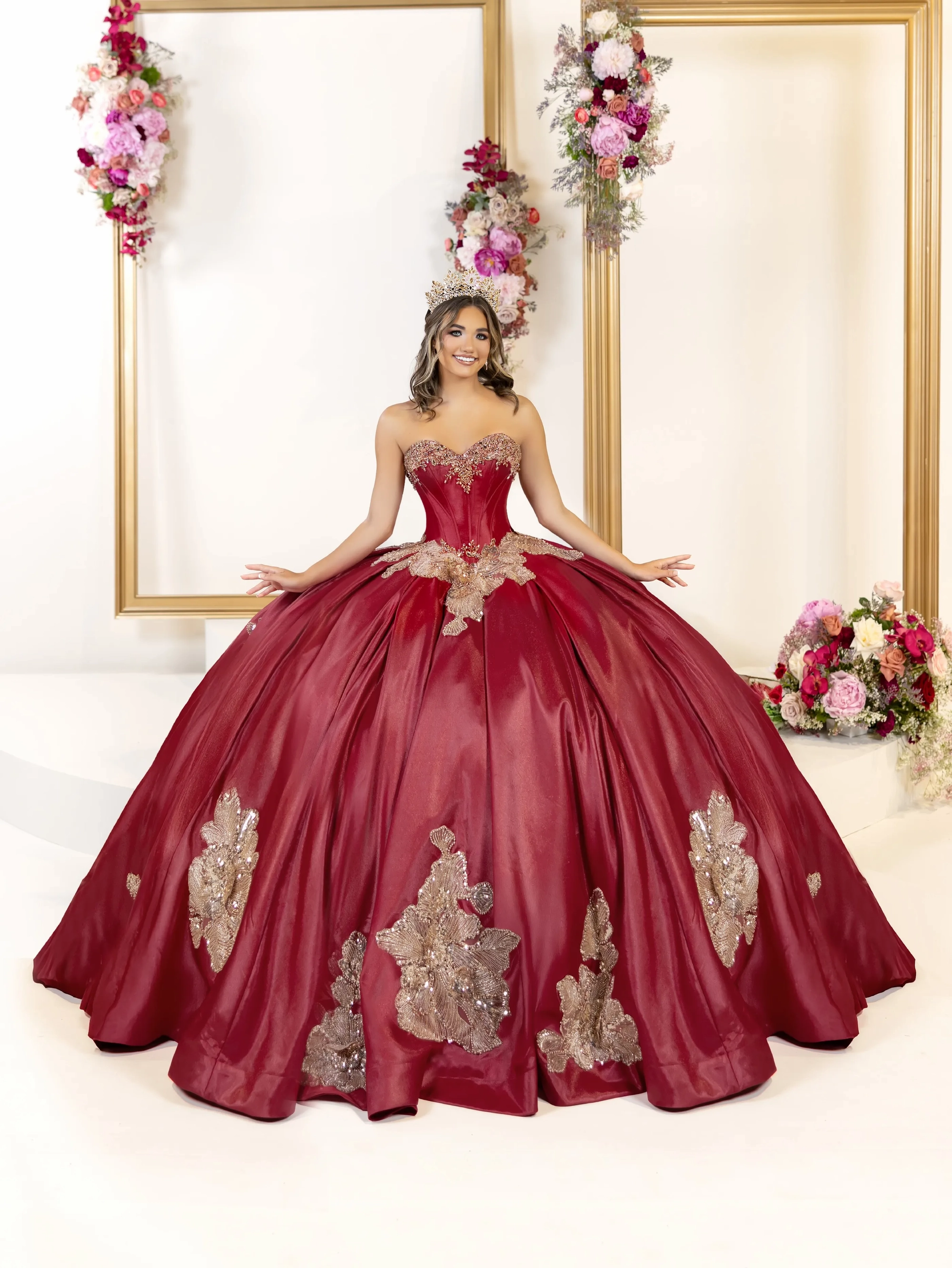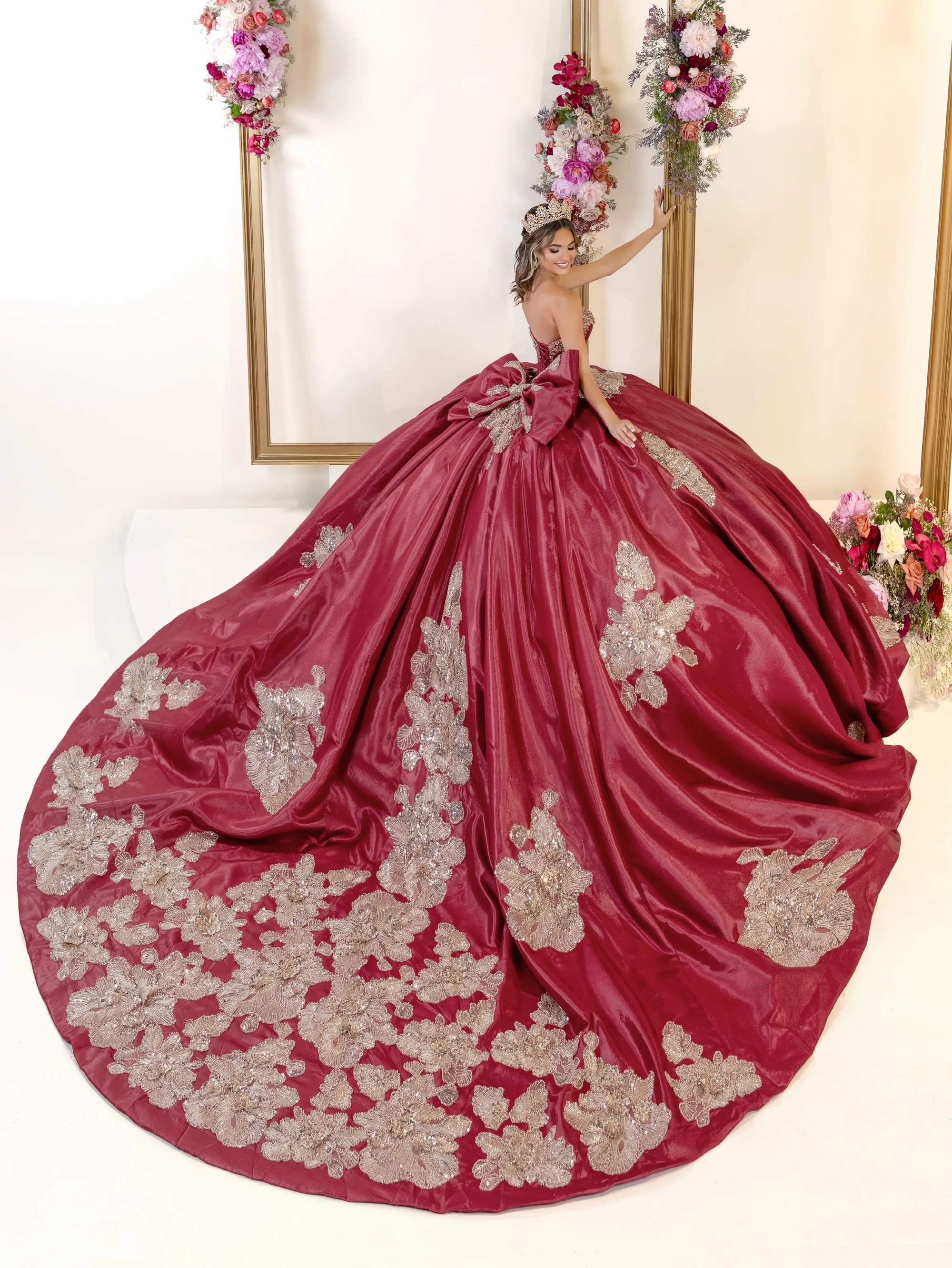 Strapless sweetheart bodice adorned with intricate gold lace appliques delicately frames the neckline. The skirt itself features scattered gold floral appliques adding a regal contrast against the rich fabric for this semi-cathedral train ball gown.