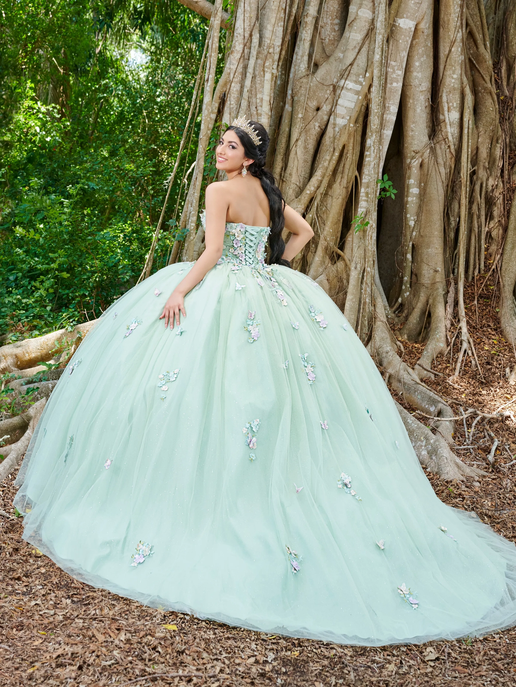 Fairytale quinceanera ball gown has a softly draped, sweetheart bodice adorned with delicate three-dimensional floral appliqués that cascade down the glitter tulle skirt. Have fun with detachable princess sleeves that can be set on or off-the-shoulder.