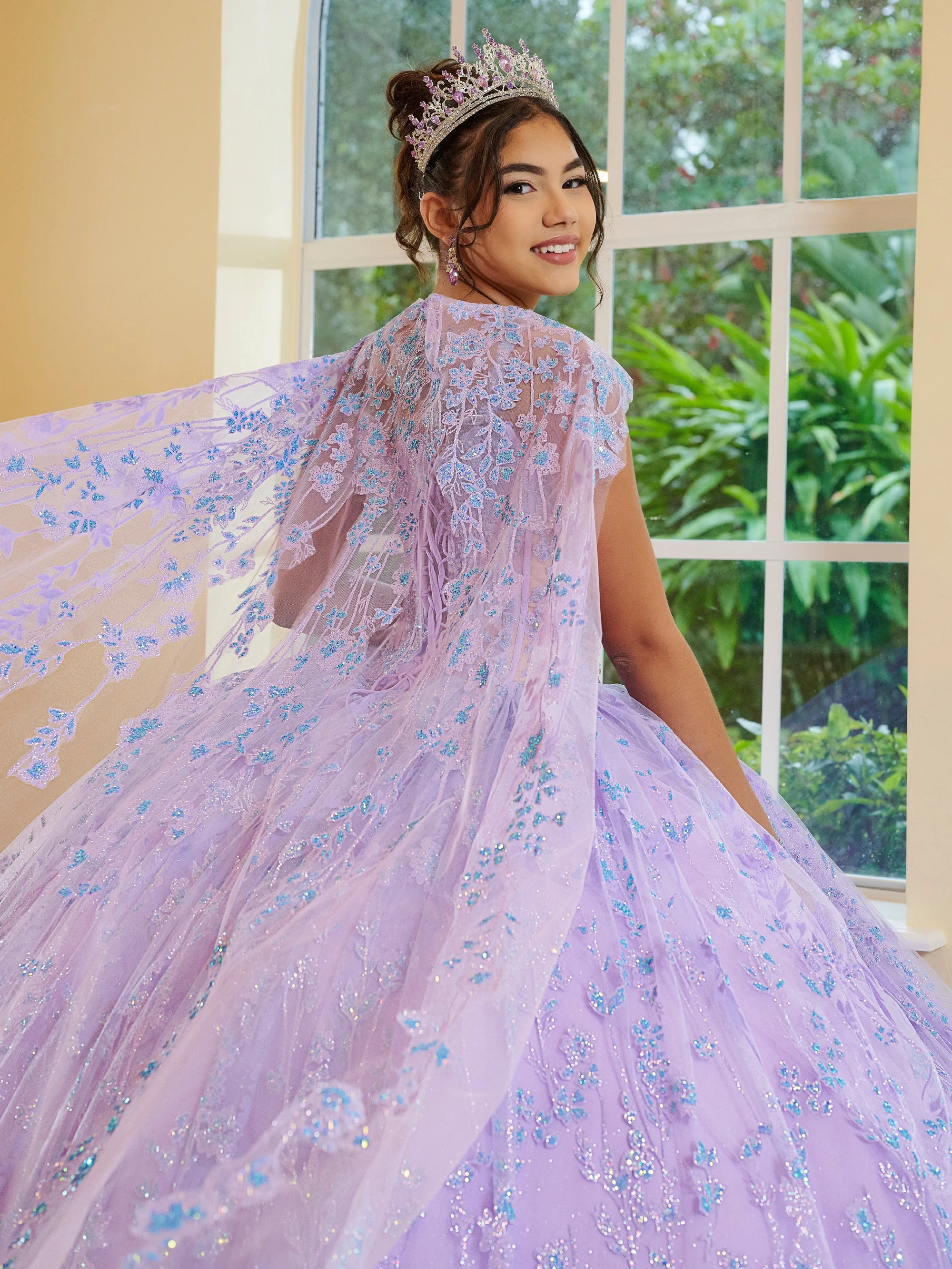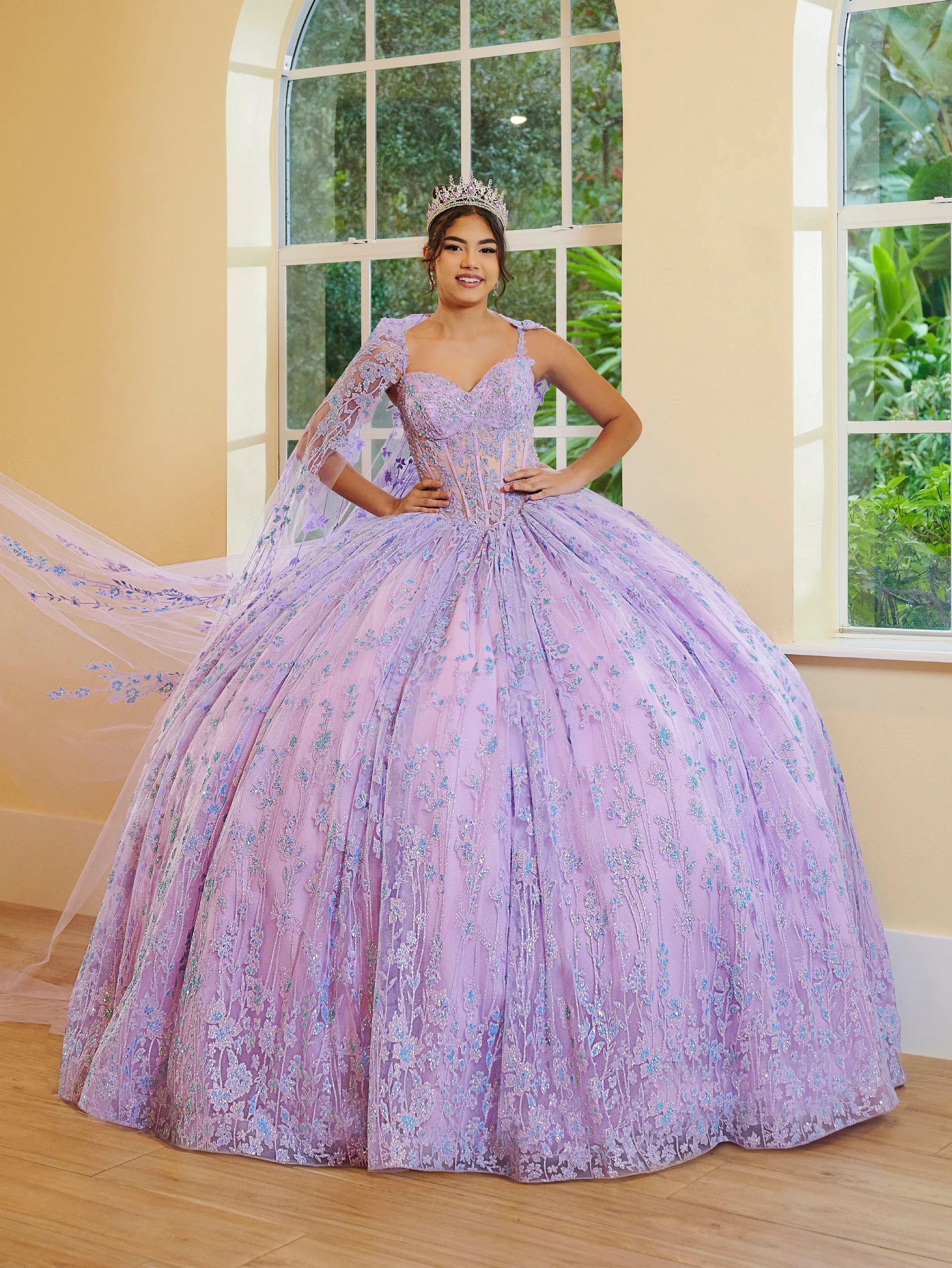 This sweet quinceanera ball gown features a modern corseted bodice with satin boning over sheer tulle. Three-dimensional flower applicants are added to create a fairy garden moment. The gown features a sweetheart neckline, delicate straps, and a detachable cape. A full skirt completes this look.