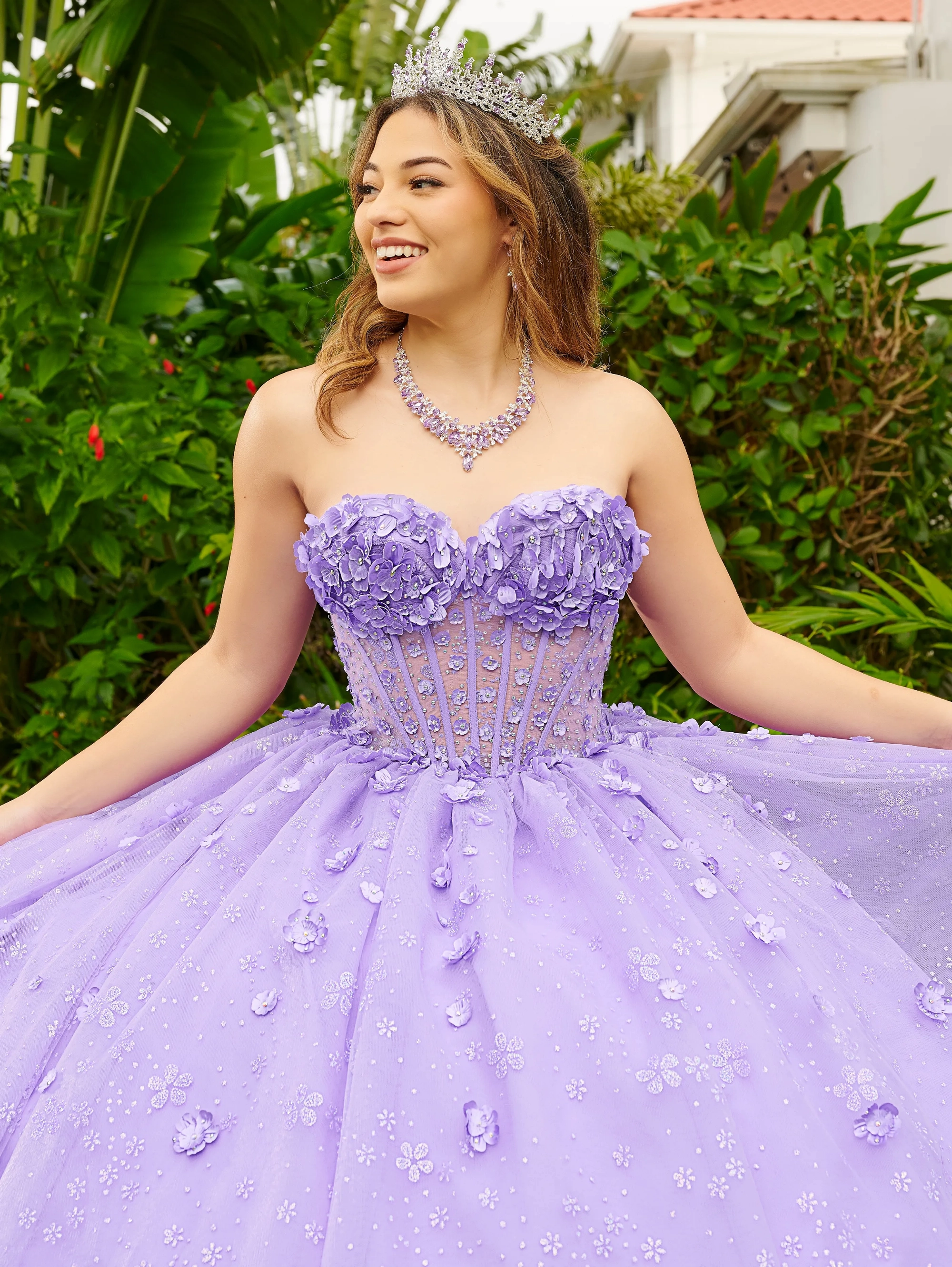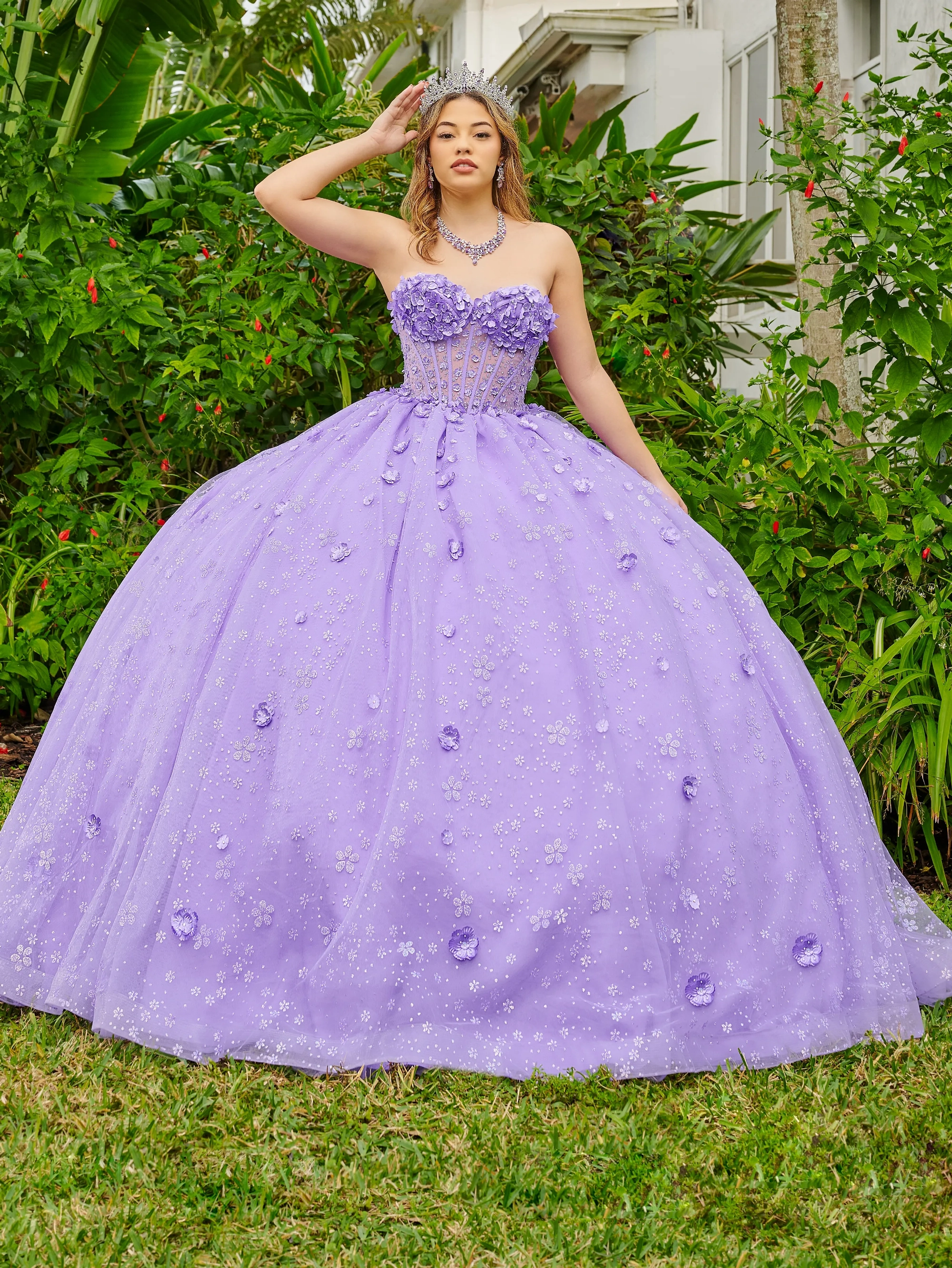 Inspired by our secret garden, this 3-dimensional floral gown features cascading flowers that are perfect for your Quinceanera Party. The dress has a sheer, corseted bodice adorned with delicate flower appliqués. The gorgeous full skirt showcases hand-placed flowers to add a personal touch.