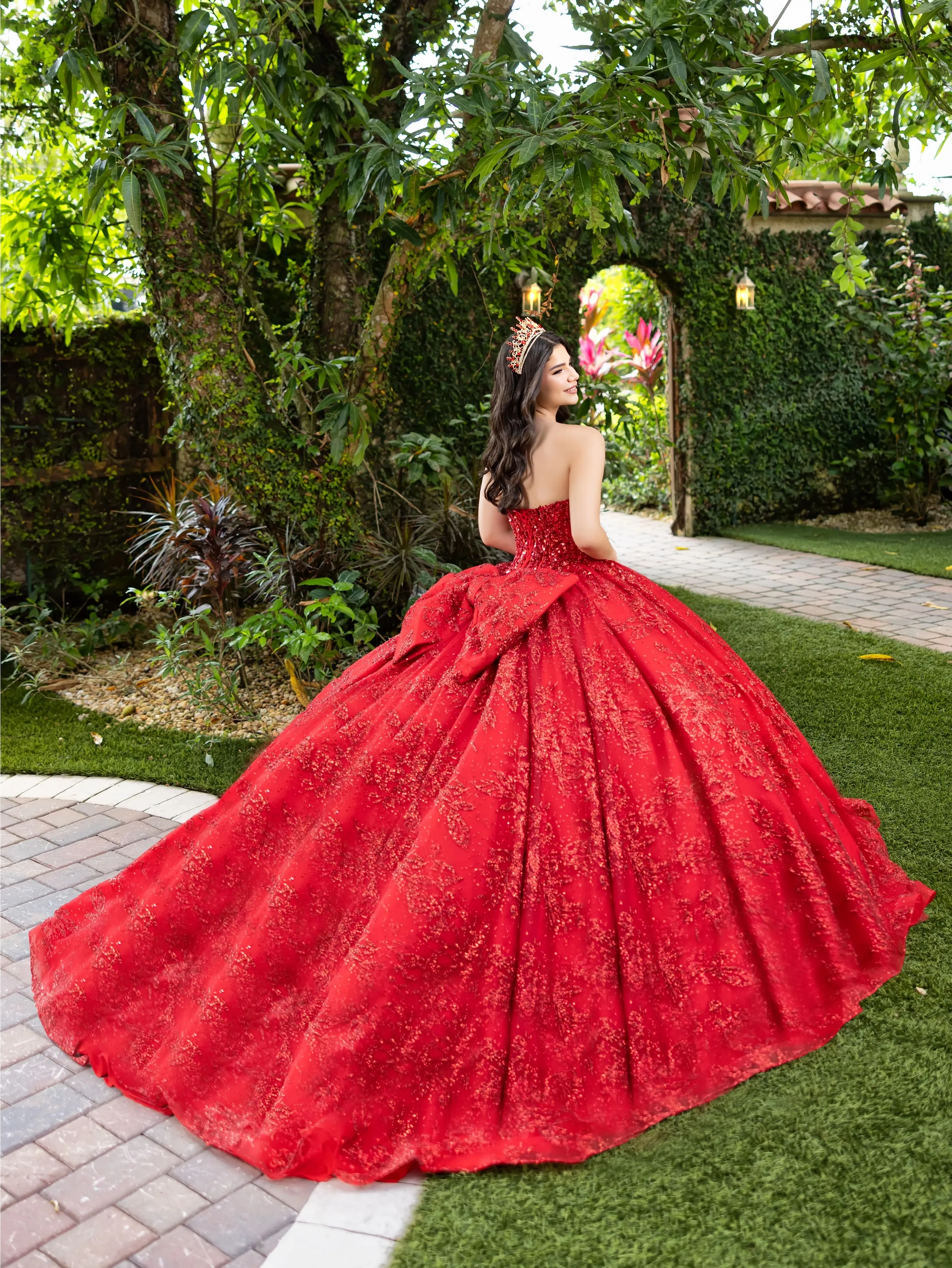 This classic sweet neckline Quinceanera ball gown features the ultimate sparkle moment. Glitter lace applique takes over the entire gown to make a glistening statement. A gorgeous bow is added to complete this look.
