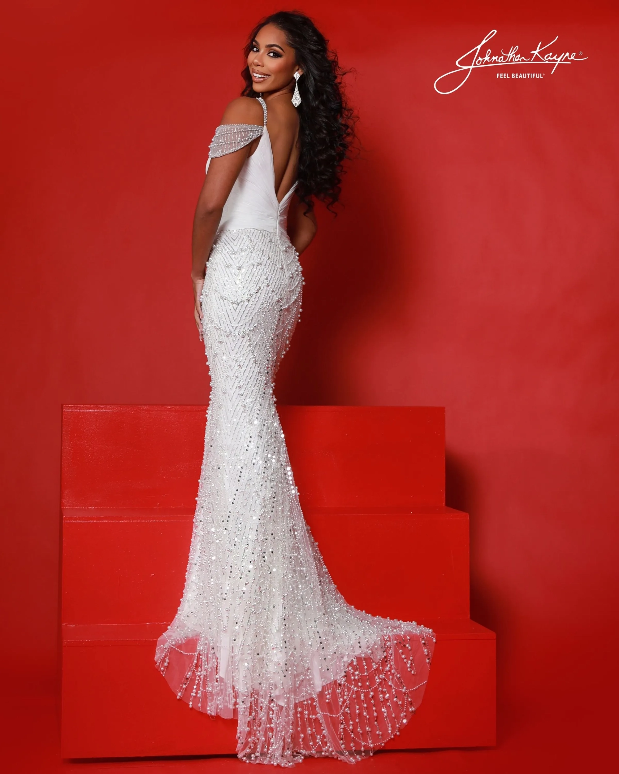 Radiate elegance in this beaded gown with a detachable chiffon cape. The fitted bodice, pearl and crystal beaded mesh, and flowing cape deliver drama for teen pageants or bridal inspired moments.