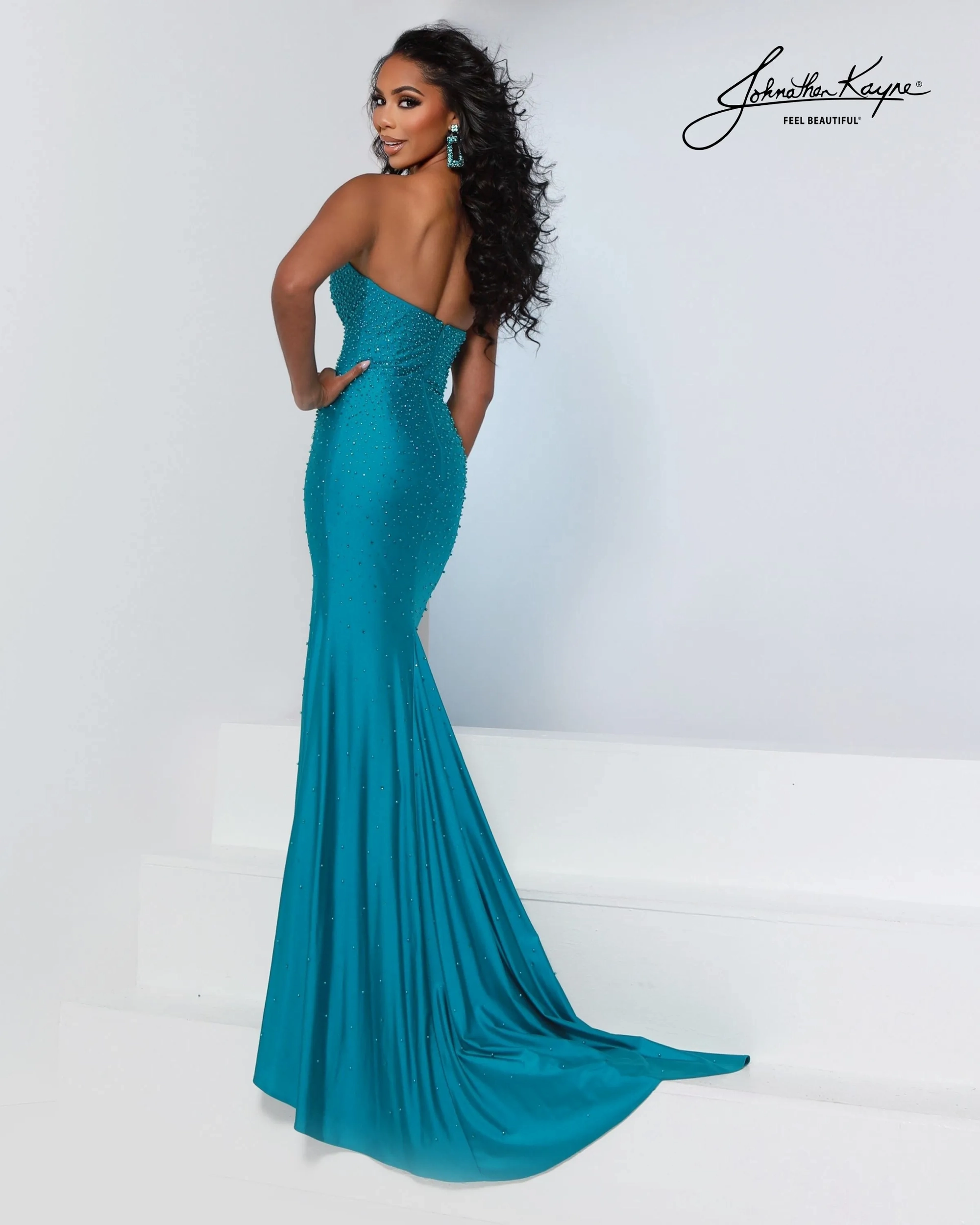 Strike a balance between bold and refined in this fitted stretch lycra gown adorned with pearls and crystals. The asymmetrical strapless neckline and thigh-high slit create a striking modern shape, while the sweep train flows effortlessly. Perfect for prom nights and the pageant stage.