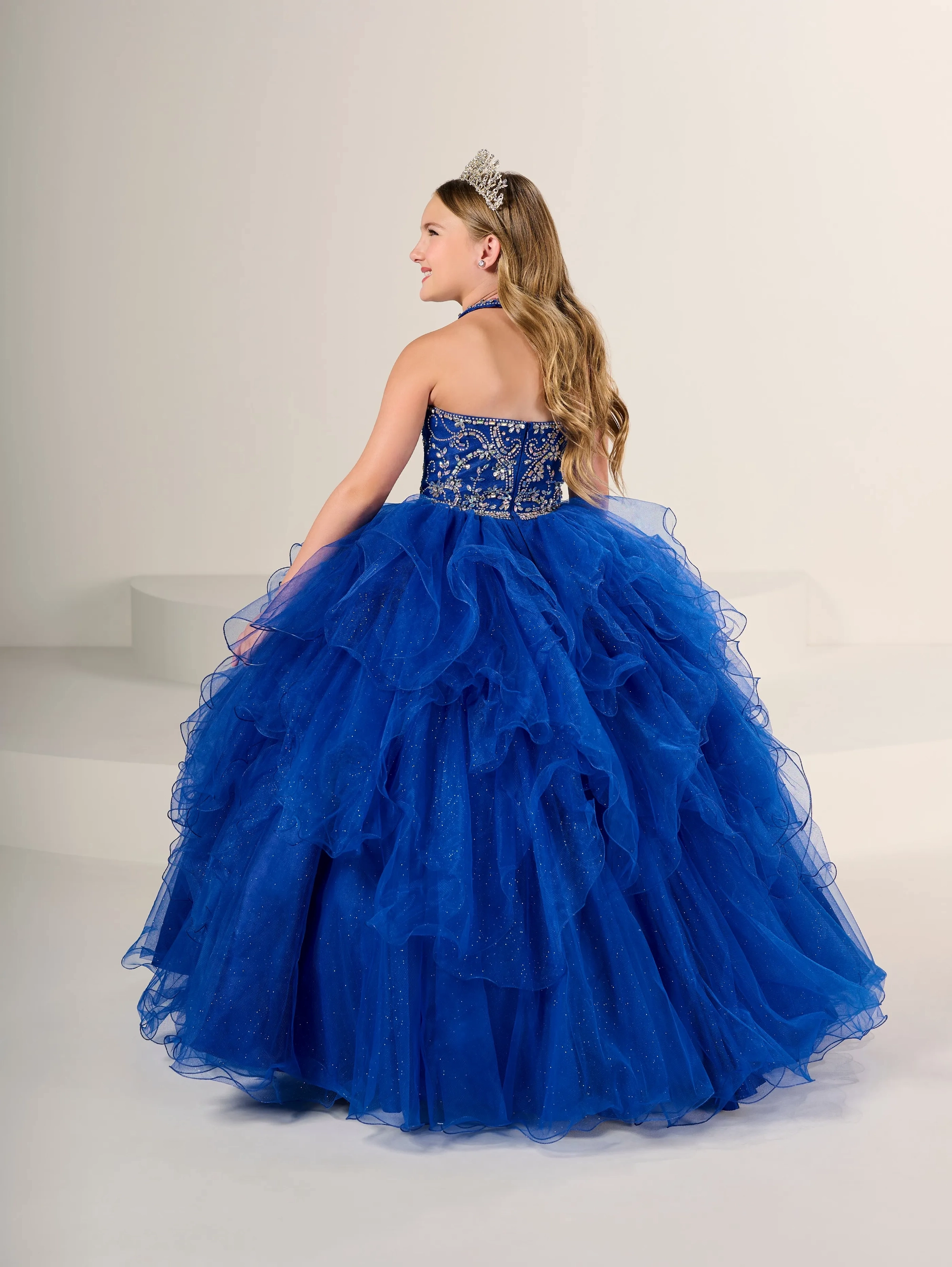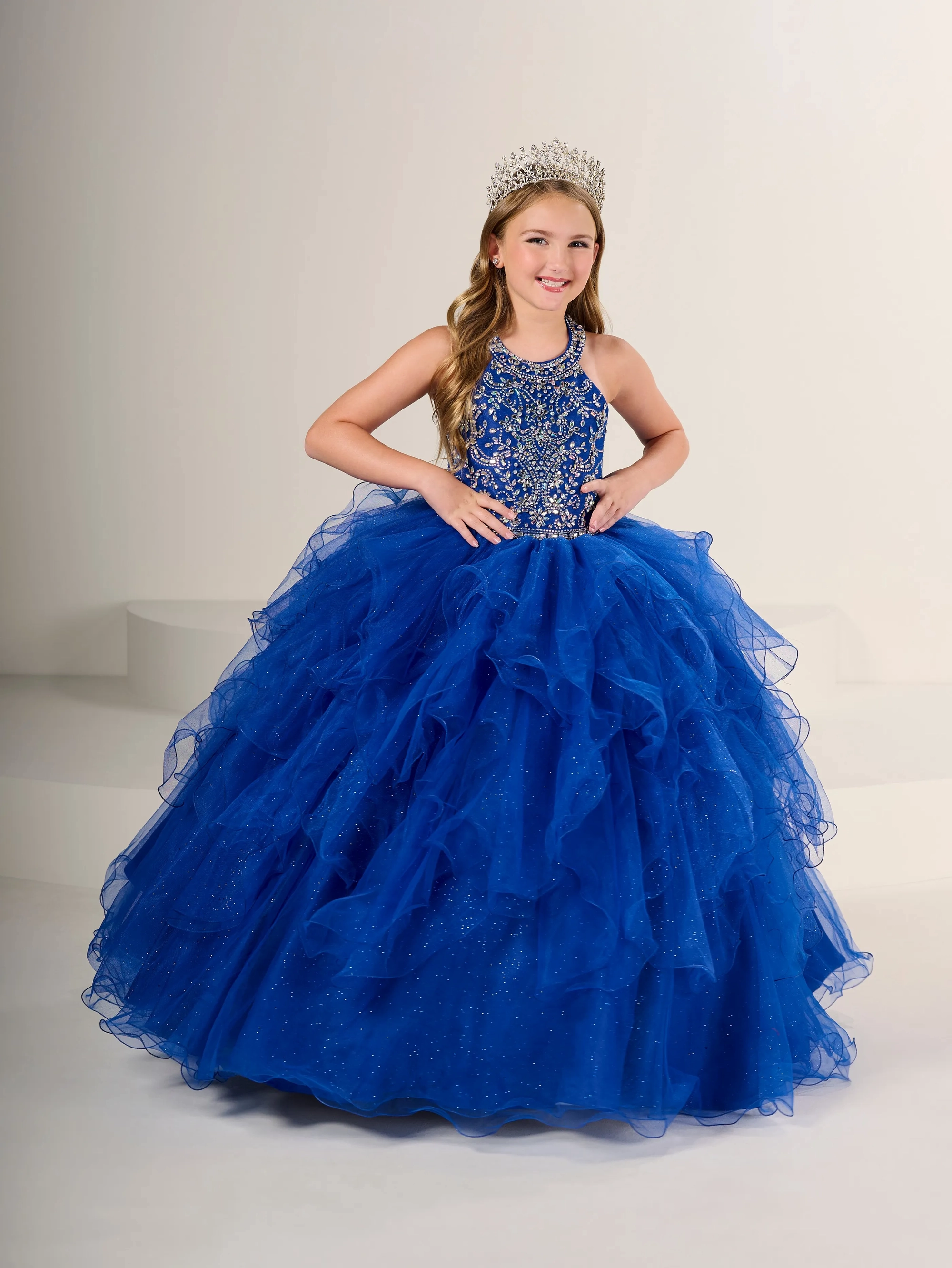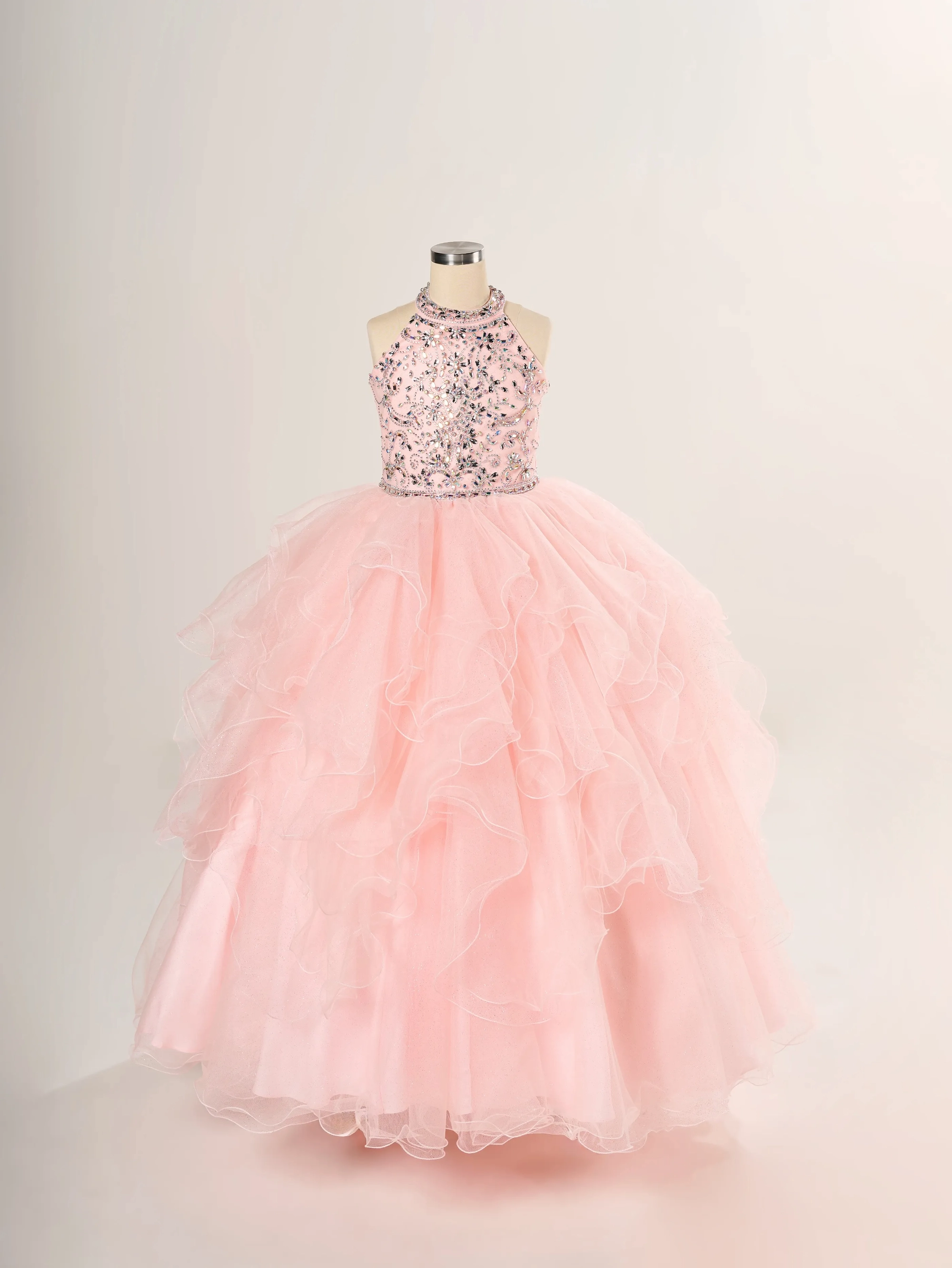 Stunning baroque beading on this halter gown with layered handkerchief tulle skirt.